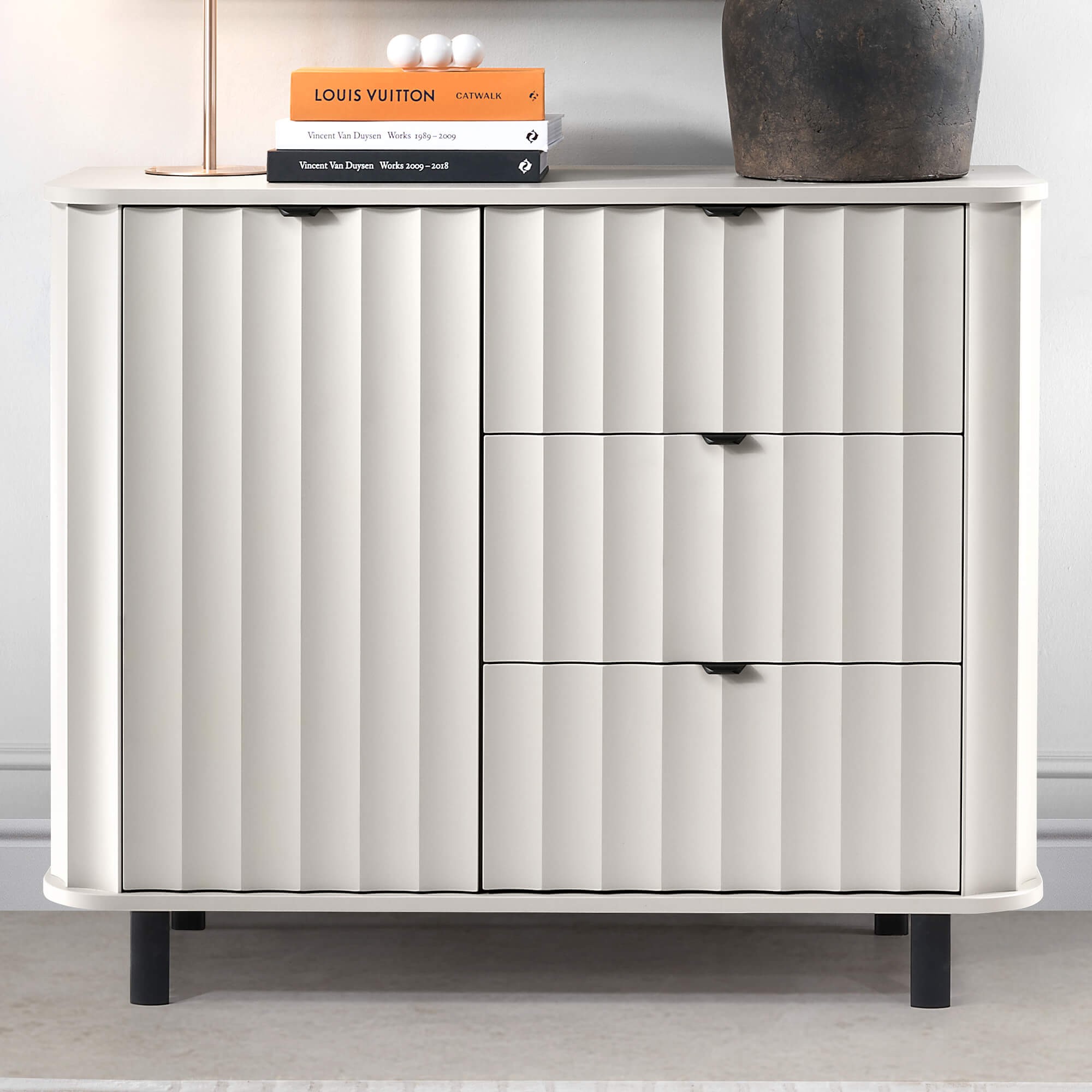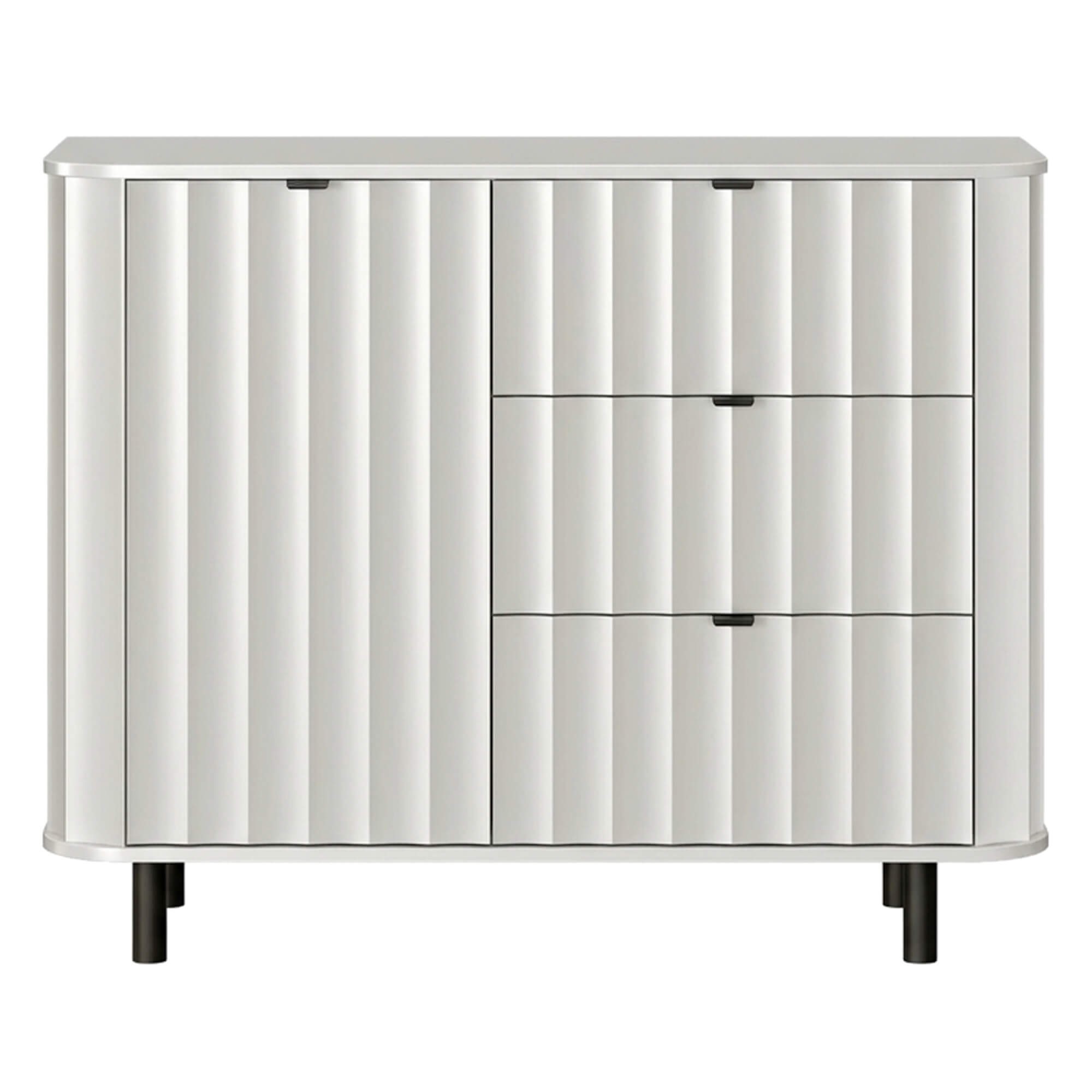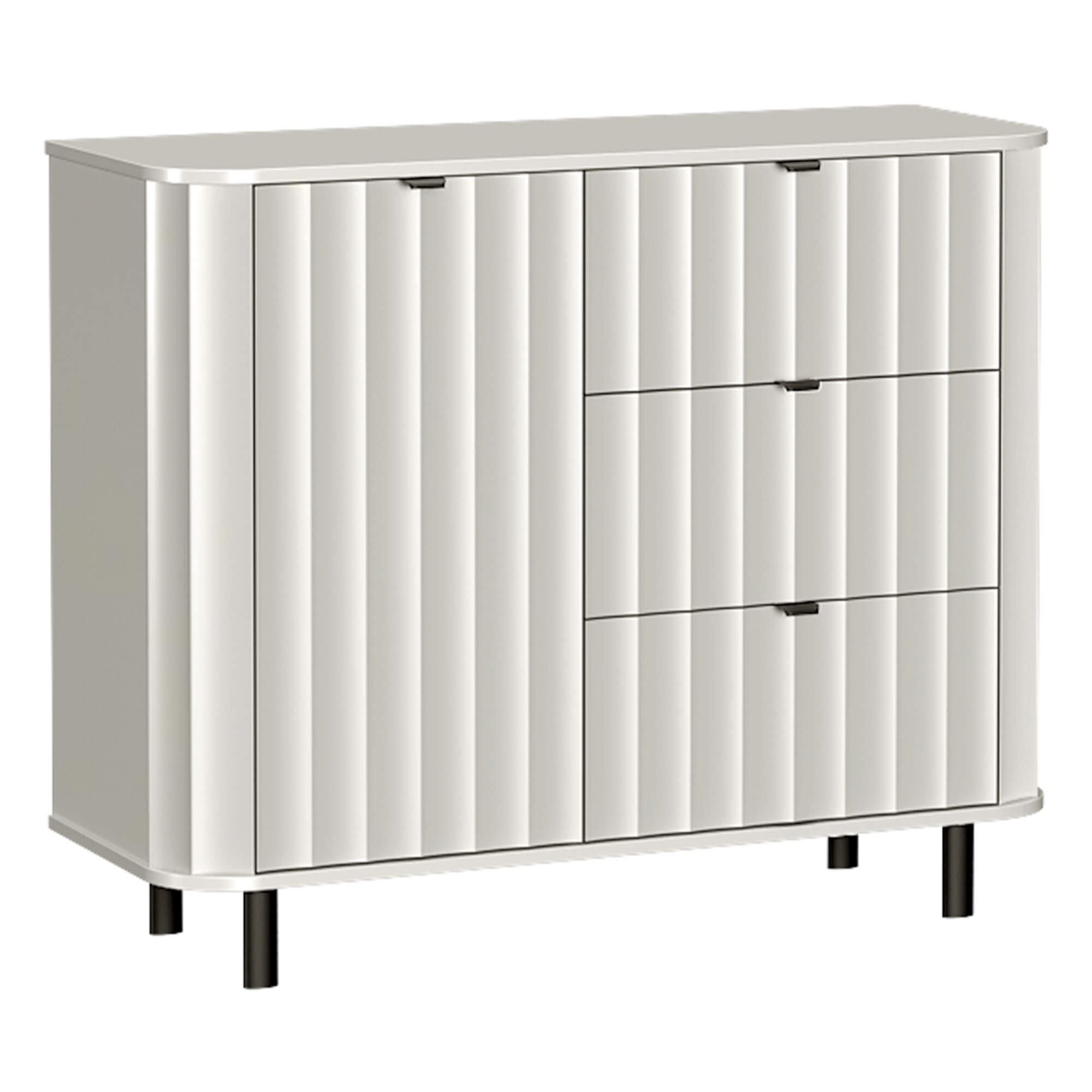 Komoda NOVADO-3 to wyjątkowy mebel, który łączy w sobie elegancję, nowoczesny styl i praktyczność. Wykończenie w kolorze bieli alpejskiej skutecznie rozjaśnia wnętrze, nadając mu lekkości i świeżości. Charakterystycznym elementem są pionowe frezowania na frontach MDF, które wprowadzają do aranżacji nowoczesny rytm i luksusowy sznyt, przyciągając wzrok każdego gościa.