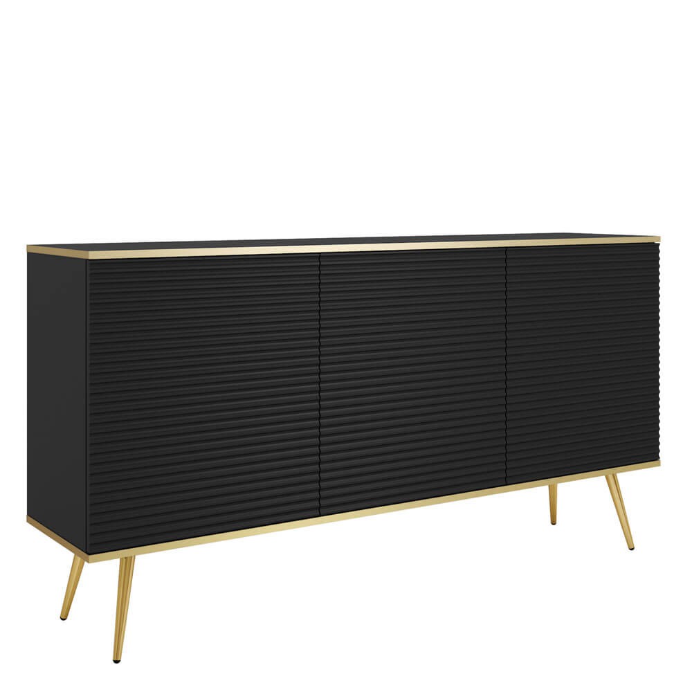 Komoda ORO MDF K-160 w głębokim odcieniu czerni to kwintesencja nowoczesnej elegancji, która doda Twojemu wnętrzu wyjątkowego charakteru. Subtelnie frezowane fronty MDF o pionowej fakturze tworzą efektowną, trójwymiarową powierzchnię, podkreśloną matowym, czarnym korpusem odpornym na zarysowania i łatwym w utrzymaniu czystości. Bezuchwytowy system „push-to-open” oraz ciche zawiasy soft-close sprawiają, że otwieranie drzwi to prawdziwa przyjemność, a dekoracyjne, złociste profile na blacie i cokole wprowadzają luksusowy akcent glamour. Smukłe, stożkowe nóżki w metalicznym wykończeniu dodają lekkości, a regulowane stopki gwarantują stabilność na każdej powierzchni. Przemyślane wnętrze z trzema pojemnymi komorami i półkami umożliwia wygodne przechowywanie sprzętu RTV, dekoracji czy akcesoriów, a dyskretnie ukryte łączniki Minifix i drewniane kołki dbają o solidność i estetykę bez widocznych śrub. Wybierz Komodę ORO MDF K-160 Czarną i odkryj, jak łatwo połączyć funkcjonalność z designerskim stylem, tworząc elegancką przestrzeń pełną harmonii.