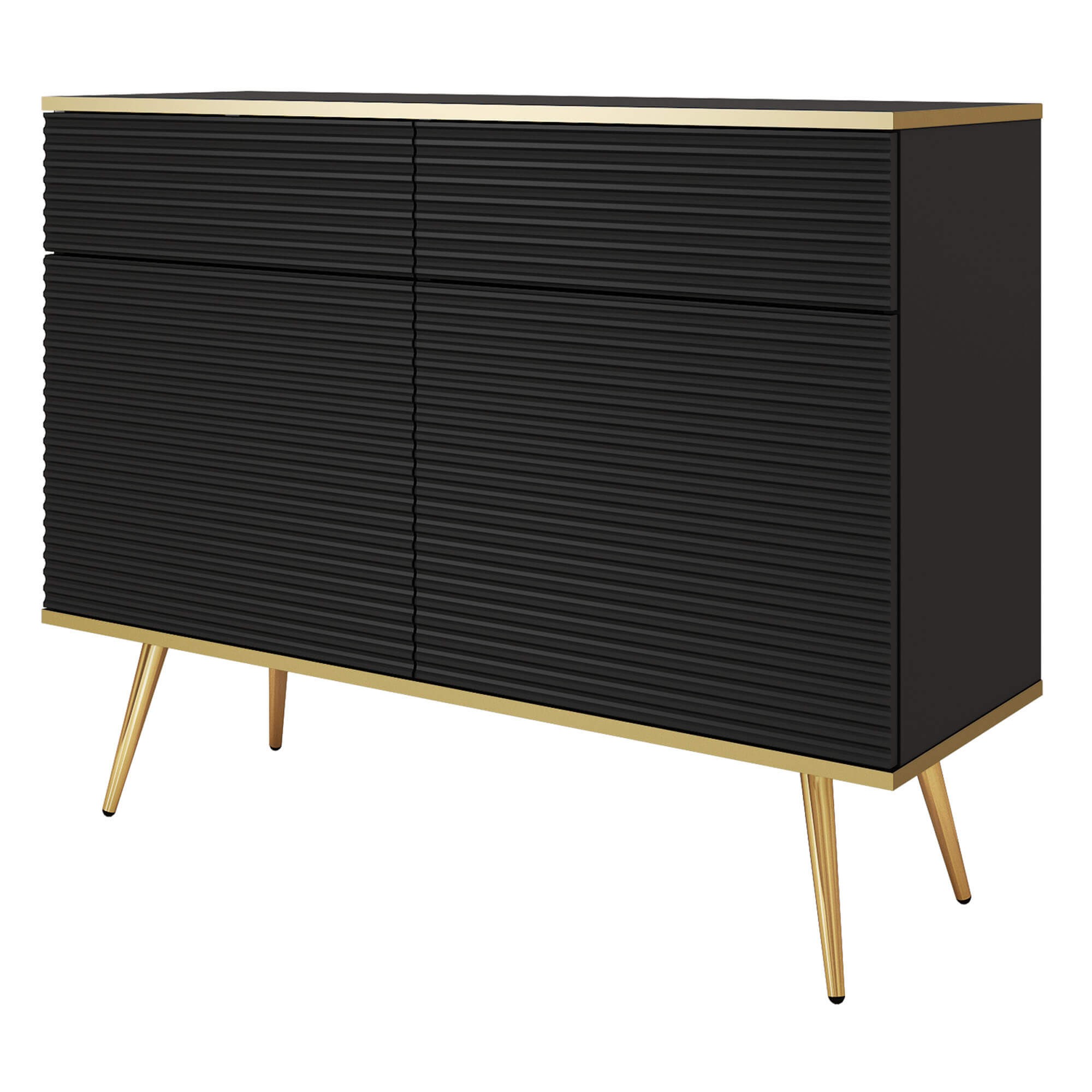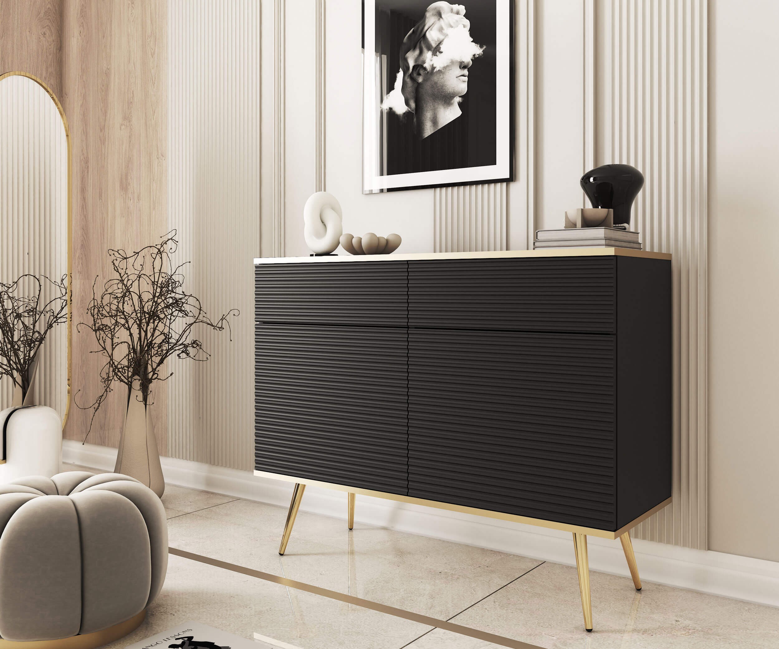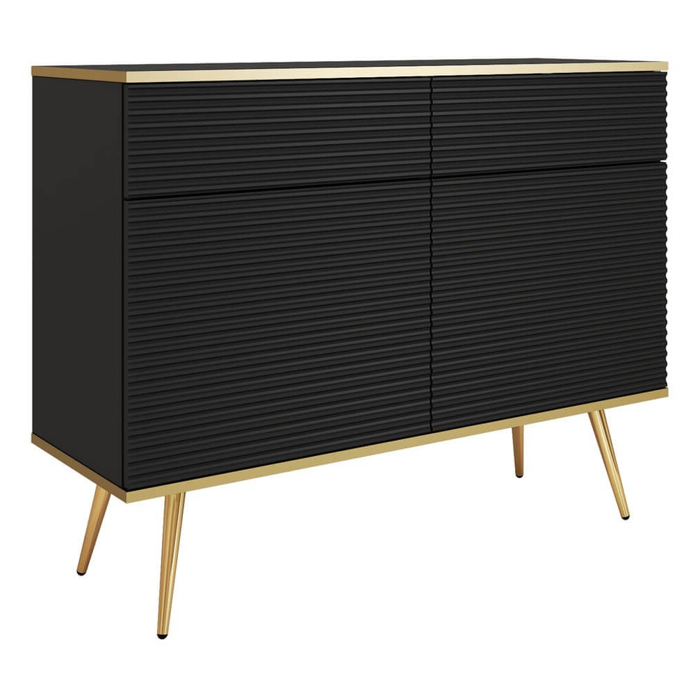 Komoda ORO MDF KSZ-107 w eleganckim, matowym odcieniu czerni to połączenie nowoczesnego designu i wyrafinowanej funkcjonalności, które odmieni każde wnętrze. Subtelnie frezowane fronty MDF o pionowej, trójwymiarowej fakturze przyciągają wzrok, a głęboka czerń korpusu z laminowanej płyty dodaje aranżacji charakteru i doskonale kontrastuje ze złocistymi akcentami. Bezuchwytowe drzwi i szuflady otwierane systemem “push-to-open” oraz ciche zawiasy soft-close podnoszą komfort użytkowania, podczas gdy dekoracyjne profile na blacie i cokole subtelnie podkreślają luksusowy styl. Smukłe, stożkowe nóżki w metalicznym złocie wprowadzają lekkość formy, a przemyślane wnętrze z pojemnymi komorami i regulowanymi półkami umożliwia wygodne przechowywanie sprzętu RTV, dekoracji czy ulubionych książek. Obrzeża ABS chronią krawędzie przed uszkodzeniami, a ukryte łączniki Minifix i drewniane kołki dbają o stabilność i estetykę komody. Dzięki regulowanym stopkom Komoda ORO MDF KSZ-107 Czarny zyskuje idealne podparcie na każdej powierzchni. Wybierz komodę ORO, by dodać swojemu salonowi lub sypialni ponadczasowego stylu, nie rezygnując z wygody i solidności wykonania.