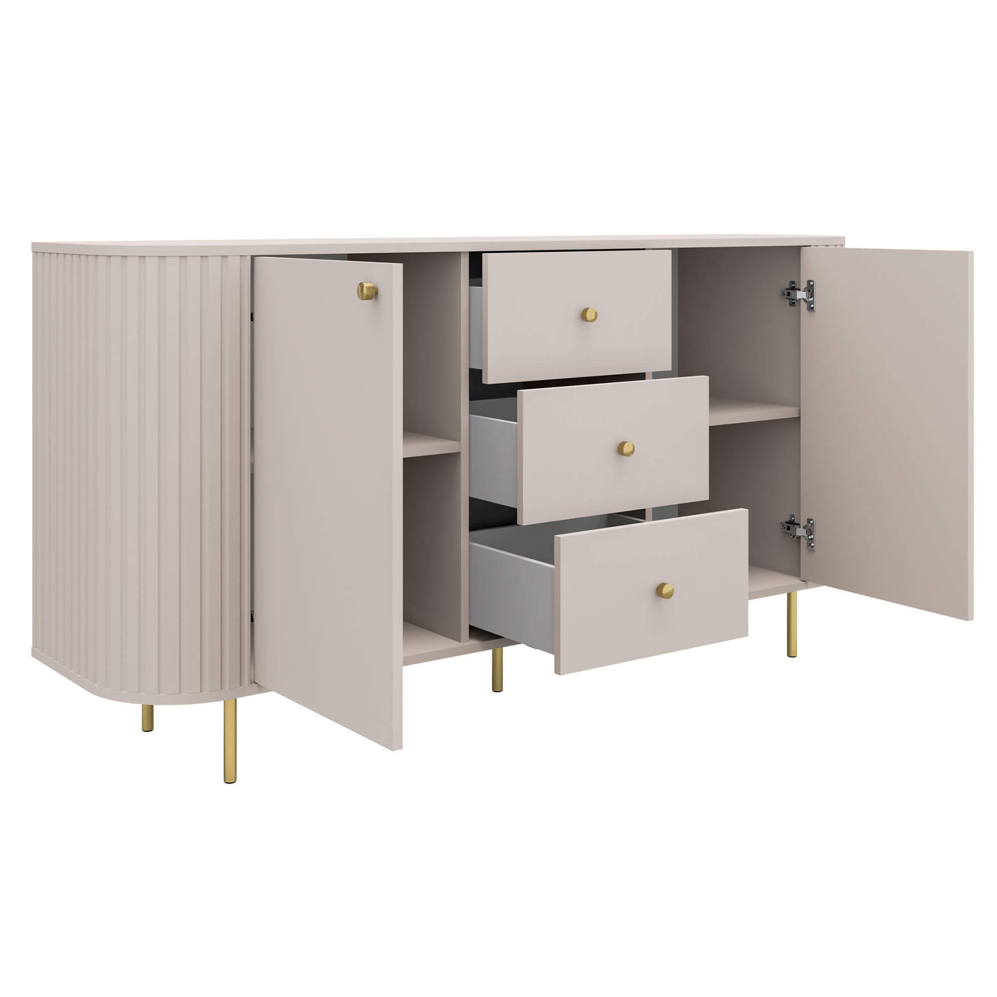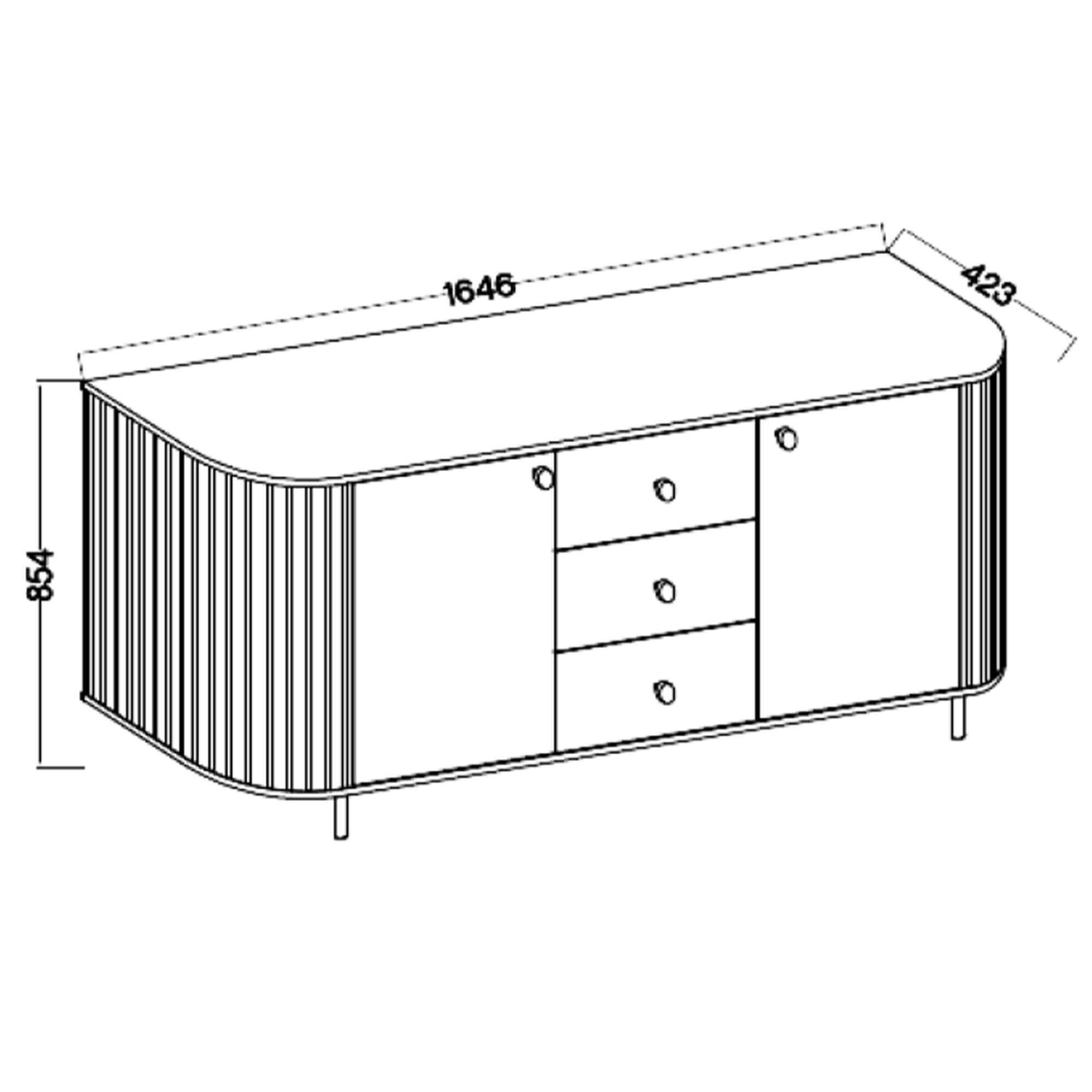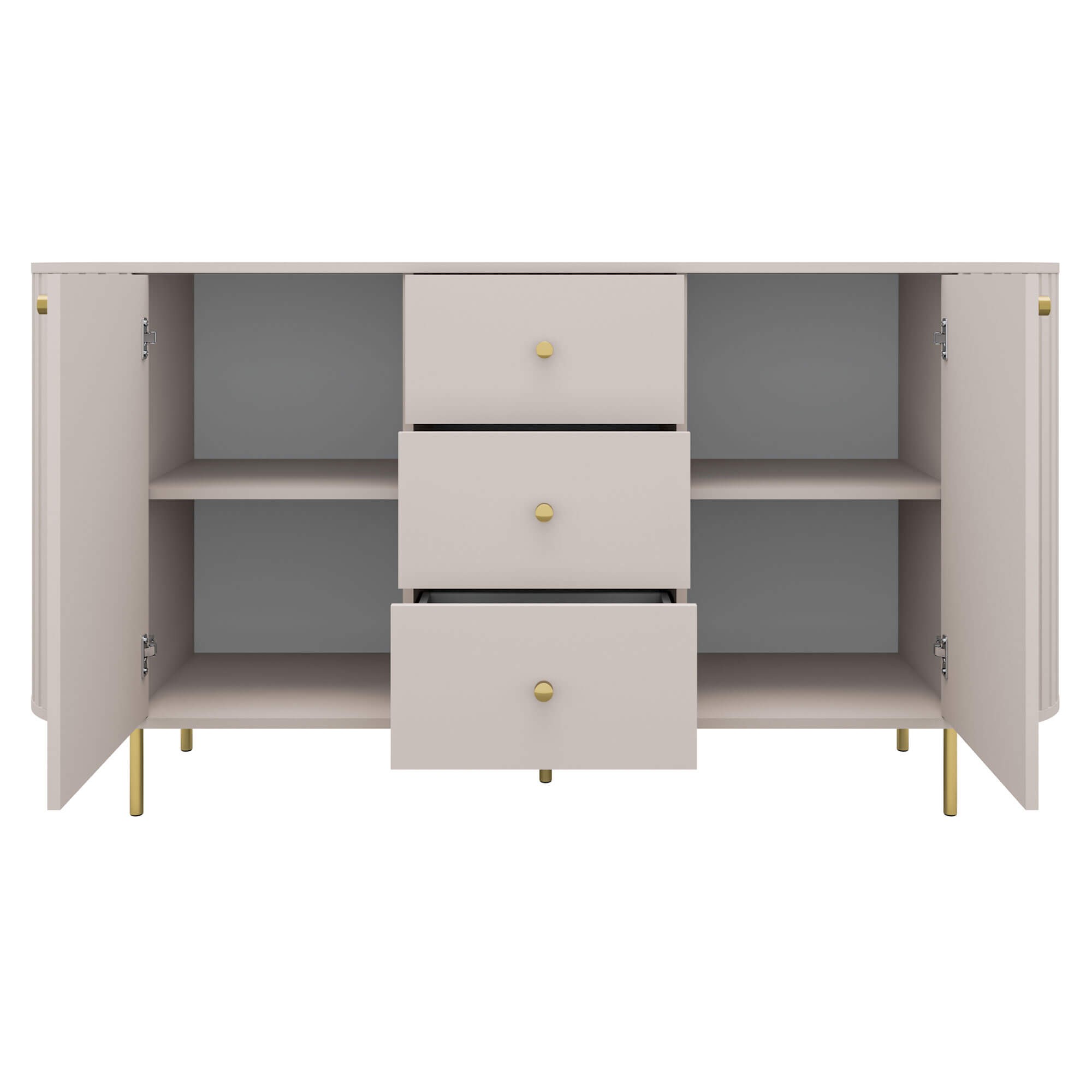 Komoda o szerokości 164,6 cm oferuje przemyślaną przestrzeń do przechowywania. W centralnej części znajdują się trzy pojemne szuflady, idealne na drobniejsze przedmioty, dokumenty czy tekstylia. Po bokach umieszczono zamykane szafki z półkami, które pozwalają wygodnie uporządkować większe elementy wyposażenia. Niezawodne zawiasy z cichym domykiem gwarantują komfort i gwarancję niezawodności w codziennym użytkowaniu. Praktyczne otwieranie i bezgłośne zamykanie drzwi oraz szuflad to wyjątkowe udogodnienie. Całość wsparta jest na smukłych, metalowych nogach w eleganckim wykończeniu, które podkreślają nowoczesny styl mebla i nadają mu wizualnej lekkości.