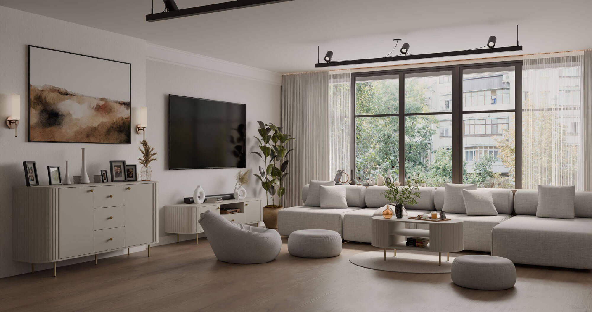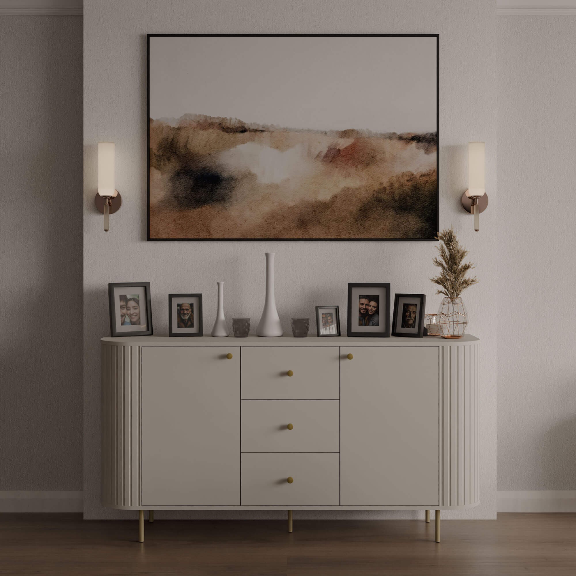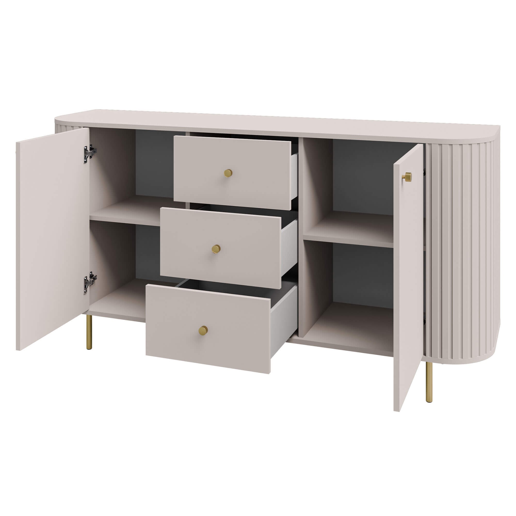 Komoda o szerokości 164,6 cm oferuje przemyślaną przestrzeń do przechowywania. W centralnej części znajdują się trzy pojemne szuflady, idealne na drobniejsze przedmioty, dokumenty czy tekstylia. Po bokach umieszczono zamykane szafki z półkami, które pozwalają wygodnie uporządkować większe elementy wyposażenia. Niezawodne zawiasy z cichym domykiem gwarantują komfort i gwarancję niezawodności w codziennym użytkowaniu. Praktyczne otwieranie i bezgłośne zamykanie drzwi oraz szuflad to wyjątkowe udogodnienie. Całość wsparta jest na smukłych, metalowych nogach w eleganckim wykończeniu, które podkreślają nowoczesny styl mebla i nadają mu wizualnej lekkości.