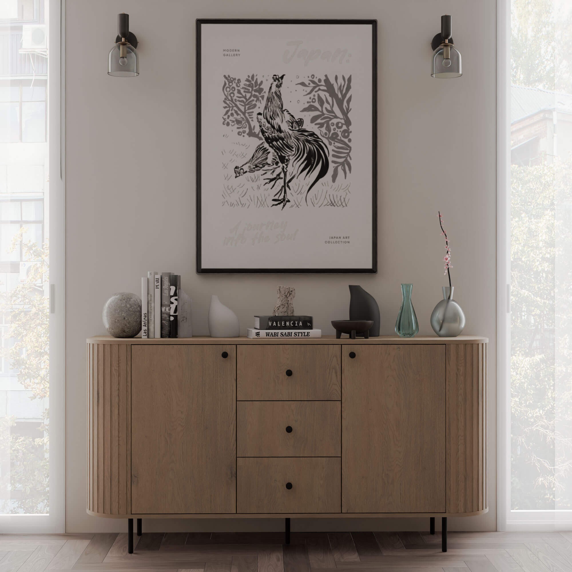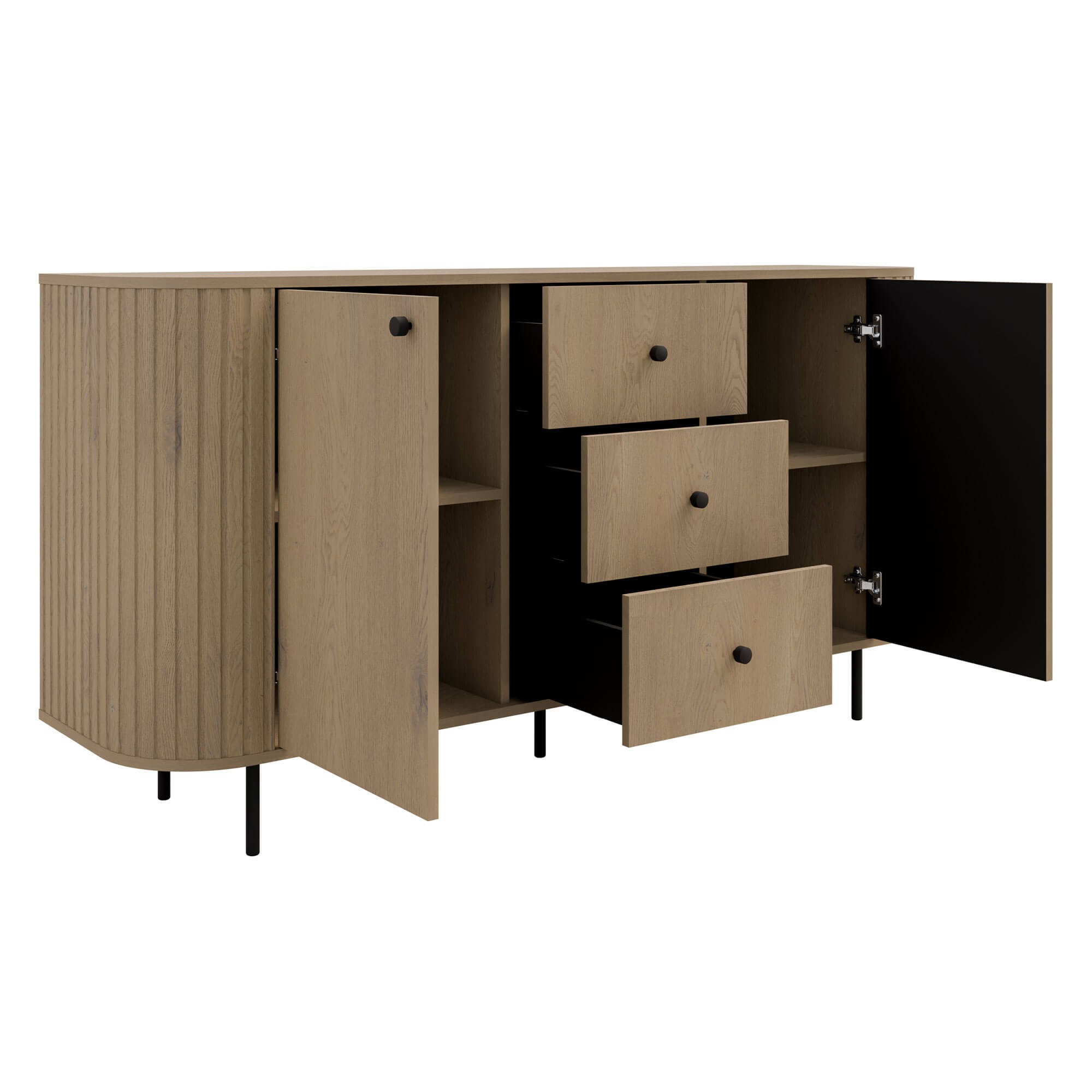 Komoda o szerokości 164,6 cm oferuje dużą przestrzeń do przechowywania. Układ z trzema szufladami w centralnej części oraz zamykanymi szafkami po bokach pozwala wygodnie uporządkować dokumenty, tekstylia, zastawę stołową lub inne domowe akcesoria. Wnętrze wyposażone w półki umożliwia logiczne rozmieszczenie przedmiotów, a szuflady zapewniają łatwy dostęp do drobiazgów. Stabilna konstrukcja oraz dopracowane detale gwarantują komfort codziennego użytkowania.