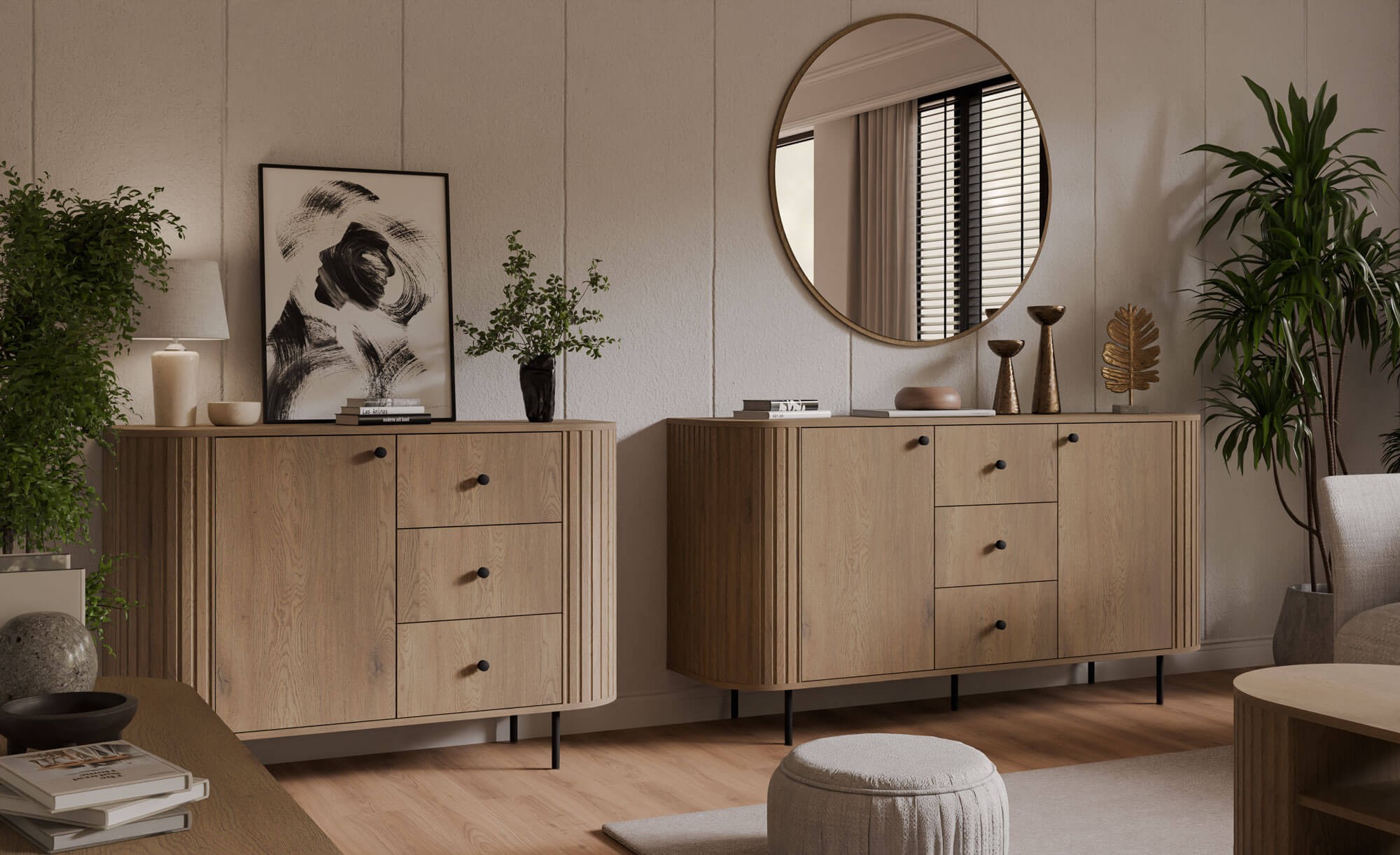 Komoda OVALIO w kolorze dąb cremona świetnie komponuje się z czarnymi dodatkami, metalowymi lampami oraz naturalnymi tkaninami. Sprawdzi się jako komoda do salonu, komoda do jadalni lub stylowa szafka do sypialni. To mebel, który łączy estetykę inspirowaną naturą z nowoczesną, loftową formą.