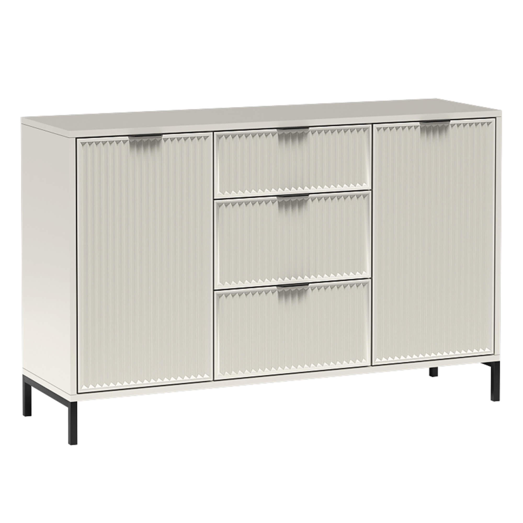 Nowoczesna komoda frezowana w kolorze kaszmiru to idealna propozycja uzupełniania współczesnego salonu lub sypialni. Prosty, uniwersalny design w połączeniu z modnym ryflowaniem na froncie sprawia, że pasuje do niemal każdej przestrzeni. Natomiast beż świetnie koresponduje ze stylem nowoczesnym, skandynawskim, jak i klasycznym. Dzięki zastosowaniu smukłych, metalowych nóg i uchwytów w kolorze czarnym, komoda zyskała prawdziwego pazura, ale i funkcjonalności. Wysoka konstrukcja pozwala na zachowanie porządku pod meblem, a uchwyty zapobiegają zabrudzeniom frontu. Ponadto komoda w swoim wnętrzu skrywa aż 3 głębokie szuflady z cichym domykiem i duże szafki wyposażone w inteligentny system push to open. To wyjątkowa wygoda, ale również stylowe wykończenie każdego wnętrza.