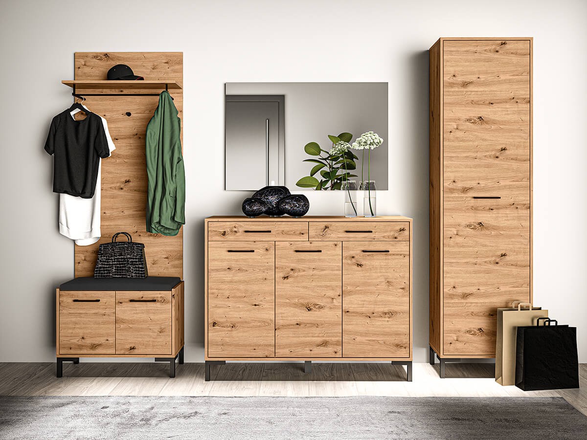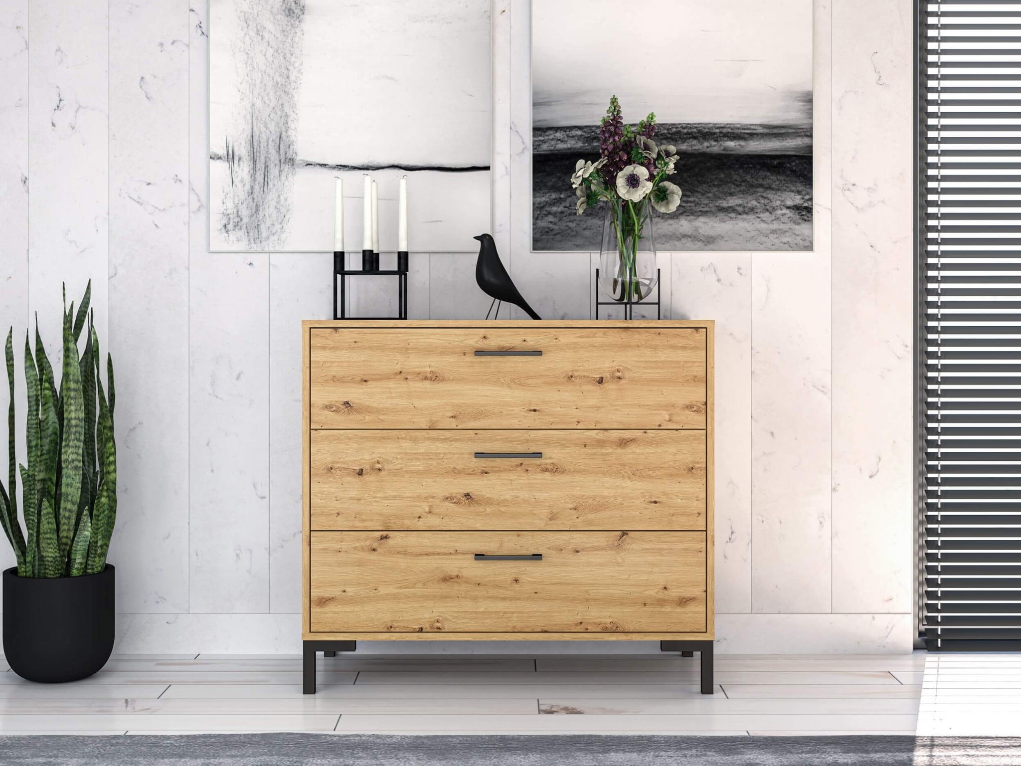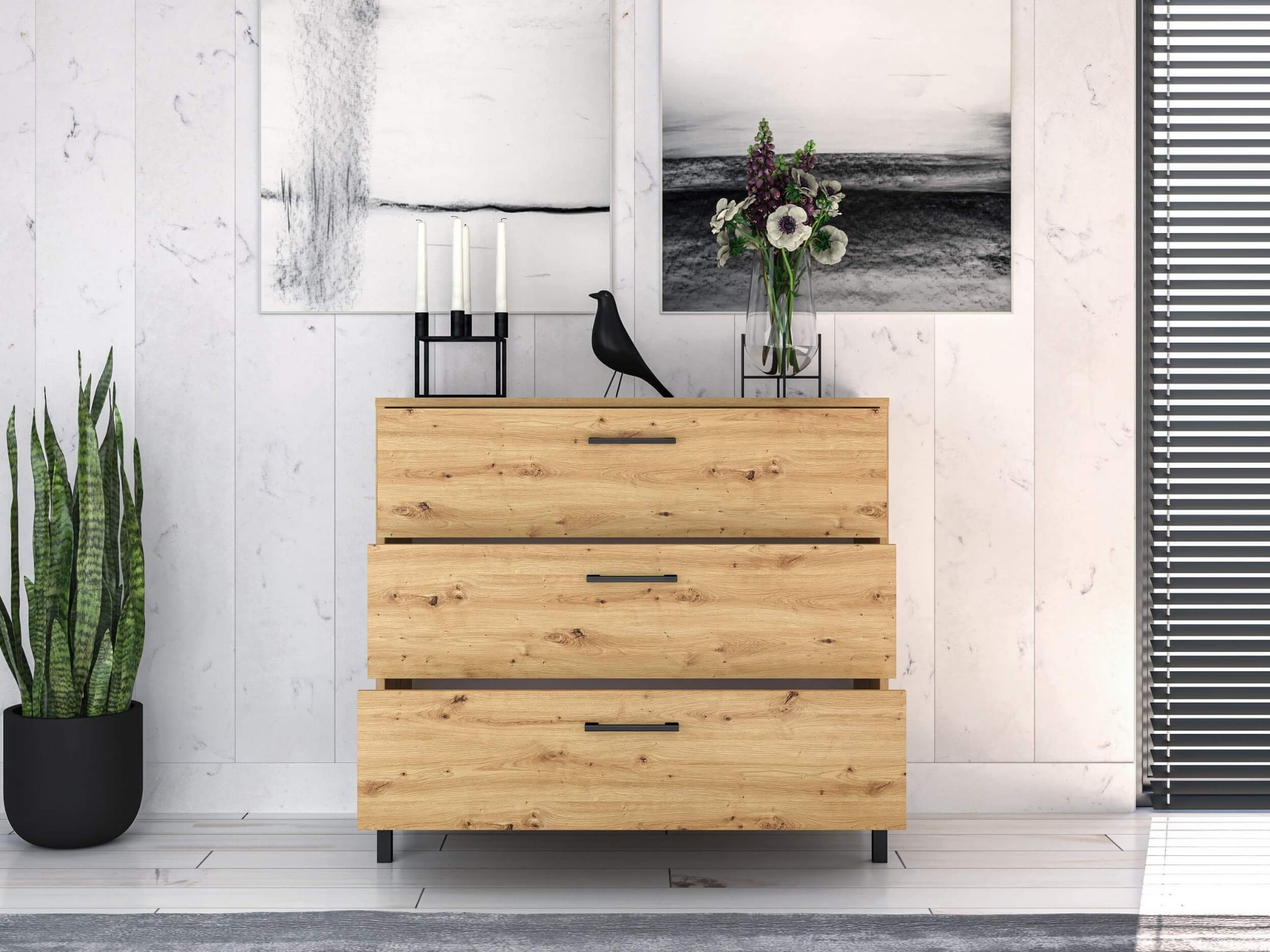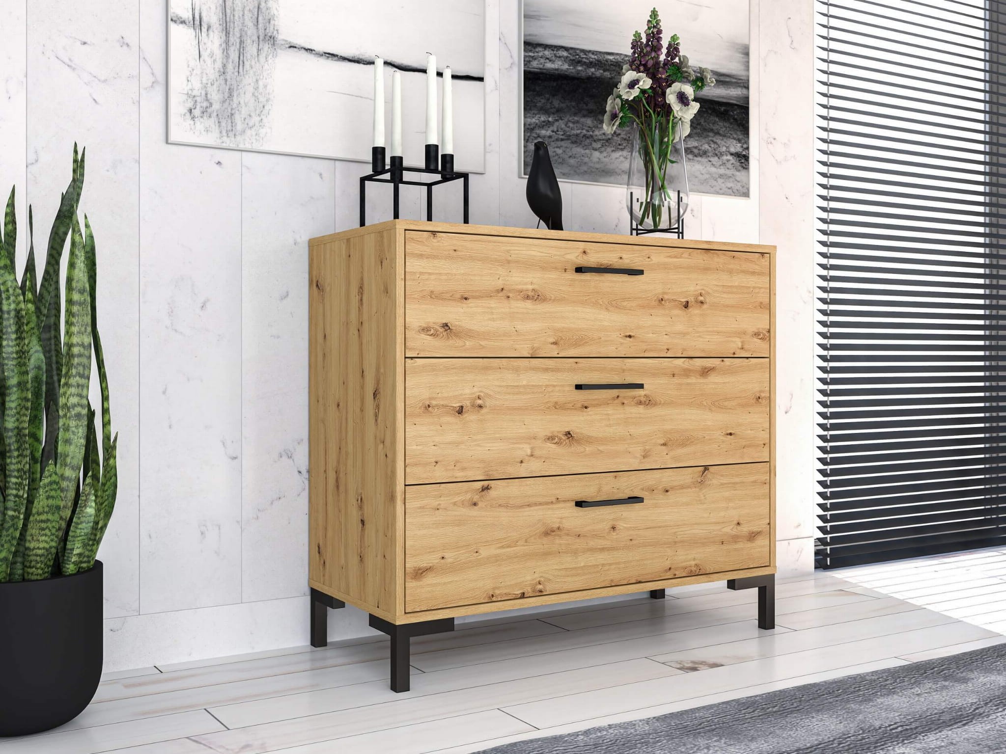 Pakowna komoda z trzema szufladami to mebel, którego nie może zabraknąć w żadnym domu. Połączenie naturalnego usłojenia drewna dąb artisan z czarnymi detalami daje fantastyczny efekt w stylu loftowym/industrialnym. Jeśli jesteś fanem tego designu, kolekcja NEVIO to idealne rozwiązanie dla Ciebie. Ponadto zyskasz dużo miejsca od przechowywania – 3 głębokie i szerokie szuflady pozwolą na pełen porządek i pomieszczą niezbędne akcesoria domowe, a wytrzymałe prowadnice w pełnym wysuwie ułatwią dostęp do wszystkich przechowywanych rzeczy.