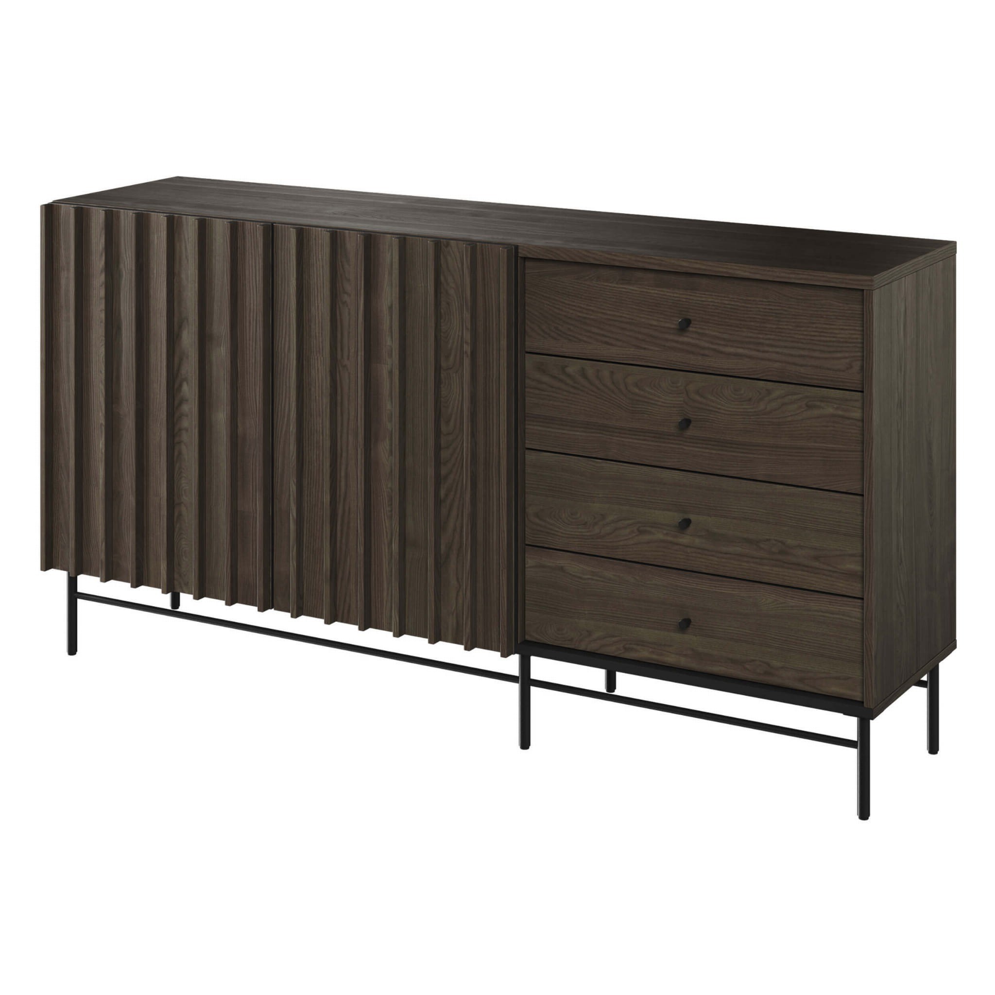 Niezwykle elegancka komoda z szufladami w szlachetnym odcieniu ciemnego drewna. Dekor w kolorze jesion portland i nóżki w czarnym wybarwieniu prezentują się z klasą - sprawiając, że mebel znajdzie swoje zastosowanie nie tylko w salonie, sypialni czy przedpokoju, ale również będzie modnym dodatkiem. Komoda z szufladami i półkami to idealne rozwiązanie dla osób, które cenią sobie wygodę przechowywania różnorodnych przedmiotów - przemyślana konstrukcja pomaga w utrzymaniu porządku i organizacji. W czterech pakownych szufladach można przechować ubrania, dokumenty, ręczniki czy piżamy, a w szafkach większe przedmioty. Smukłe, geometryczne lamele na froncie to piękny dodatek, który na pewno przyciągnie wzrok gości, a wysoka konstrukcja to duże ułatwienie podczas sprzątania. Elegancja w nowoczesnym wydaniu tylko z kolekcją PIEMONTE!