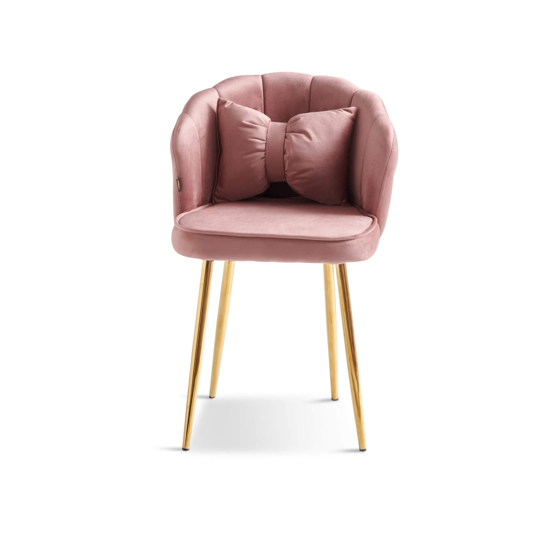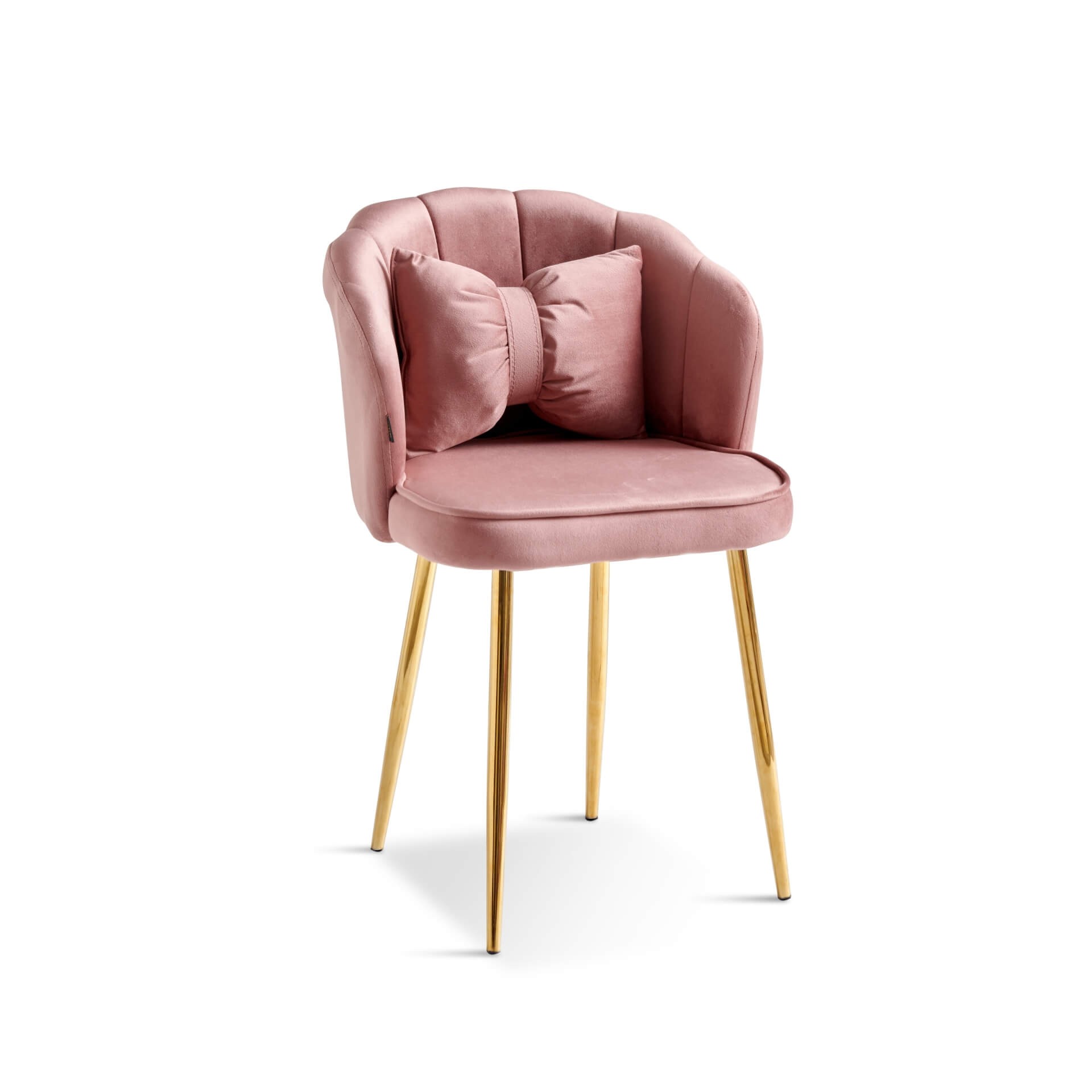 Nóżki krzesła są natomiast chromowane, zgrabne i stanowią jego solidną podstawę. Ich złoty kolor sprawia, że krzesło muszelka różowe jest niesamowicie dekoracyjne.