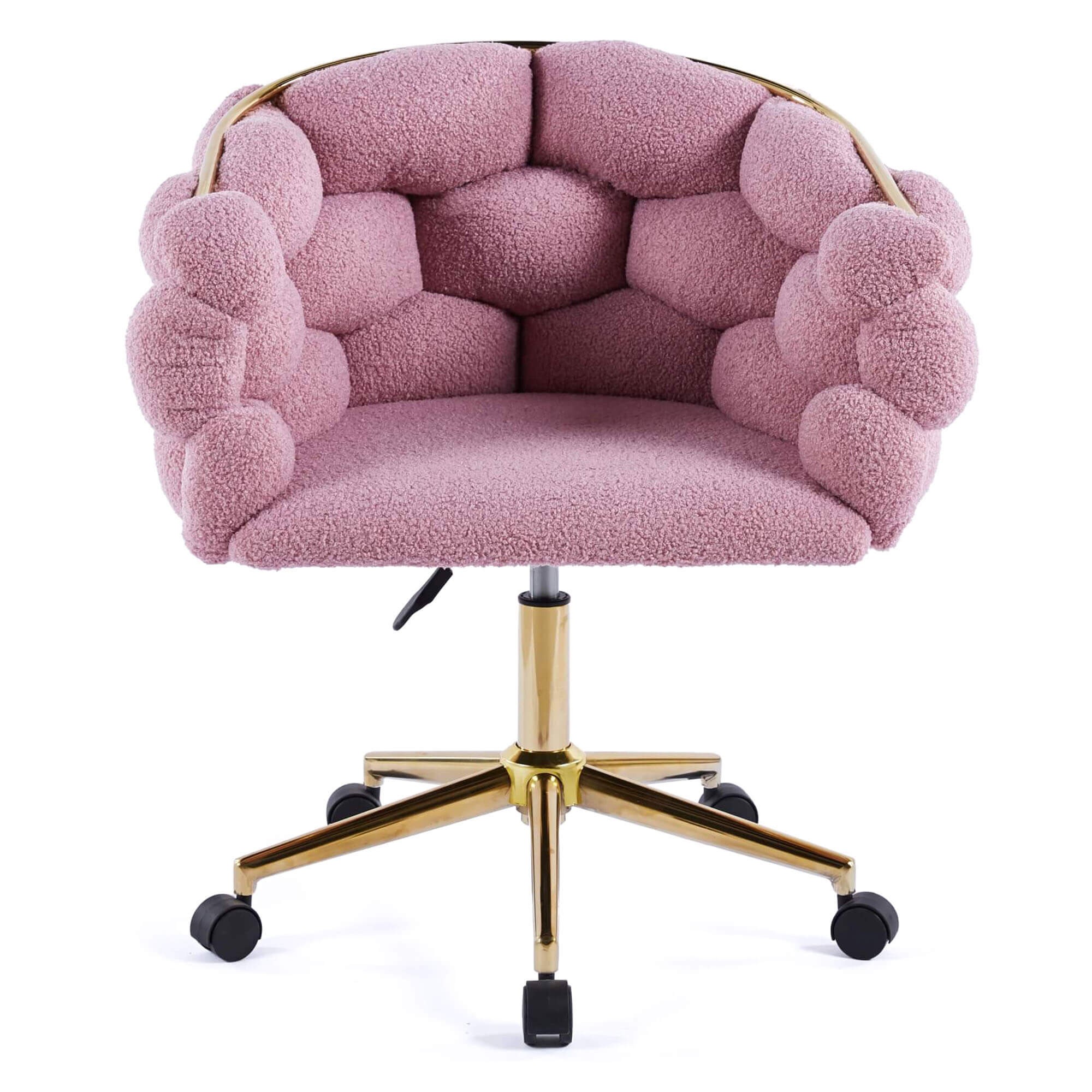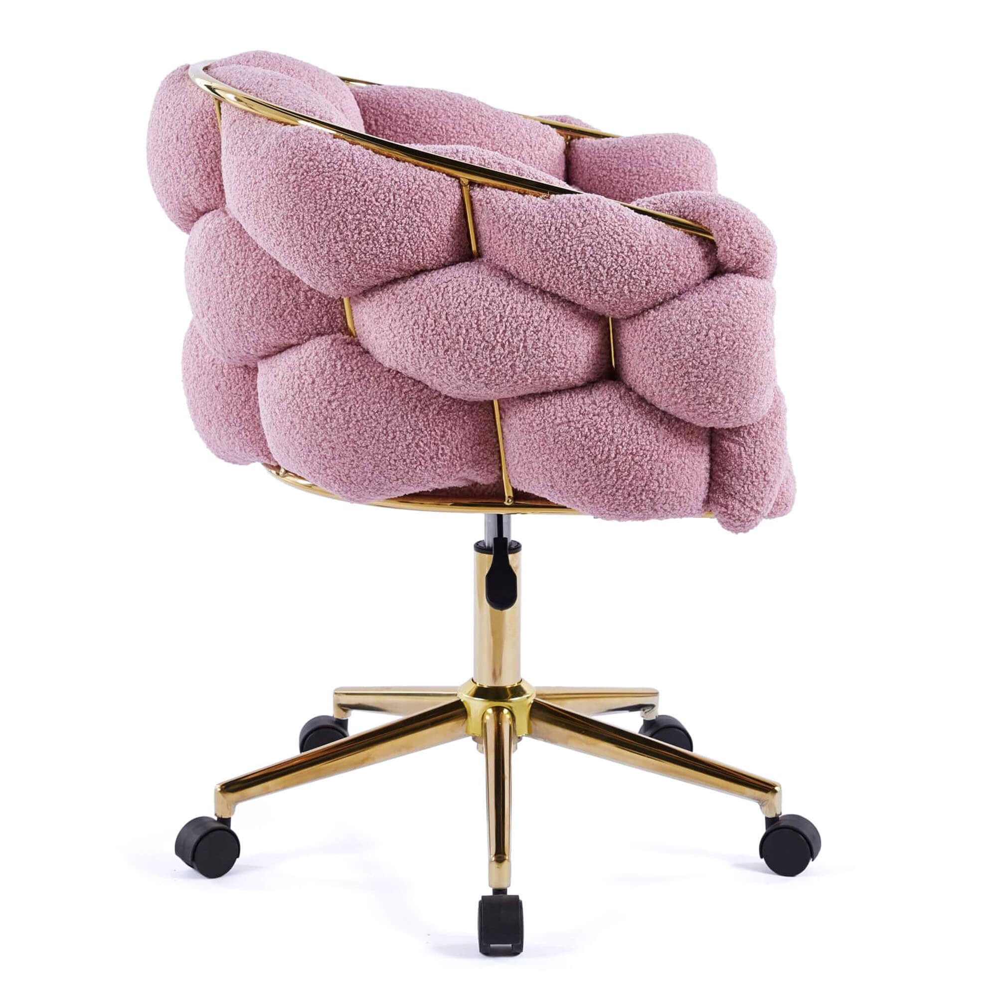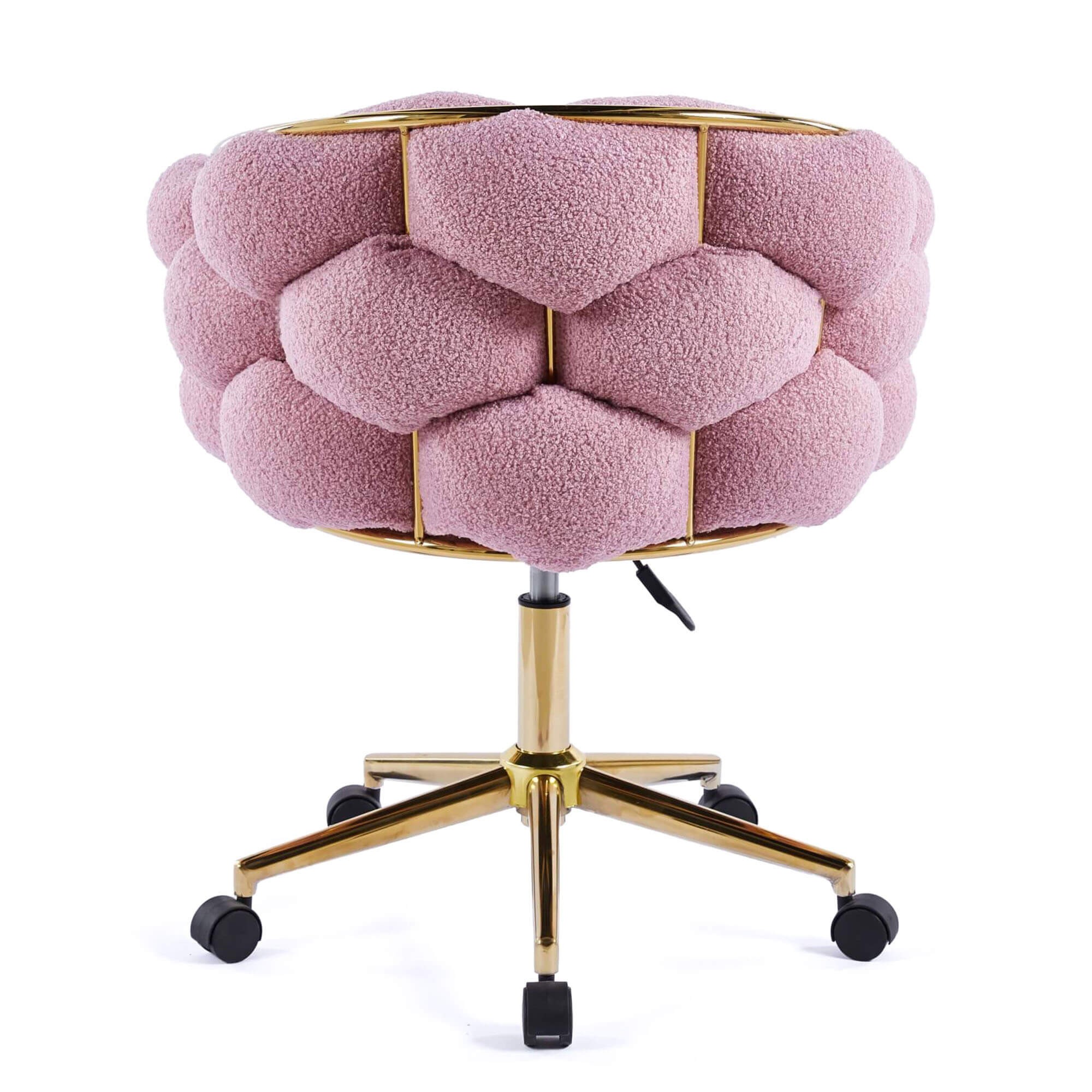 Krzesło jest zatem doskonałe do pracy i nauki – nie musimy obawiać się o widocznie uszkodzenia czy zadrapania materiału, regulowana wysokość siedziska sprawi, że z łatwością dopasujemy krzesło do wzrostu czy wysokości blatu, a funkcja obrotu i podstawa z mobilnymi kółkami przydadzą się, by sięgnąć po coś z regału czy szafki obok. Złota podstawa to także pełen blasku i ekskluzywności akcent, ponieważ piękny i estetyczny wygląd ma znaczenie. Doskonale komponuje się z różem, dzięki czemu krzesło baranek wygląda jednocześnie dostojnie i bardzo uroczo.