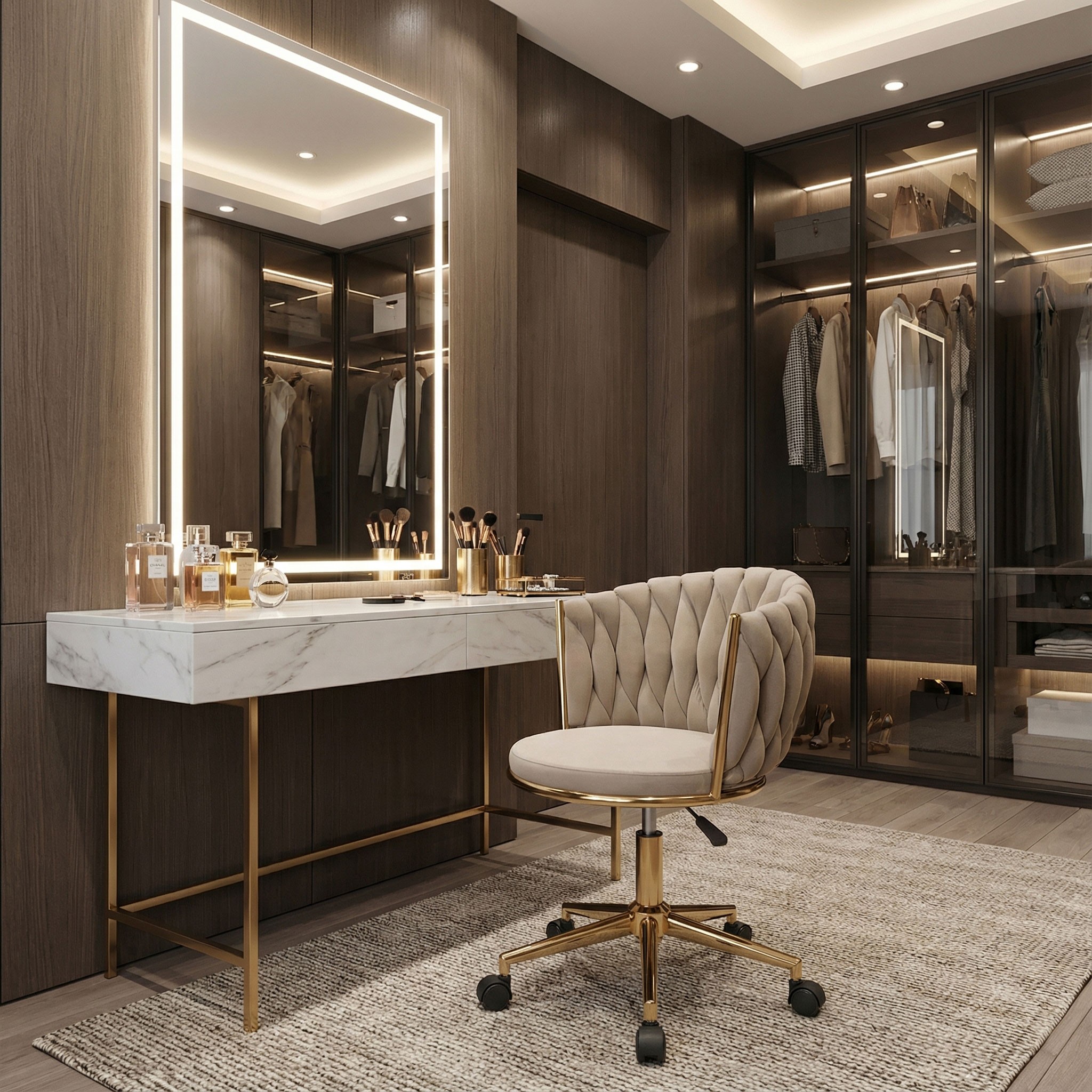 Krzesło obrotowe welurowe DC-3027S w odcieniu beżowym to stylowy i wygodny mebel, który idealnie wpisuje się w nowoczesne aranżacje wnętrz. Miękka tapicerka z przyjemnego w dotyku weluru gwarantuje komfort siedzenia, a ergonomicznie wyprofilowane oparcie wspiera plecy nawet podczas długiego użytkowania. Złote nogi nadają konstrukcji eleganckiego charakteru, wprowadzając do pomieszczenia nutę luksusu i wyrafinowania. Funkcja obrotowa sprawia, że krzesło jest praktyczne i funkcjonalne zarówno w biurze, jak i w domowej przestrzeni do pracy czy przy toaletce. Subtelny beż w połączeniu z połyskiem złotych elementów tworzy harmonijną całość, która podkreśla nowoczesny styl wnętrza. Model DC-3027S to propozycja dla osób ceniących komfort, trwałość i elegancki design, dzięki czemu świetnie sprawdzi się w salonie, gabinecie, sypialni czy jadalni.