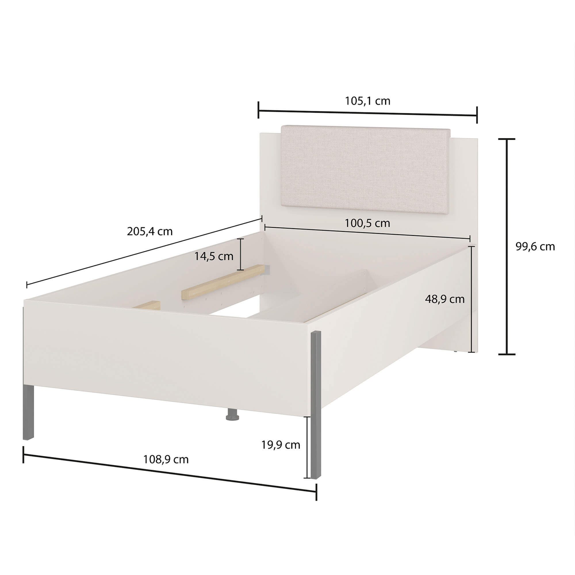 • Łóżko wykonane z płyty meblowej, z widocznymi obrzeżami zabezpieczonymi obrzeżem ABS, matowe wykończenie.