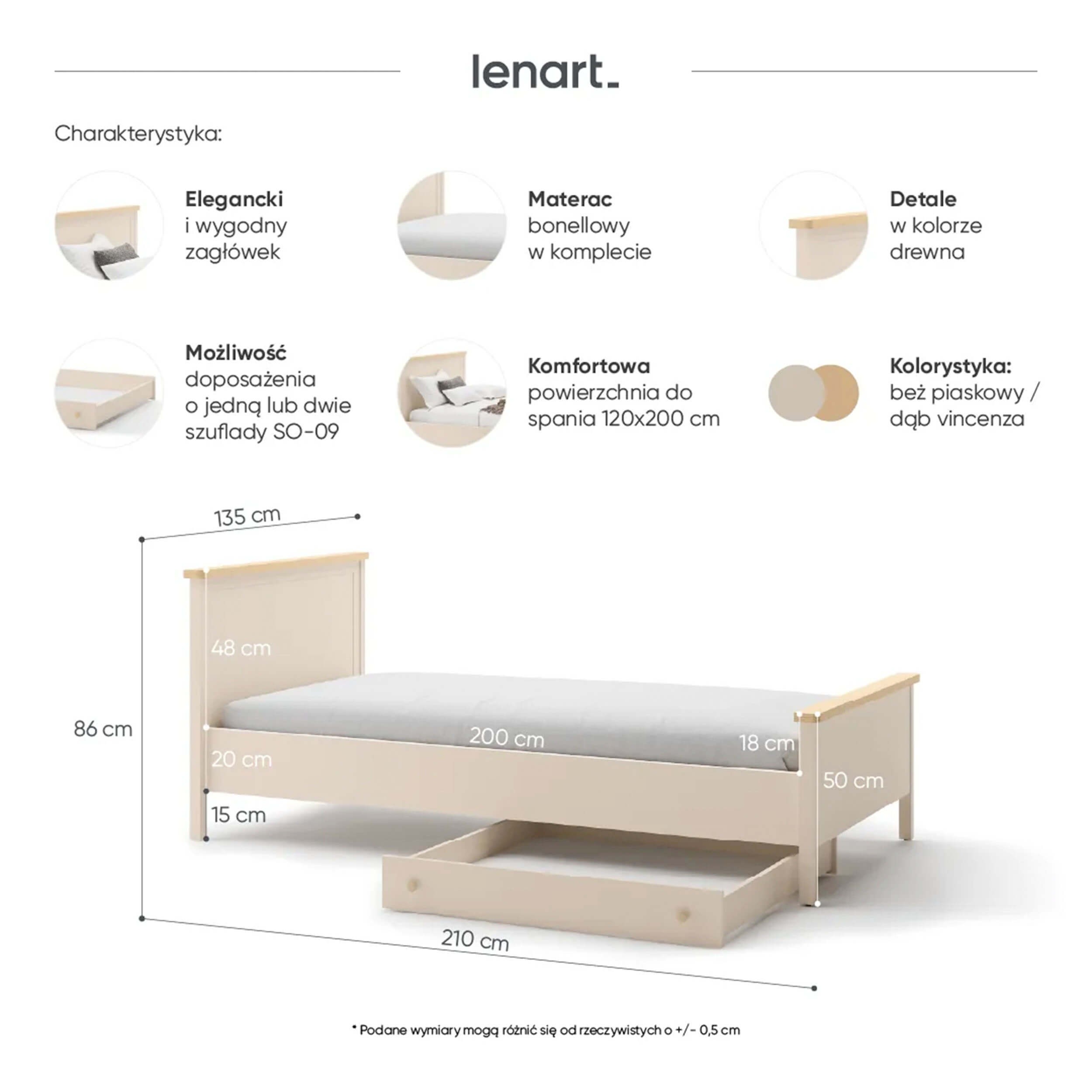 Łóżko to wygodne w codziennym użytkowaniu i zostało zaprojektowane z myślą o osobach, które cenią wnętrza utrzymane w klasycznym stylu. Charakterystycznym elementem jest wysoki zagłówek wykończony eleganckim dekorem w kolorze dębu vincenza bielona. Nadaje on całości szyku i sprawia, że mebel prezentuje się wyjątkowo estetycznie, a jednocześnie zapewnia komfortowe oparcie podczas odpoczynku. Łóżko można uzupełnić o praktyczne szuflady na pościel oznaczone symbolem SO 09, co pozwala na utrzymanie porządku w sypialni i lepszą organizację przestrzeni. Całość została wykonana z wytrzymałej płyty laminowanej, której krawędzie zabezpieczono trwałym obrzeżem ABS gwarantującym długotrwałe użytkowanie.