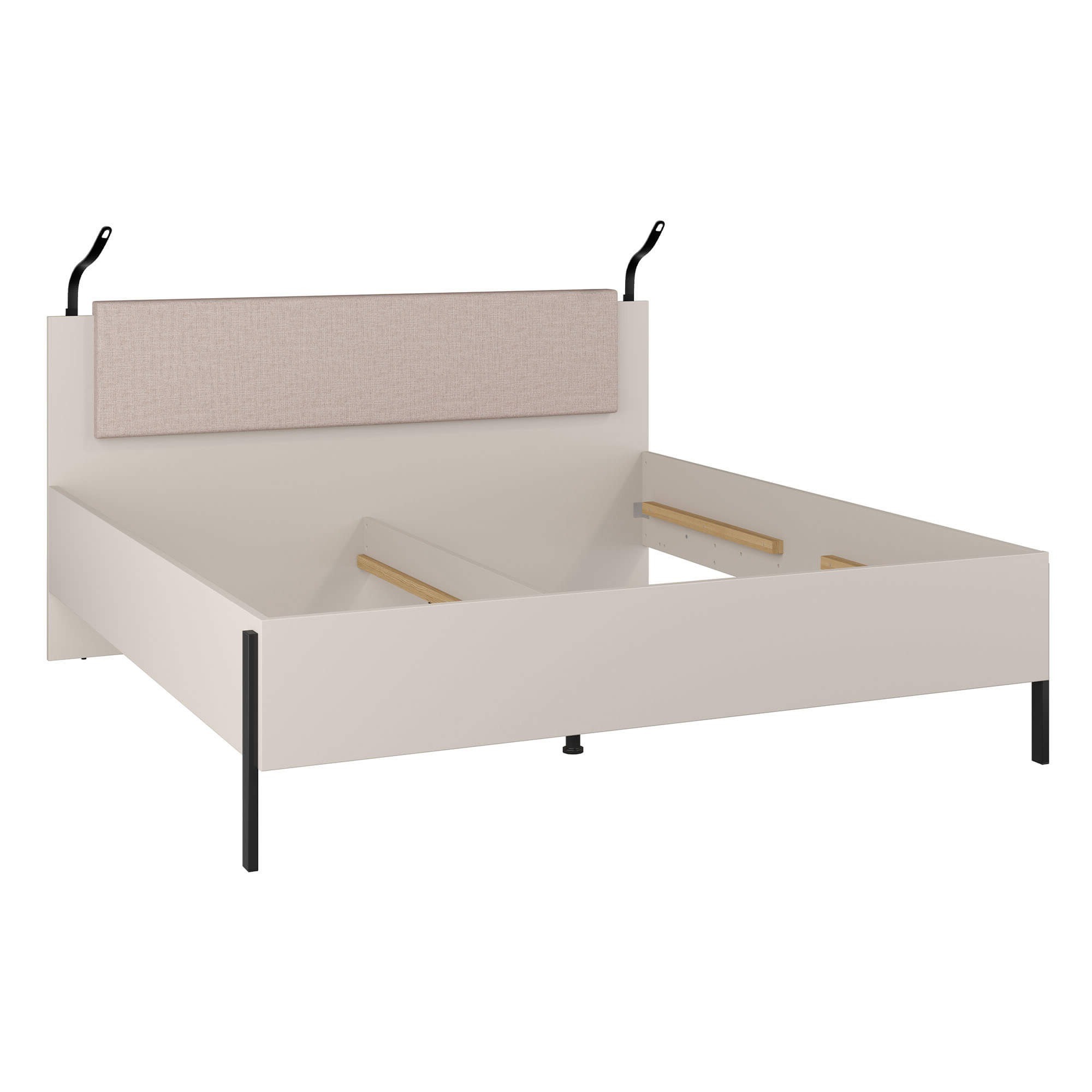 • Łóżko wykonane z płyty meblowej, z widocznymi obrzeżami zabezpieczonymi obrzeżem ABS, matowe wykończenie.