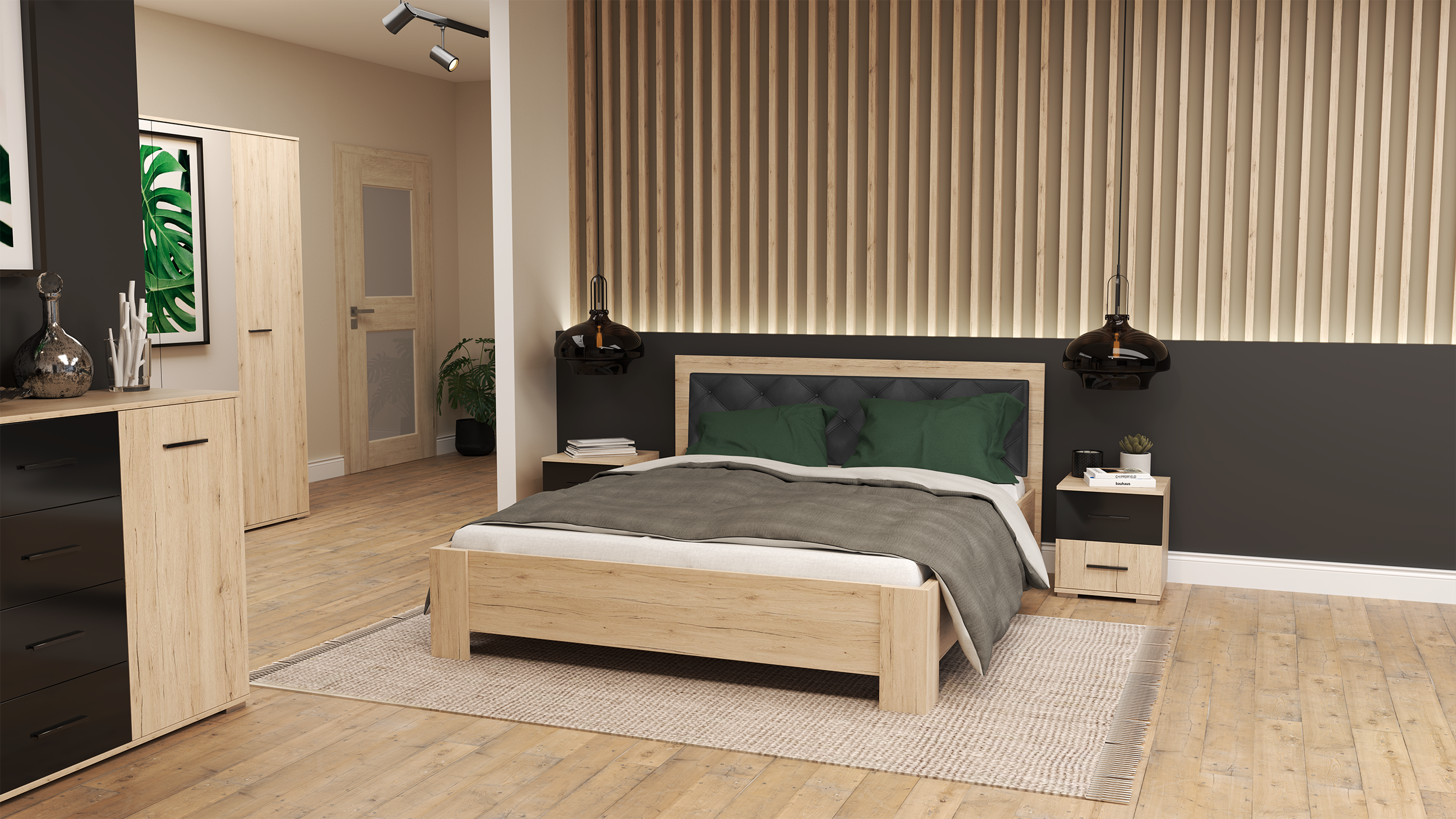 Łóżko Bari o wymiarach 160×200 cm z dekoracyjnym tapicerowanym zagłówkiem stanowi idealną propozycję do każdej nowoczesnej sypialni. Jego solidne wykonanie i komfort spania są dodatkowymi atutami. Połączenie czarnych tapicerowanych elementów z jasnym drewnem nadaje łóżku elegancki wygląd, doskonale wpisujący się w obecne trendy. Istnieje również możliwość zakupu łóżka z materacem o wymiarach 160×200 cm.