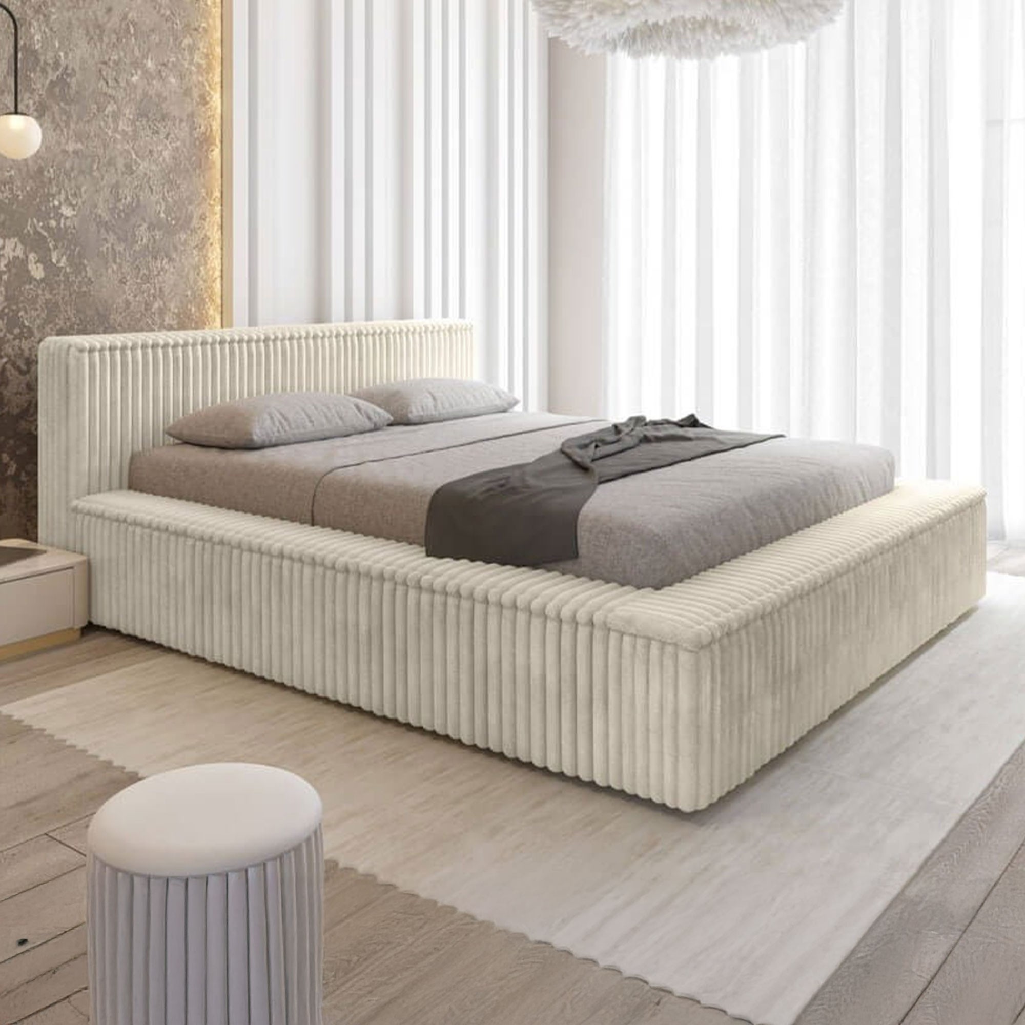 Łóżko MELODY w kolorze VITO 26 to doskonałe połączenie nowoczesnej estetyki z praktycznymi rozwiązaniami. Jego tapicerka wykonana z tkaniny VITO 26 charakteryzuje się miękką strukturą i subtelną fakturą, a elegancki jasny odcień idealnie komponuje się z każdym stylem wnętrz. Łóżko z delikatnym, żebrowanym wykończeniem stanowi centralny punkt sypialni, nadając jej nowoczesny, a jednocześnie przytulny wygląd.