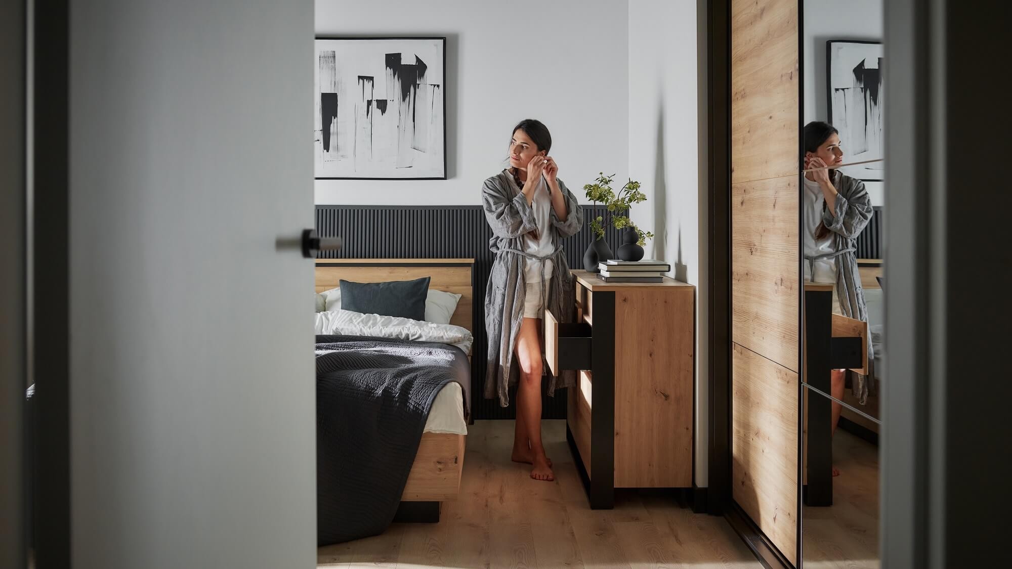 Łóżko QUANT QS-02 to kwintesencja wyjątkowego designu, który harmonijnie łączy elementy klasyczne z nowoczesnymi. Dzięki połączeniu szlachetnego dębu artisan z kontrastującym kolorem czarnym, łóżko przyciąga wzrok swoją elegancją i niezaprzeczalnym urokiem. Konstrukcja opiera się na solidnym drewnie, które w zestawieniu z metalowymi akcentami dodaje wnętrzu charakteru i wyrafinowania. Subtelne, minimalistyczne detale oraz perfekcyjne wykończenia sprawiają, że łóżko wpisuje się w zarówno klasyczne, jak i nowoczesne aranżacje. W efekcie, łóżko QUANT QS-02 staje się nie tylko funkcjonalnym meblem, ale również wyrafinowaną dekoracją, nadając Twojej sypialni niepowtarzalny klimat. Charakteryzuje się również wyjątkową trwałością i odpornością na uszkodzenia. Wbudowana taśma LED nie tylko zwiększa funkcjonalność, ale także wprowadza nowoczesny akcent, który podkreśla unikalny styl tego mebla.