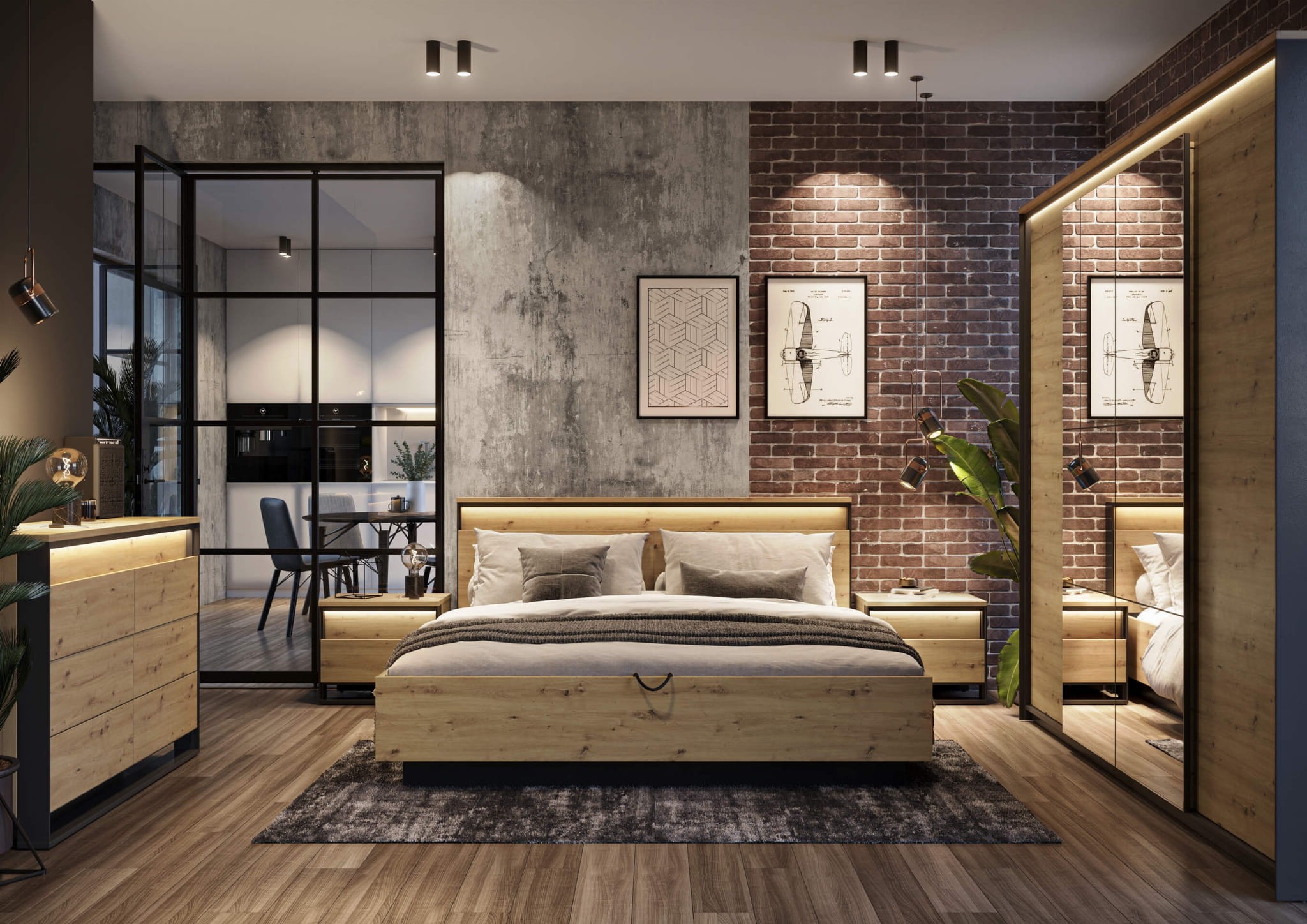 Łóżko loftowe 160x200 z oświetleniem LED to wyjątkowa propozycja dla miłośników loftu. Prosta, a przy tym ciekawa forma sprawia, że sypialnia zyska nową twarz. Drewniana rama jest niezwykle solidna, a zagłówek to świetnie miejsce, by oprzeć się podczas czytania lub oglądania serialu. Efektowne oświetlenie LED w wezgłowiu z efektem 3D dodaje prawdziwego smaku, a dodatkowo przyda się właśnie podczas czytania książki. Łóżko wygląda jak lewitujące, a to za sprawą czarnego dodatkowego stelaża, na którym jest osadzona konstrukcja mebla. Dzięki temu mebel wygląda na bardziej przestrzenny, a pomieszczenie wydaje się jeszcze większe i bardziej nowoczesne. Atrakcyjne połączenie metalu i drewna sprawia, że łóżko loftowe 160x200 jest lekkie, unikatowe i bez dwóch zdań będzie pasować do wielu aranżacji. W podstawie znajduje się również pojemnik na pościel! Same zalety!