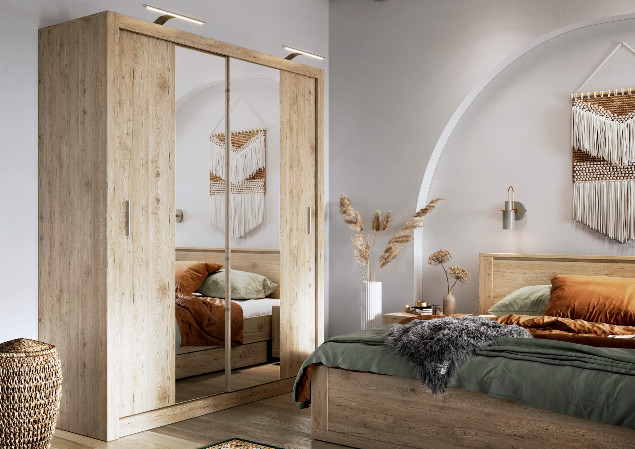 Do drewnianego łóżka w odcieniu san remo idealnie pasują tekstylia, które podkreślają jego naturalny, ciepły charakter i jednocześnie dodają wnętrzu przytulności oraz harmonii. Odcień san remo, przypominający delikatny, jasny dąb, świetnie komponuje się z tkaninami w neutralnych barwach, takich jak beże, kremy, szarości czy jasne odcienie brązów, które podkreślają subtelność drewna i nadają przestrzeni spokoju. Dla bardziej wyrazistego efektu można sięgnąć po dodatki w kolorach ziemi, jak oliwkowa zieleń, musztardowa żółć czy terakota, które stworzą przyjemny kontrast z jasnym drewnem. Warto również postawić na naturalne materiały, takie jak len, bawełna czy wełna, które doskonale współgrają z organicznym wyglądem drewna i wprowadzają do sypialni ciepło oraz przytulność.