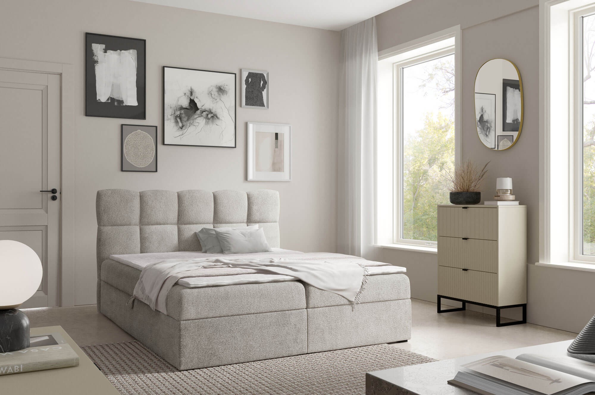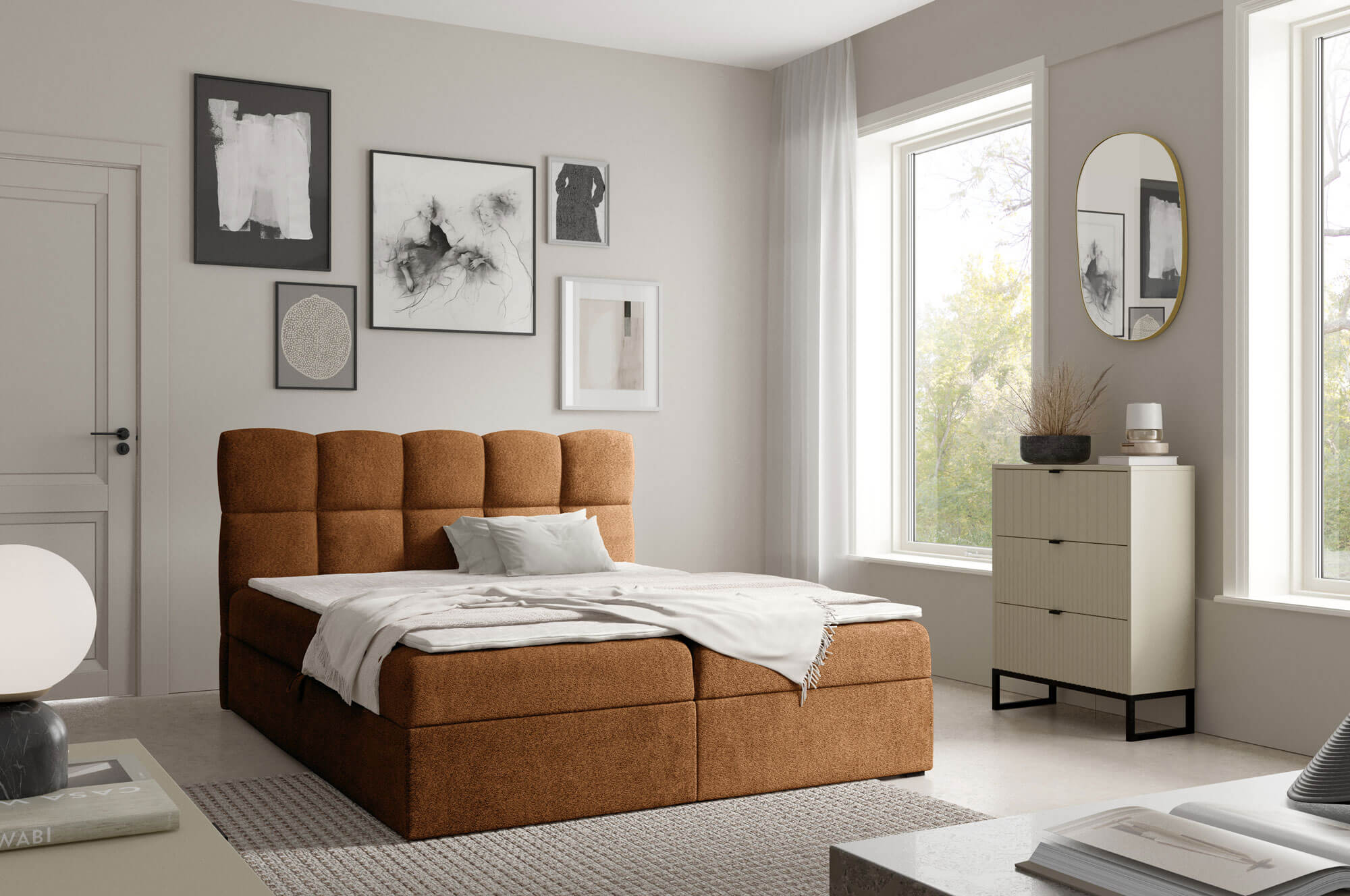 Łóżko kontynentalne NEGROS w rozmiarze 160x200 to nowoczesne i komfortowe rozwiązanie dla osób ceniących wygodę, solidność oraz funkcjonalność. To model, który łączy elegancki wygląd z praktycznymi rozwiązaniami, zapewniając idealne warunki do wypoczynku każdego dnia. Wyposażone w dwa pojemne schowki na pościel, łóżko NEGROS oferuje dodatkową przestrzeń do przechowywania, zachowując przy tym porządek w sypialni. Dzięki zastosowaniu automatu na sprężynach dostęp do pojemników jest prosty i bez wysiłku. Materac bonellowy zapewnia odpowiednią sprężystość i trwałość, a topper z pianki T25 o wysokości 4 cm zwiększa komfort snu, tworząc miękką, równą powierzchnię. Konstrukcja łóżka opiera się na stabilnych plastikowych ślizgach, co eliminuje potrzebę stosowania tradycyjnych nóżek i ułatwia utrzymanie czystości wokół mebla. Minimalistyczna forma łóżka sprawia, że doskonale wpasuje się w każdą aranżację — od klasycznej po nowoczesną. Model NEGROS 160x200 to gwarancja komfortowego wypoczynku i trwałości. Dzięki możliwości wyboru koloru tkaniny można stworzyć łóżko idealnie dopasowane do stylu i charakteru swojej sypialni.