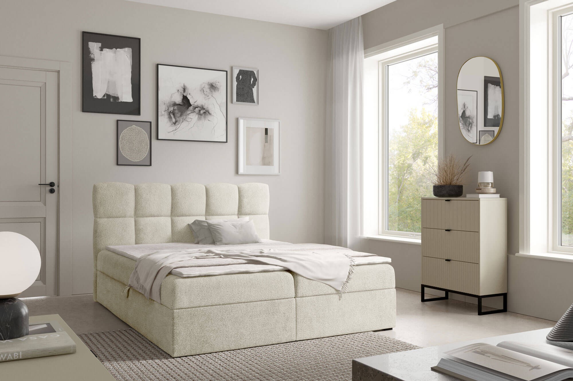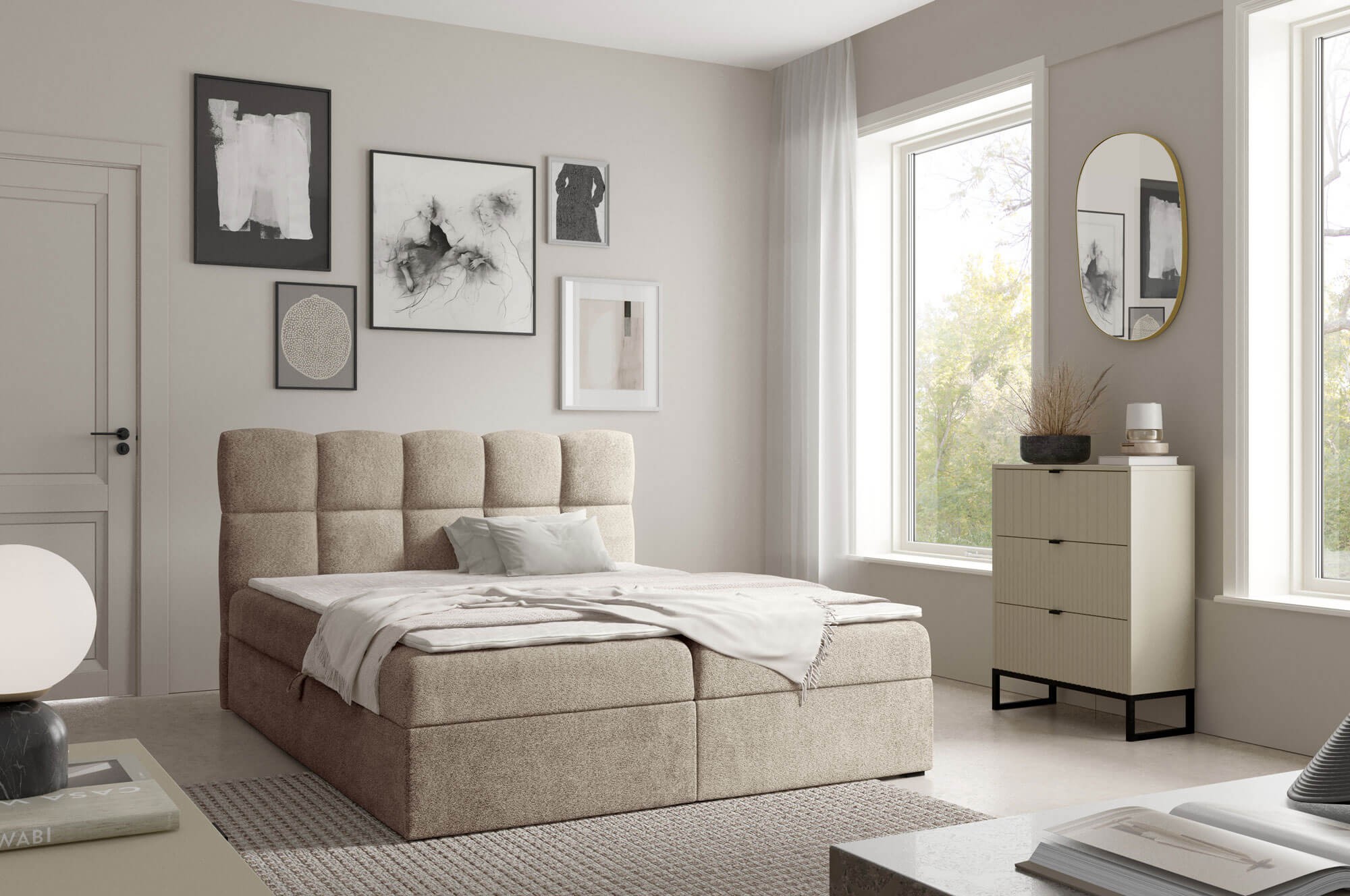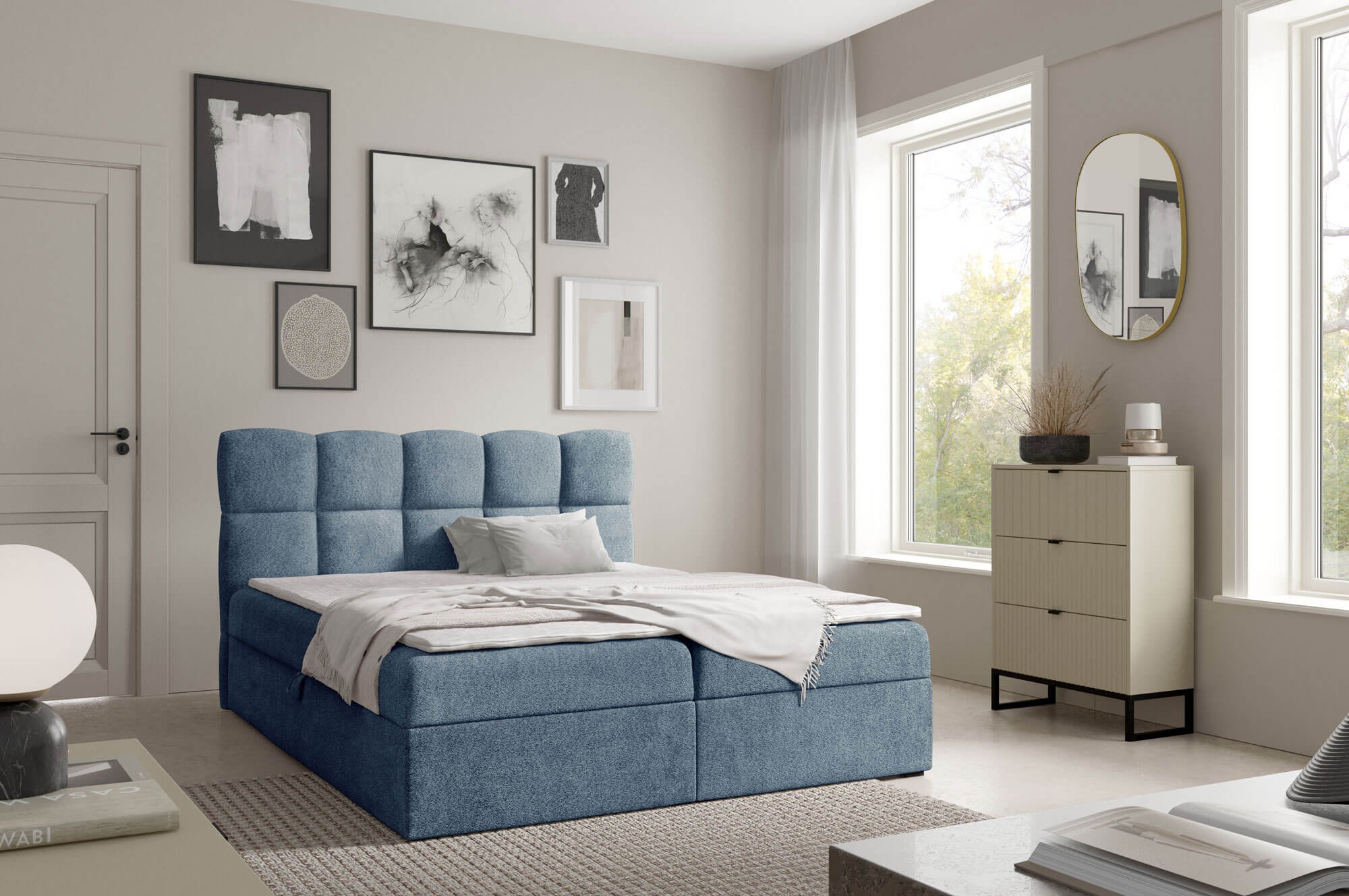 Łóżko kontynentalne NEGROS w rozmiarze 200x200 to propozycja dla osób, które cenią przestrzeń, komfort i elegancję w sypialni. Ten model zapewnia wyjątkowo wygodną powierzchnię spania, idealną dla dwóch osób, a jego solidna konstrukcja gwarantuje trwałość i stabilność przez lata. Wyposażone w dwa pojemne schowki na pościel, łóżko NEGROS łączy funkcjonalność z praktycznym designem. Dzięki zastosowaniu automatu na sprężynach otwieranie i zamykanie pojemników jest lekkie i bezproblemowe. Wbudowany materac bonellowy dba o odpowiednie podparcie ciała, a topper z pianki T25 o wysokości 4 cm zwiększa komfort snu, zapewniając przyjemnie miękką i równą powierzchnię. Konstrukcja pozbawiona tradycyjnych nóżek, oparta na plastikowych ślizgach, nadaje łóżku nowoczesny wygląd i stabilność, a jednocześnie ułatwia utrzymanie czystości. Prosty, elegancki design sprawia, że model NEGROS doskonale wpisuje się w aranżacje zarówno klasyczne, jak i nowoczesne. Łóżko kontynentalne NEGROS 200x200 to połączenie wygody, praktyczności i solidnego wykonania. Możliwość wyboru koloru tkaniny pozwala stworzyć mebel idealnie dopasowany do wystroju sypialni i indywidualnego stylu użytkownika.