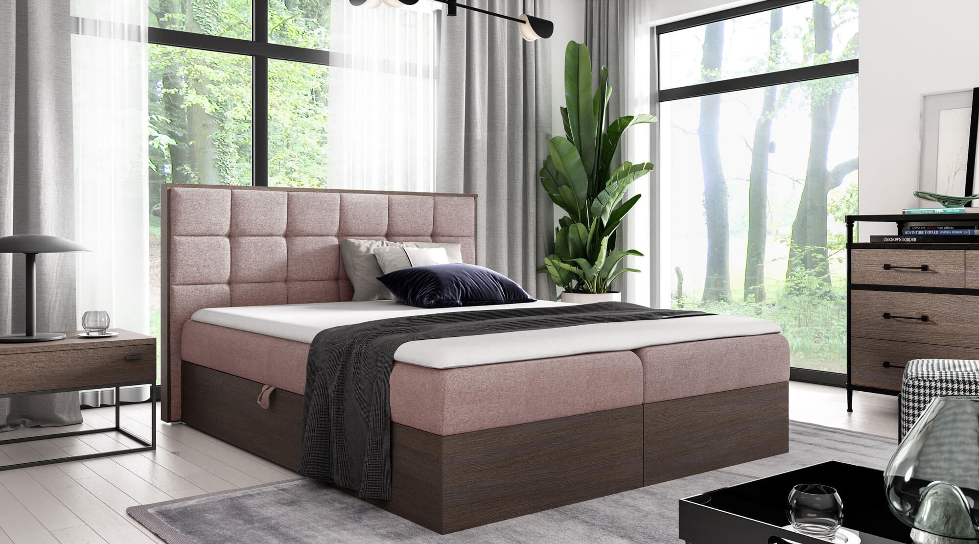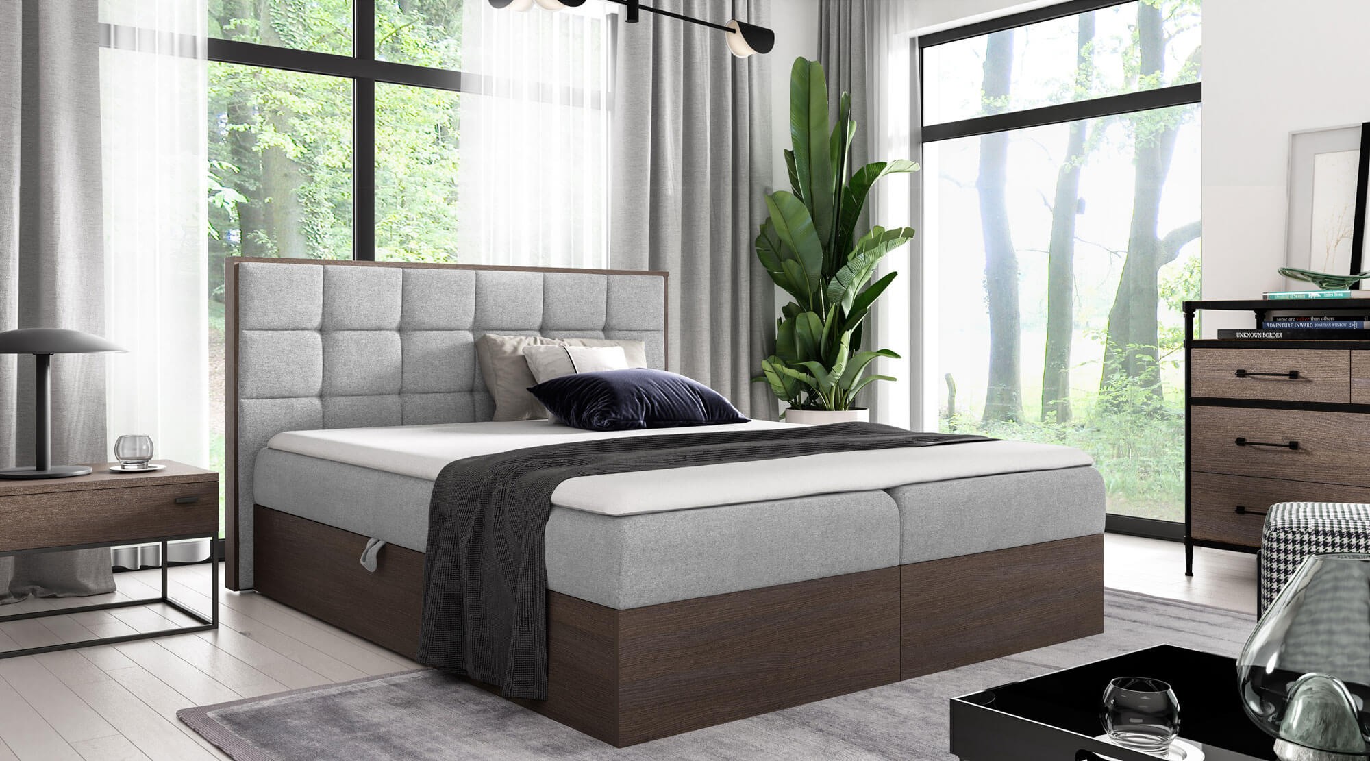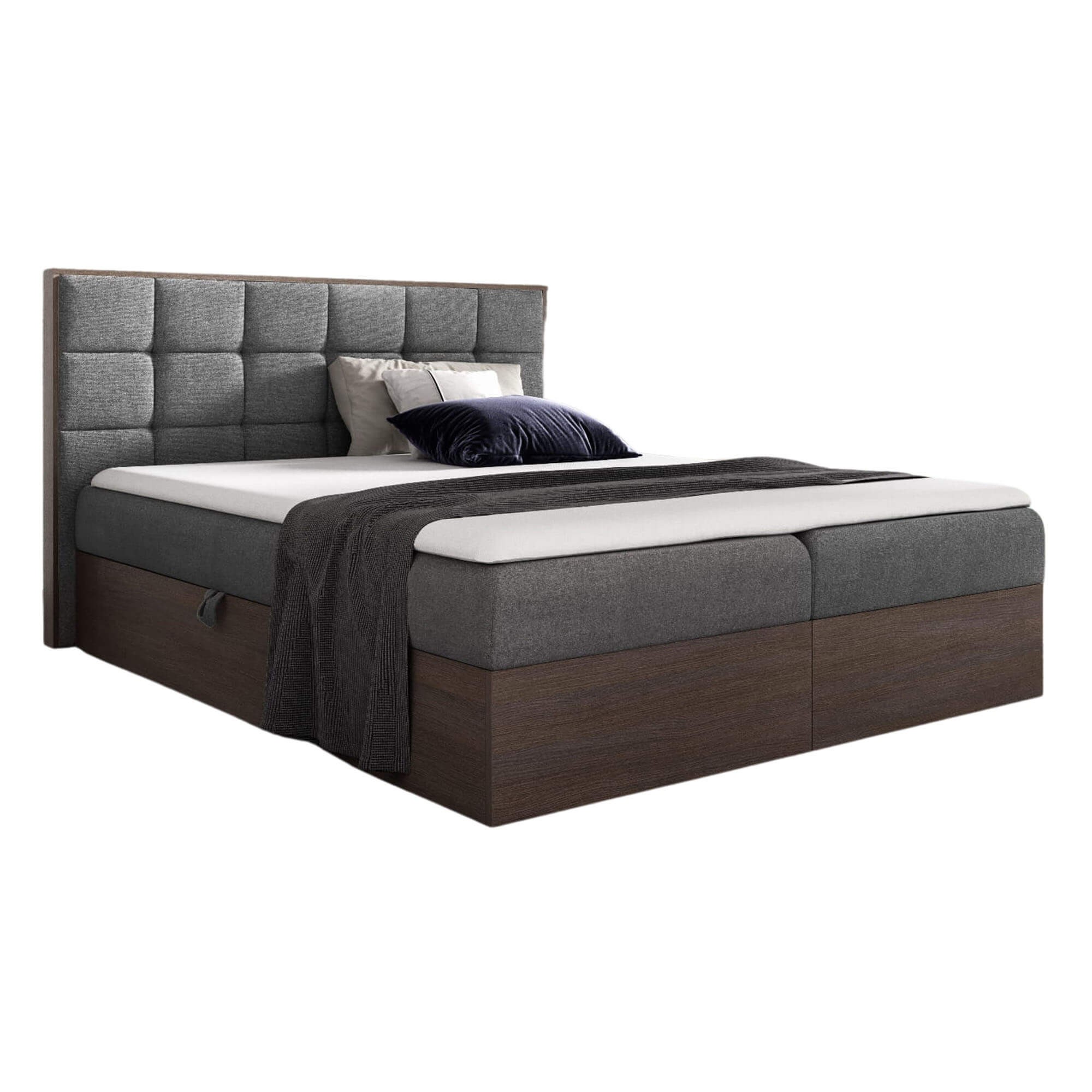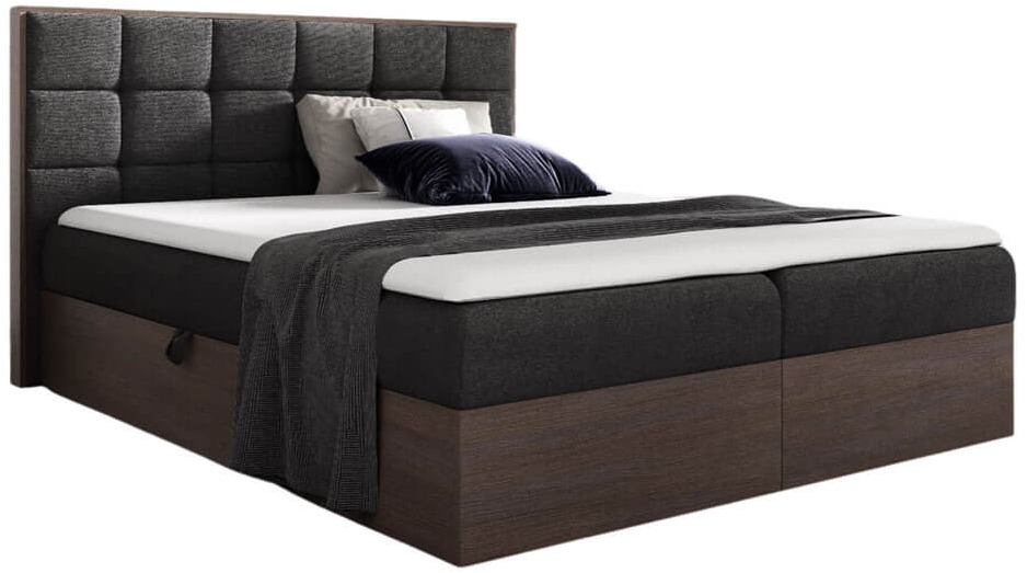 Łóżko kontynentalne WOOD 1 w kolorze dąb ciemny to propozycja dla osób ceniących wygodę i funkcjonalność w nowoczesnej formie. Dzięki kompaktowym wymiarom 120x200 cm idealnie sprawdzi się w mniejszych sypialniach, pokojach gościnnych lub kawalerkach, zapewniając jednocześnie wysoki komfort snu. Wyposażone w dwa pojemniki na pościel, łóżko oferuje praktyczne miejsce do przechowywania, a sprężynowy automat znacząco ułatwia ich otwieranie. Materac bonellowy zapewnia elastyczne podparcie i odpowiednią cyrkulację powietrza, natomiast topper z pianki T25 o wysokości 4 cm dodaje miękkości i zwiększa komfort codziennego wypoczynku. Stabilna konstrukcja łóżka opiera się na plastikowych ślizgach zamiast tradycyjnych nóżek, co nadaje mu nowoczesny wygląd i pozwala chronić podłogę. Zagłowie oraz skrzynie wykonano z solidnej płyty laminowanej w kolorze dąb ciemny, co podkreśla elegancki, naturalny styl mebla. Dzięki możliwości wyboru tapicerki, łóżko WOOD 1 można dopasować do dowolnej aranżacji wnętrza. To praktyczny i estetyczny mebel, który łączy funkcjonalność z ponadczasowym designem, gwarantując wygodny sen każdego dnia.