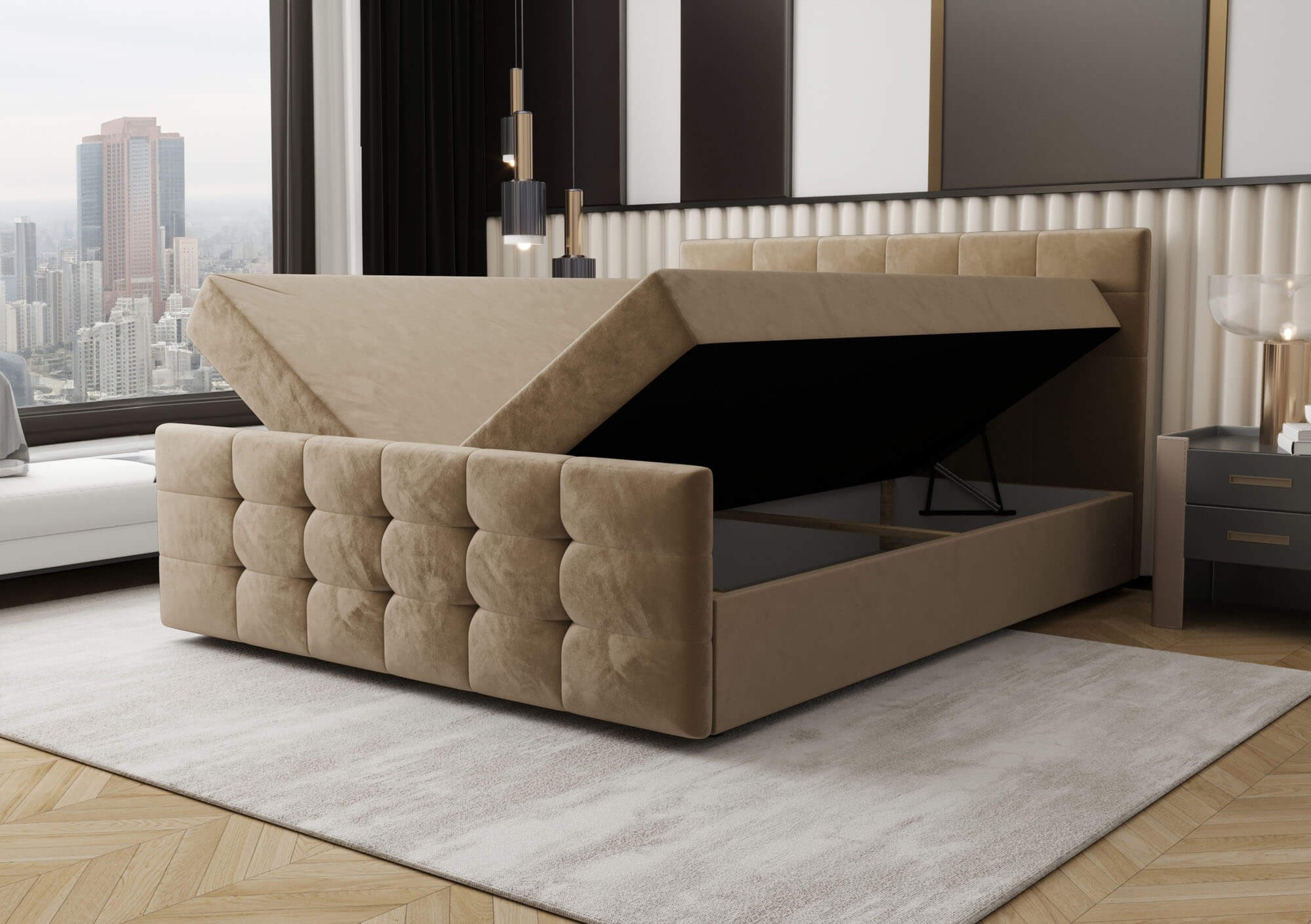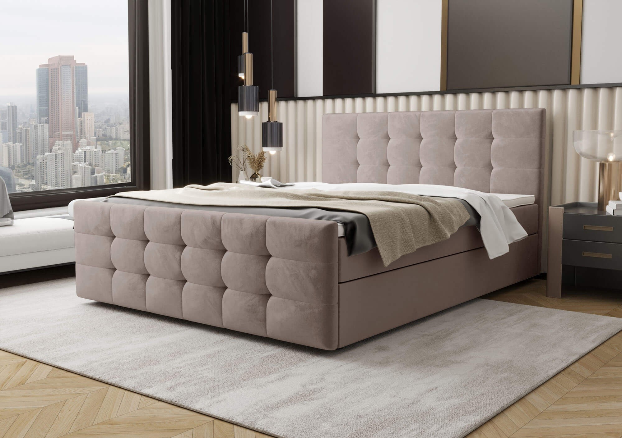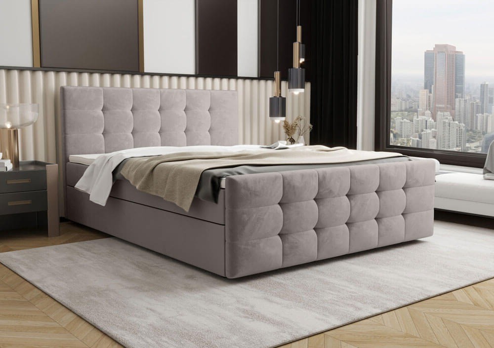 Łóżko kontynentalne z pojemnikiem CORA-2 o wymiarach 160x200 cm to idealna propozycja dla osób poszukujących eleganckiego mebla do sypialni, który łączy nowoczesny wygląd z praktycznymi rozwiązaniami. To nie tylko miejsce do snu, ale także przemyślany element wyposażenia wnętrza, który zapewni wygodę na co dzień i stworzy wyjątkowy klimat w każdej aranżacji. Dzięki swojej solidnej konstrukcji wykonanej z połączenia drewna i płyty meblowej, model CORA-2 gwarantuje stabilność i trwałość użytkowania przez długie lata. Łóżko zostało wyposażone w niezawodny mechanizm podnoszenia ze wspomaganiem gazowym, który umożliwia szybki i wygodny dostęp do pojemnego schowka znajdującego się pod stelażem. To idealne rozwiązanie do przechowywania pościeli, koców, poduszek czy innych domowych tekstyliów, bez konieczności zajmowania dodatkowej przestrzeni. Tapicerowane przyjemnym w dotyku welurem, łóżko zachwyca swoim luksusowym wykończeniem, które wprowadza do wnętrza ciepło i przytulność. Wezgłowie oraz front łóżka ozdobione są eleganckim pikowaniem w geometryczne kwadraty, które nadają całości wyjątkowego charakteru i podkreślają dbałość o detale. Zabudowana forma podstawy, pozbawiona widocznych nóżek, sprawia, że mebel prezentuje się nowocześnie i estetycznie, jednocześnie zachowując pełną funkcjonalność. Dyskretnie wkomponowane uchwyty umożliwiają bezproblemowe otwieranie stelaża, nie zaburzając jednocześnie spójnego wyglądu bryły. Model CORA-2 w rozmiarze 160x200 cm to nie tylko komfortowy wybór dla par, ale także stylowy akcent w każdej sypialni. Dostępność szerokiej gamy kolorów pozwala dopasować łóżko do indywidualnych preferencji i charakteru wnętrza. To mebel, który łączy wygodę, praktyczność i wyrafinowaną estetykę, spełniając oczekiwania nawet najbardziej wymagających użytkowników. Jeśli szukasz łóżka, które zapewni Ci wygodny sen i będzie pięknie prezentować się przez lata, CORA-2 to wybór, który naprawdę warto rozważyć.