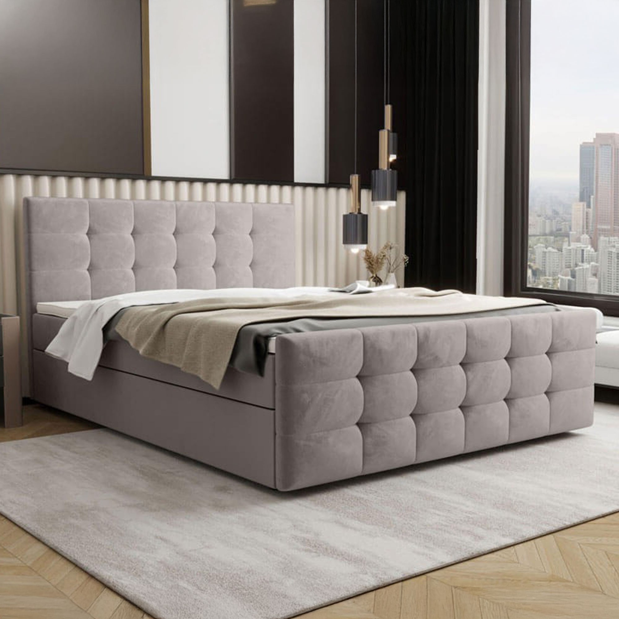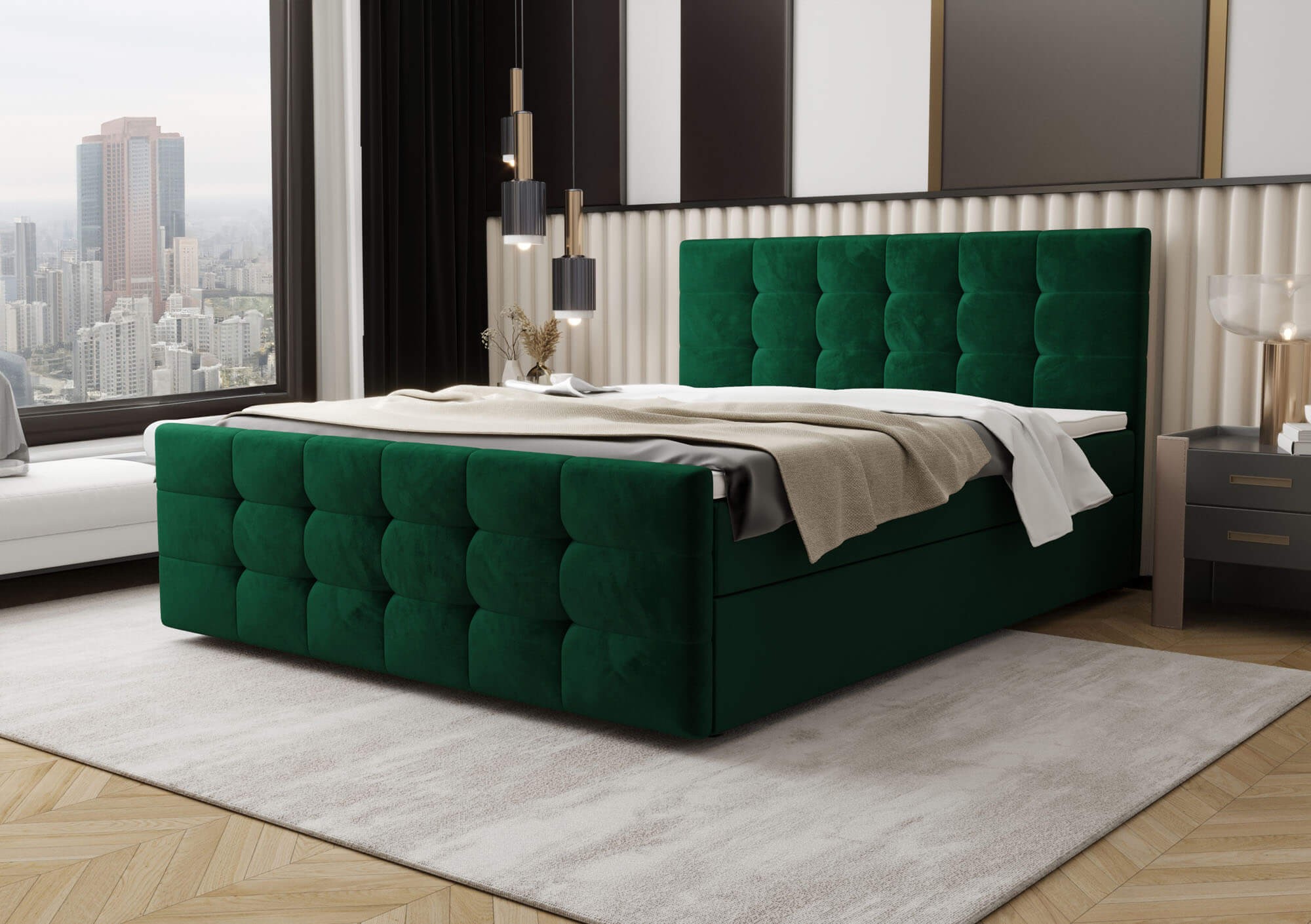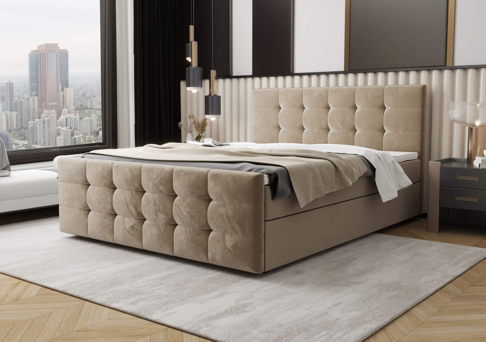 Łóżko kontynentalne z pojemnikiem CORA-2 o wymiarach 160x200 cm to idealna propozycja dla osób poszukujących eleganckiego mebla do sypialni, który łączy nowoczesny wygląd z praktycznymi rozwiązaniami. To nie tylko miejsce do snu, ale także przemyślany element wyposażenia wnętrza, który zapewni wygodę na co dzień i stworzy wyjątkowy klimat w każdej aranżacji. Dzięki swojej solidnej konstrukcji wykonanej z połączenia drewna i płyty meblowej, model CORA-2 gwarantuje stabilność i trwałość użytkowania przez długie lata. Łóżko zostało wyposażone w niezawodny mechanizm podnoszenia ze wspomaganiem gazowym, który umożliwia szybki i wygodny dostęp do pojemnego schowka znajdującego się pod stelażem. To idealne rozwiązanie do przechowywania pościeli, koców, poduszek czy innych domowych tekstyliów, bez konieczności zajmowania dodatkowej przestrzeni. Tapicerowane przyjemnym w dotyku welurem, łóżko zachwyca swoim luksusowym wykończeniem, które wprowadza do wnętrza ciepło i przytulność. Wezgłowie oraz front łóżka ozdobione są eleganckim pikowaniem w geometryczne kwadraty, które nadają całości wyjątkowego charakteru i podkreślają dbałość o detale. Zabudowana forma podstawy, pozbawiona widocznych nóżek, sprawia, że mebel prezentuje się nowocześnie i estetycznie, jednocześnie zachowując pełną funkcjonalność. Dyskretnie wkomponowane uchwyty umożliwiają bezproblemowe otwieranie stelaża, nie zaburzając jednocześnie spójnego wyglądu bryły. Model CORA-2 w rozmiarze 160x200 cm to nie tylko komfortowy wybór dla par, ale także stylowy akcent w każdej sypialni. Dostępność szerokiej gamy kolorów pozwala dopasować łóżko do indywidualnych preferencji i charakteru wnętrza. To mebel, który łączy wygodę, praktyczność i wyrafinowaną estetykę, spełniając oczekiwania nawet najbardziej wymagających użytkowników. Jeśli szukasz łóżka, które zapewni Ci wygodny sen i będzie pięknie prezentować się przez lata, CORA-2 to wybór, który naprawdę warto rozważyć.