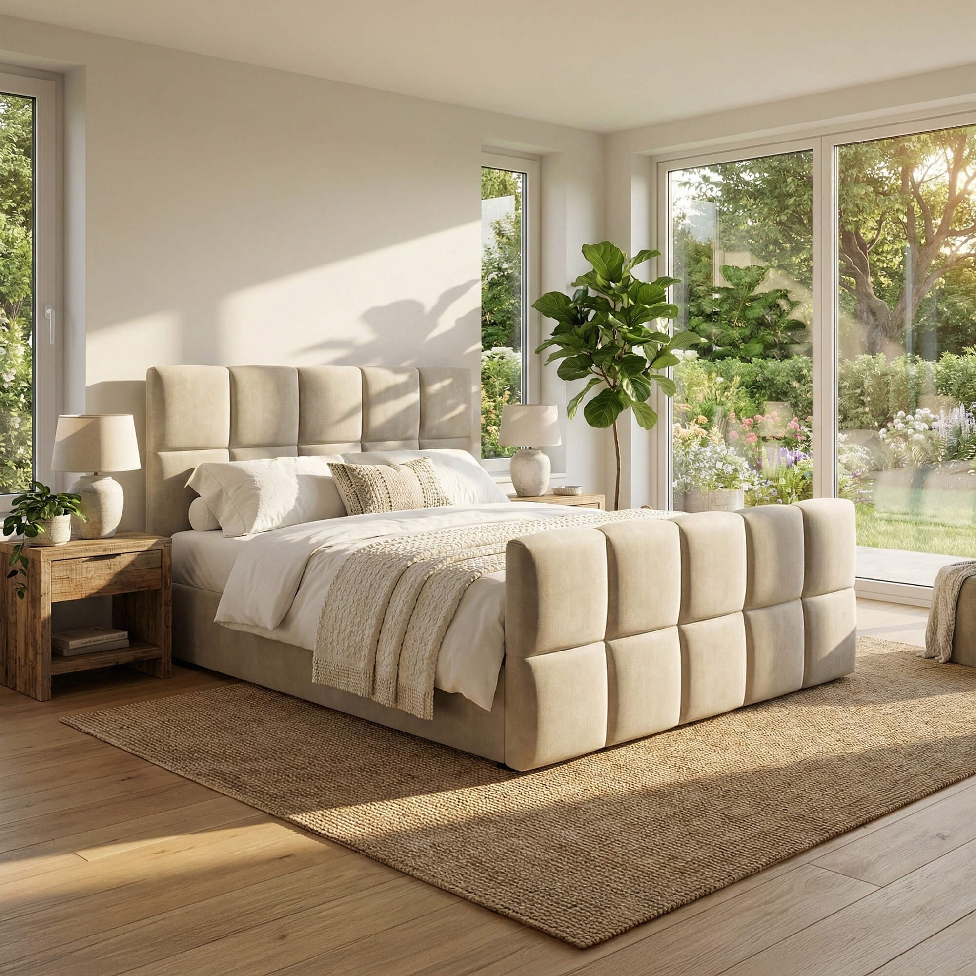 • Łóżko kontynentalne z pojemnikami na pościel i eleganckim wzorem
