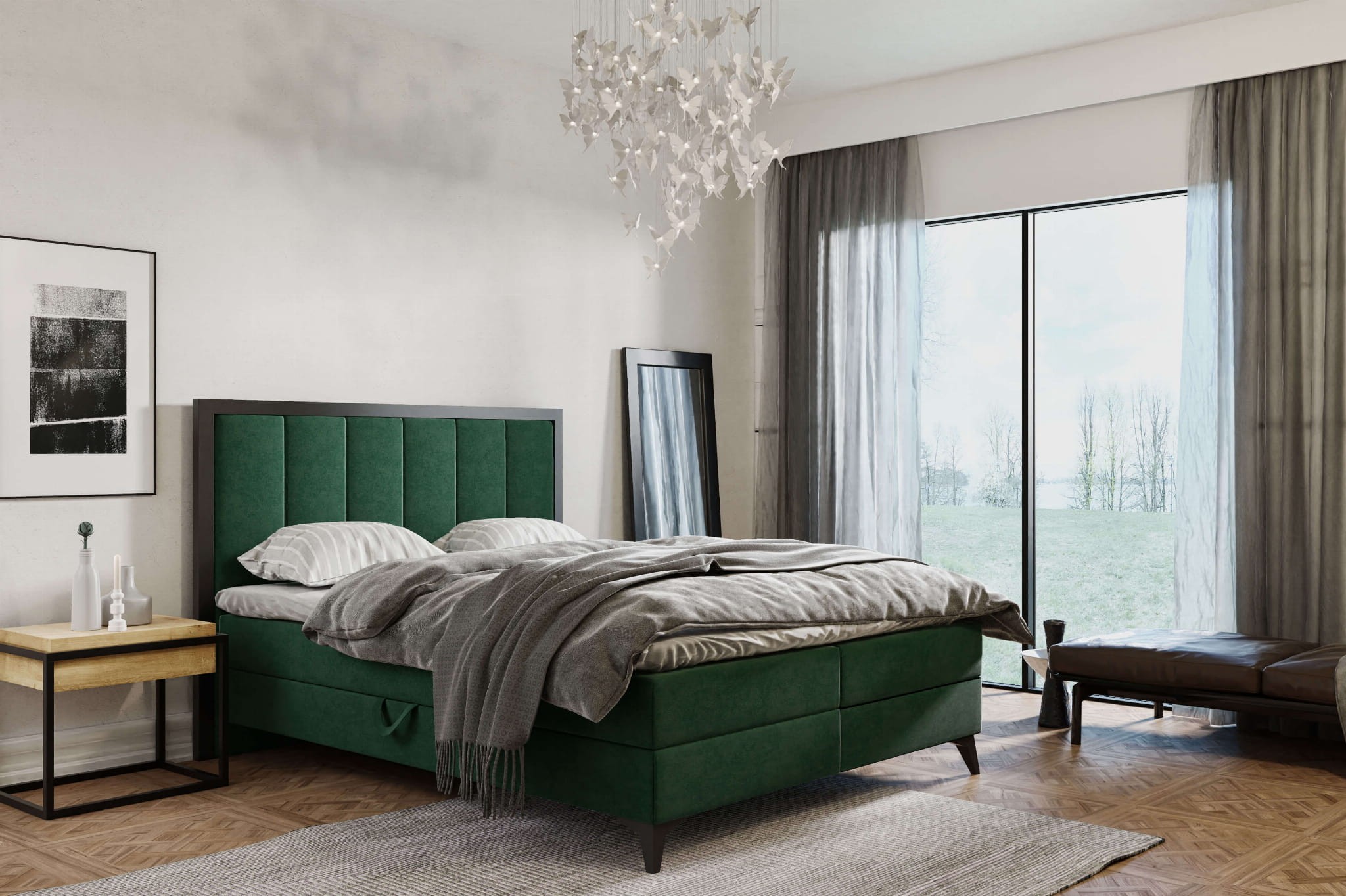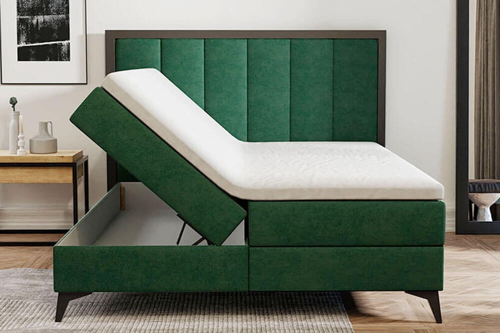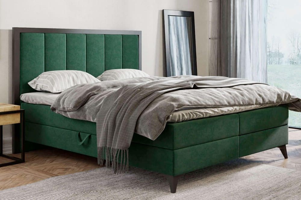 Niezwykle stylowe, komfortowe łóżko kontynentalne 160x200 z dwoma pojemnikami na pościel! Mebel zachwyca wygodą, jest idealnym miejscem do spania, a w dodatku jest świetną opcją dla osób szukających trochę dodatkowej przestrzeni do przechowywania. Pojemniki otwierane są z dwóch stron łóżka za pomocą materiałowych uchwytów. Specjalne mechanizmy umieszczone w konstrukcji łóżka ułatwiają otwieranie i zamykanie pojemnika. Podstawę łóżka tworzy materac ze sprężyn bonellowych lub kieszeniowych (do wyboru przez klienta). Proponujemy zakup gotowego kompletu łóżka z warstwą wierzchnią – topperem z wysokoelastycznej pianki T25 lub VISCO. Kolejnym atutem łóżka LOFT jest ciekawy wygląd, który doskonale wpisze się w klimat loftowym lub industrialny. Do wyboru wyjątkowej jakości tkaniny obiciowe i kolory, które świetnie skomponują się z czarnymi nóżkami i wstawką. Wysokie nóżki dodają oczywiście pazura, lekkości dużej konstrukcji łóżka, a także ułatwiają zachowanie porządku pod meblem.