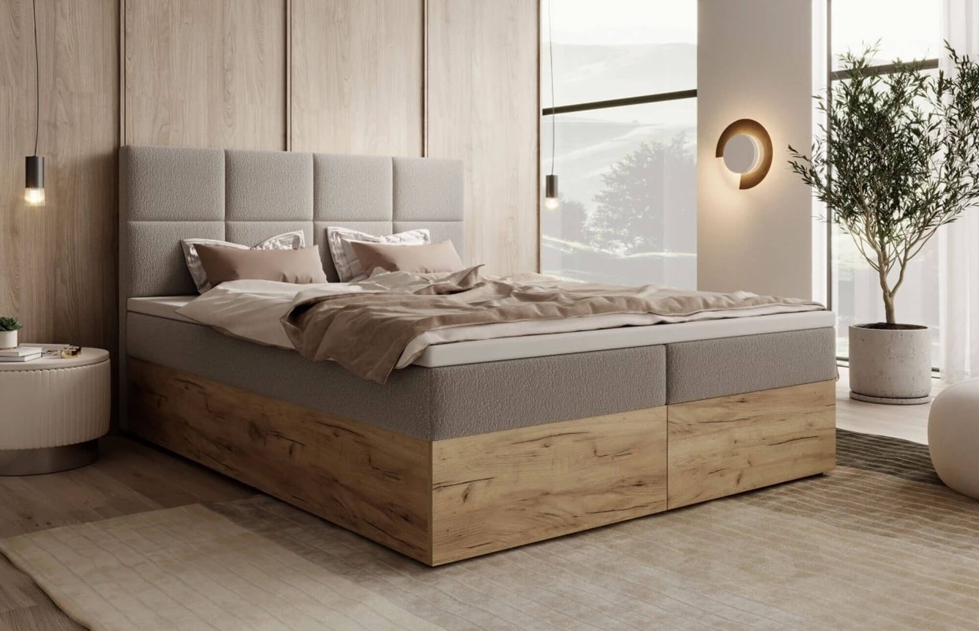 Łóżko kontynentalne MADISON 140x200 to połączenie elegancji, nowoczesności i wygody. Jego wyjątkowy design z ozdobnym zagłówkiem i subtelnymi przeszyciami nadaje wnętrzu luksusowego charakteru. To mebel, który doskonale wpisuje się w aktualne trendy aranżacyjne, łącząc styl z funkcjonalnością. Konstrukcja z litego drewna gwarantuje trwałość i stabilność przez wiele lat użytkowania. Dwa duże pojemniki w kolorze craft złoty to praktyczne rozwiązanie, które pozwala utrzymać porządek w sypialni i przechowywać pościel lub inne akcesoria. Automaty sprężynowe ułatwiają podnoszenie, dzięki czemu łóżko jest lekkie i wygodne w obsłudze. Wysokość spania wynosząca około 55 cm zwiększa komfort codziennego użytkowania, zwłaszcza dla osób starszych lub mających problemy z kręgosłupem. Łóżko kontynentalne MADISON 140x200 to idealny wybór dla tych, którzy szukają połączenia nowoczesnego designu, praktyczności i komfortu snu na najwyższym poziomie.
