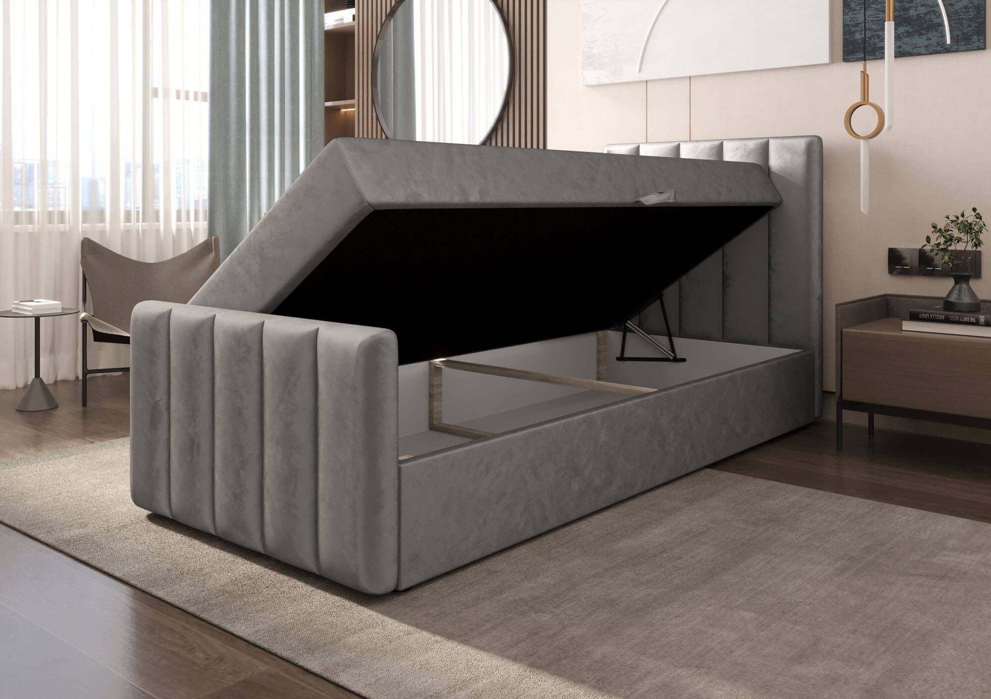 Łóżko kontynentalne z pojemnikiem NOX o wymiarach 90x200 cm to propozycja dla osób ceniących wysoki komfort snu, nowoczesne wzornictwo oraz funkcjonalne rozwiązania do przechowywania. Jego starannie zaprojektowana konstrukcja wyróżnia się eleganckim wyglądem, który doskonale wpisuje się zarówno w klasyczne, jak i współczesne aranżacje sypialni. Całość obita jest miękką tkaniną, która nadaje łóżku wyjątkowo przytulny charakter i sprawia, że prezentuje się niezwykle stylowo w każdej przestrzeni. Zintegrowane, tapicerowane wezgłowie ozdobione zostało pionowymi przeszyciami, co podkreśla jego nowoczesną formę i zapewnia wygodne oparcie podczas odpoczynku lub wieczornego czytania. Model NOX wyposażony został w funkcjonalny pojemnik na pościel, który doskonale sprawdza się w codziennym użytkowaniu – pomieści kołdry, poduszki, koce czy inne tekstylia, pomagając utrzymać porządek w sypialni. System automatycznych podnośników gazowych umożliwia łatwe i bezproblemowe otwieranie stelaża, dzięki czemu dostęp do wnętrza łóżka jest szybki i wygodny. Całość wsparta jest na solidnej ramie wykonanej z trwałych materiałów, co gwarantuje stabilność, bezpieczeństwo i długowieczność mebla. Łóżko kontynentalne NOX 90x200 cm to idealne rozwiązanie do pokoju młodzieżowego, gościnnego lub dla jednej osoby, która oczekuje od mebla nie tylko estetyki, ale i praktycznego zastosowania. Jego ponadczasowy styl, wysoka jakość wykonania oraz przemyślane detale sprawiają, że będzie to inwestycja w komfort i elegancję na długie lata. Jeśli szukasz łóżka z pojemnikiem, które łączy wygodę snu z nowoczesnym wyglądem – model NOX spełni Twoje oczekiwania.