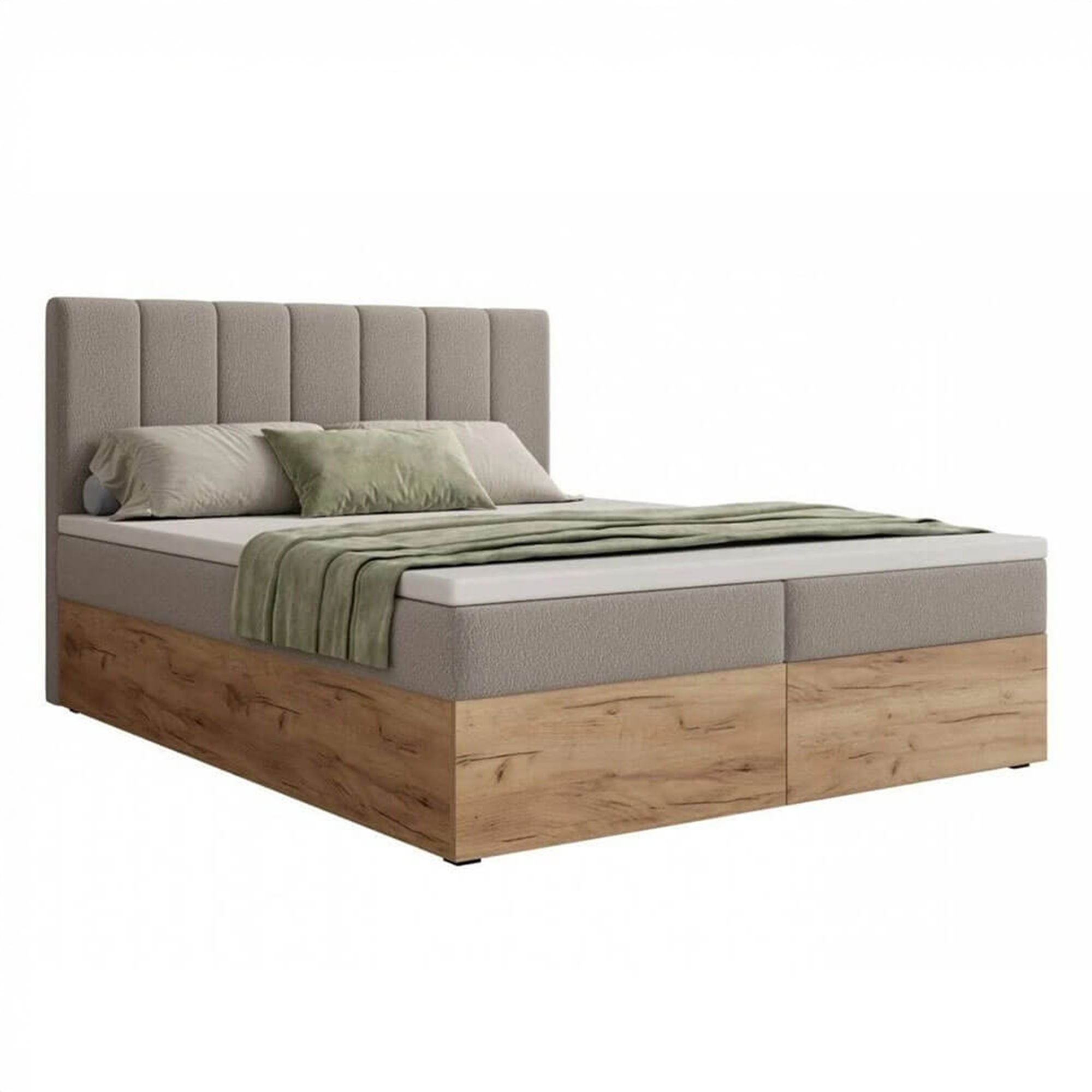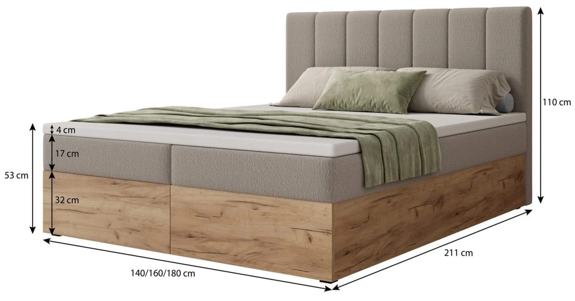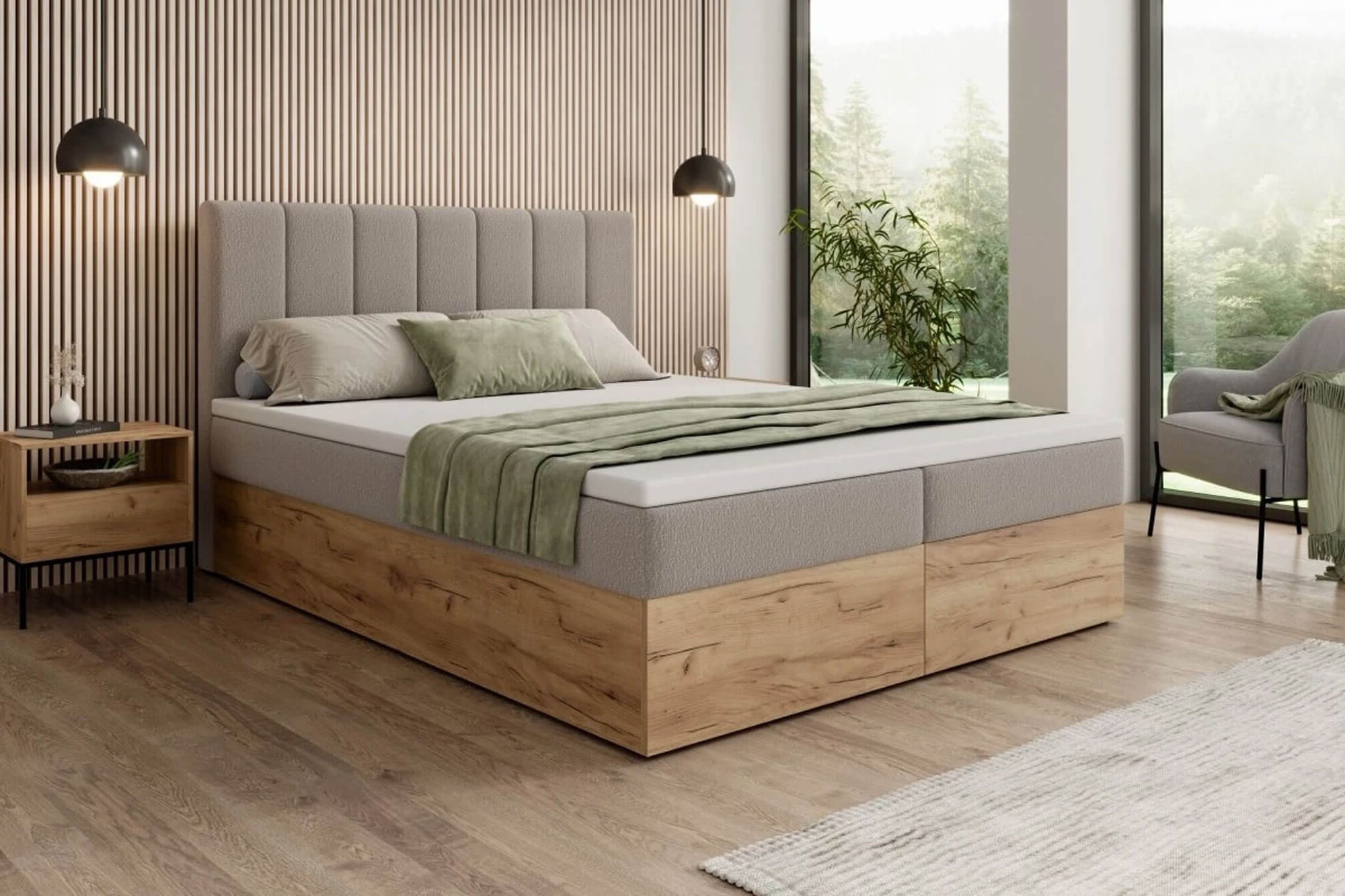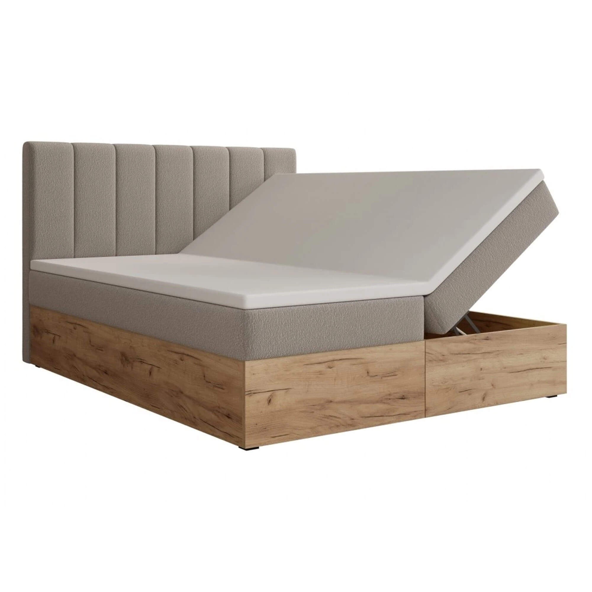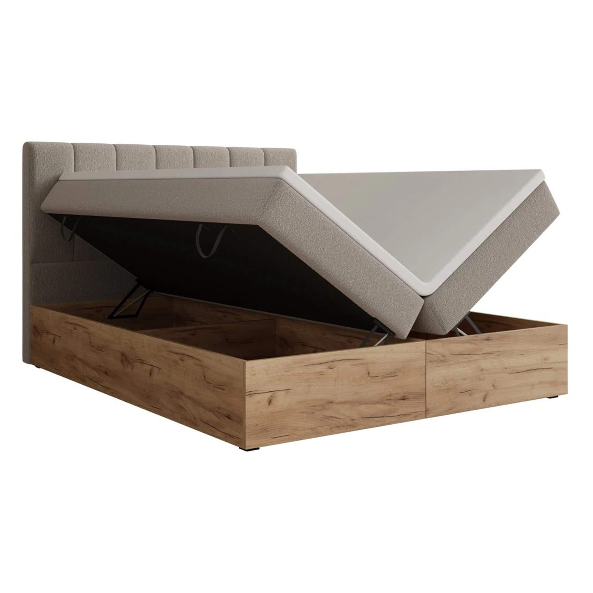 Rama wykonana z litego drewna gwarantuje solidność, a dwa pojemne schowki w kolorze craft złoty zapewniają dodatkowe miejsce do przechowywania. Zastosowane automaty sprężynowe ułatwiają podnoszenie, co sprawia, że użytkowanie łóżka jest lekkie i wygodne.