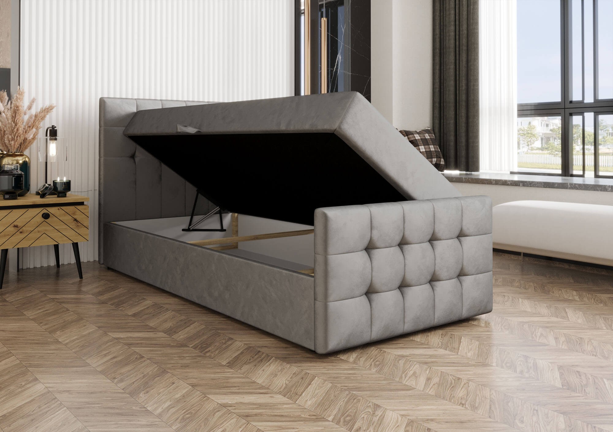 Łóżko kontynentalne z pojemnikiem VOX o wymiarach 80x200 cm to idealna propozycja dla osób poszukujących funkcjonalnego, stylowego i wygodnego mebla do nowoczesnej sypialni, pokoju młodzieżowego lub gościnnego. Jego konstrukcja została w całości starannie tapicerowana, co nadaje łóżku wyjątkowo elegancki i przytulny charakter. Model VOX wyróżnia się efektownymi pikowaniami, które zdobią zarówno wysokie, zintegrowane wezgłowie, jak i przednią część łóżka, tworząc spójną i harmonijną całość. To wykończenie nie tylko przyciąga wzrok, ale także podkreśla nowoczesny design mebla, doskonale wpisując się w aktualne trendy wnętrzarskie. Funkcjonalność łóżka VOX podnosi praktyczny pojemnik na pościel, ukryty pod stelażem, który zapewnia dodatkową przestrzeń do przechowywania kołder, poduszek czy tekstyliów. Dzięki zastosowaniu podnośników gazowych dostęp do wnętrza łóżka jest szybki i wygodny, a cały mechanizm działa płynnie i bezproblemowo. Stabilność i trwałość konstrukcji gwarantuje solidna rama wykonana z wytrzymałych materiałów, co sprawia, że łóżko sprawdzi się doskonale w codziennym użytkowaniu i posłuży przez wiele lat. Kompaktowy rozmiar 80x200 cm czyni je idealnym rozwiązaniem dla jednej osoby, nie rezygnując przy tym z komfortu i estetyki. Model VOX to połączenie nowoczesnej formy, praktyczności i dopracowanego detalu, które uczyni każde wnętrze bardziej stylowym i funkcjonalnym.