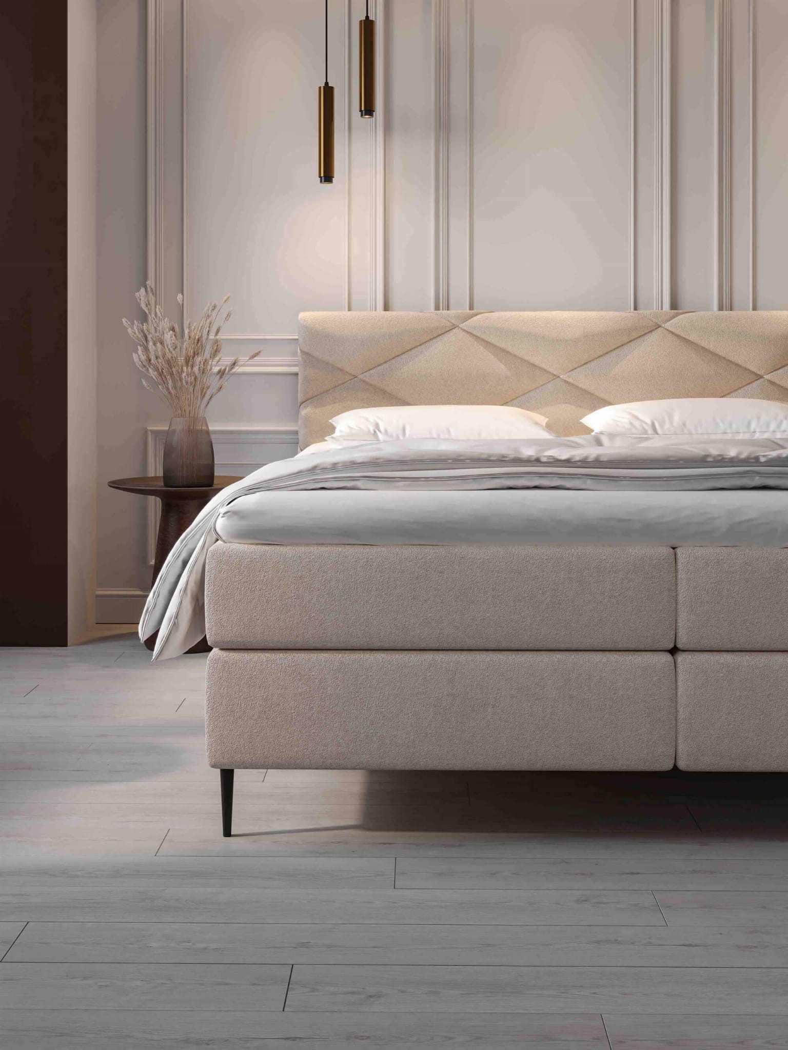 Poszukujesz idealnego łóżka? Twoja sypialnia może stać się wyjątkowa dzięki SENO – podwójnej warstwie materacy i przepięknym oparciu z przeszyciami w kształcie rombów. To łóżko o wyjątkowej wygodzie posiada wbudowany 7-strefowy materac wykonany ze sprężyn kieszeniowych, w których każda sprężyna pracuje niezależnie od siebie, dając idealne podparcie w każdym punkcie oraz topper, czyli materac nawierzchniowy wykonany z pianki wysokoelastycznej o wysokiej gęstości, a dodatkowo ubrany w specjalny pokrowiec pikowany dający bardzo miękką i miłą dla ciała powierzchnię. Zamki błyskawiczne ułatwiają ściąganie pokrowca do prania i zachowania pełnej higieny, co docenią wszyscy cierpiący na alergie. Tak zastosowane warstwy łóżka pomagają zachować naturalną linię kręgosłupa podczas snu, a to zdecydowanie poprawia krążenie, odprężenie i regenerację mięśni. Jeśli szukasz więc łóżka 160x200 o właściwościach ortopedycznych, ten model sprawdzi się idealnie. Dzięki możliwości prania pokrowca możesz także spokojnie zasypiać czując ulubiony zapach prania i świeżość. Duże oparcie z pięknym, starannie wykonanymi przeszyciami w kształcie rombów otoczy Twoje ciało podczas wypoczynku z książką czy oglądając film i pozwoli się zrelaksować na co dzień. Dodatkowym atutem są pojemniki na pościel otwierane od boków, które posłużą dodatkowym miejscem do przechowywania oraz smukłe nóżki zapewniające ciekawy efekt wizualny. Całość w standardowym, dwuosobowym rozmiarze 160x200 to doskonały wybór do sypialni hotelowej, małżeńskiej czy każdej innej przestrzeni, w której marzysz, by idealnie się zrelaksować.