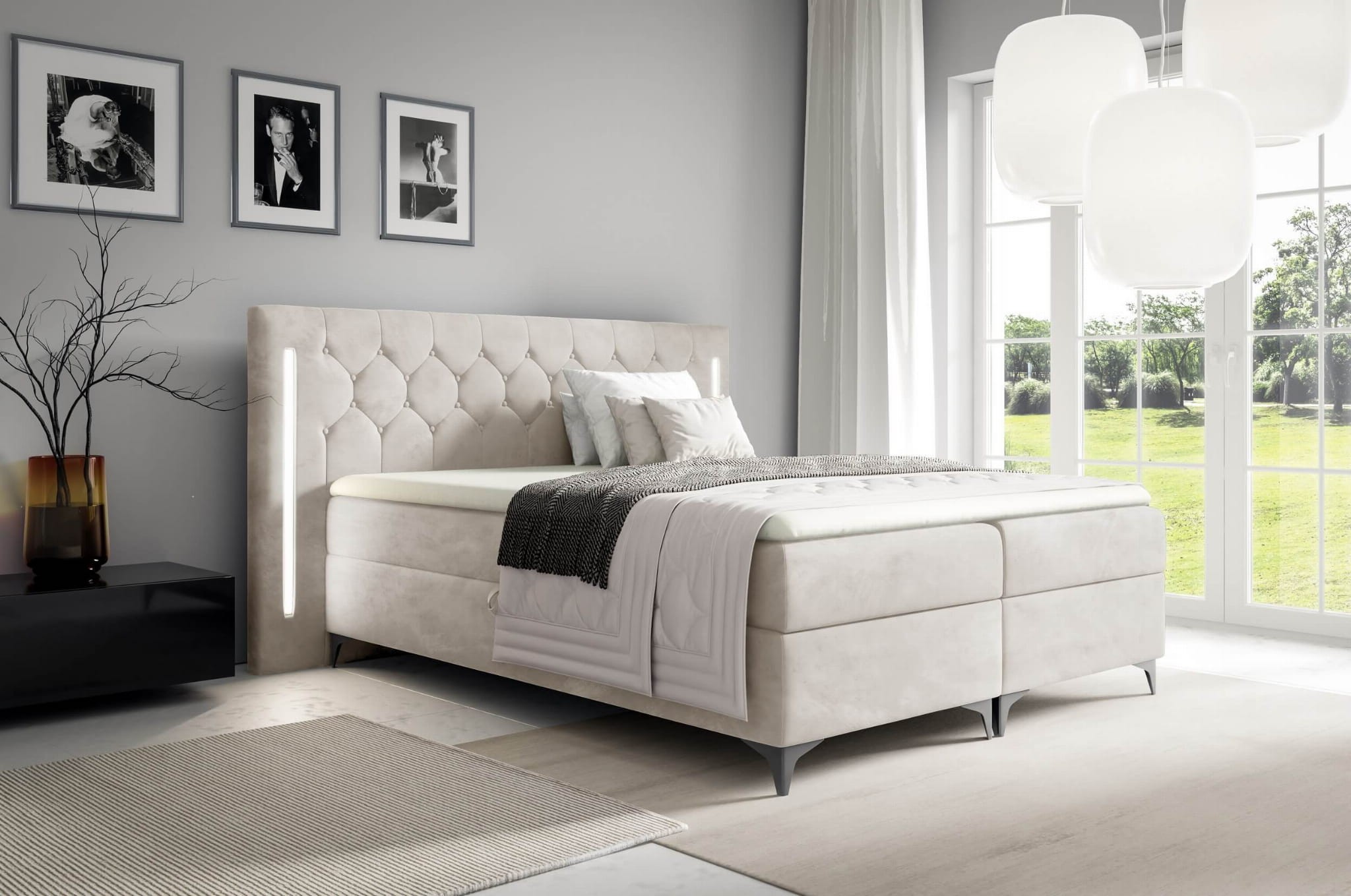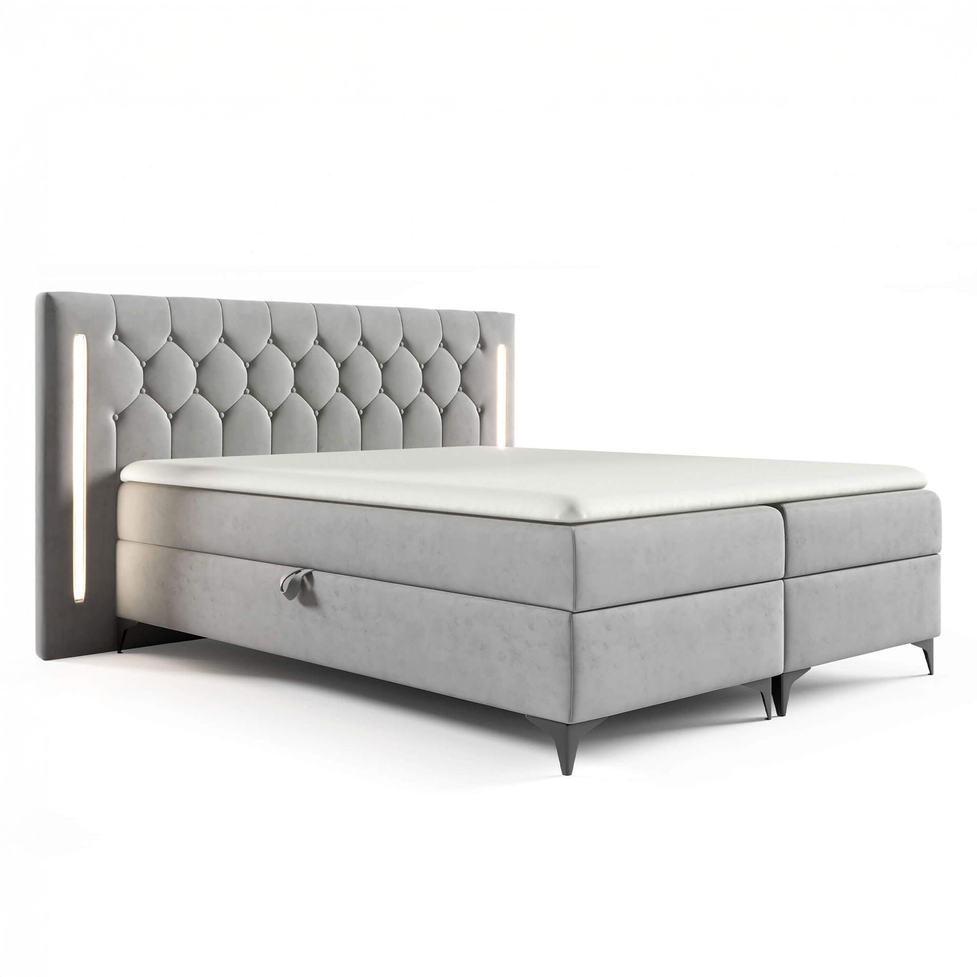 Nowoczesna sypialnia to doskonałe miejsce na łóżko kontynentalne CALIFORNIA! Szeroki, dekoracyjny pikowany zagłówek z guzikami i wbudowanym oświetleniem LED to pierwsze, co przykuwa uwagę. Tworzy doskonały akcent w sypialni, ale również wygodne miejsce, by oprzeć się z dobrą książką, filmem czy poranną kawą. Klimatyczne oświetlenie będzie sprzyjać odprężeniu i doda sypialni klimatu. Spory rozmiar powierzchni spania 180x200cm to opcja, która sprawdzi się w niemal każdej sypialni dla dwóch osób. Wielopoziomowa konstrukcja złożona z materaca wypełnionego sprężynami bonellowymi i pianki wysokoelastycznej oraz toppera o grubości 4cm jest bardzo wygodna i komfortowa, bowiem każdego dnia ułatwia wstawanie oraz zasypianie. W podstawie łóżka kontynentalnego umieszczony jest również praktyczny pojemnik na pościel podzielony na dwie części, a każdą z nich można niezależnie otwierać od boku mebla. Całość wspierają metalowe czarne nóżki w ciekawym kształcie, które dodają nowoczesnego charakteru i wizualnie zmniejszają masywną formę mebla.