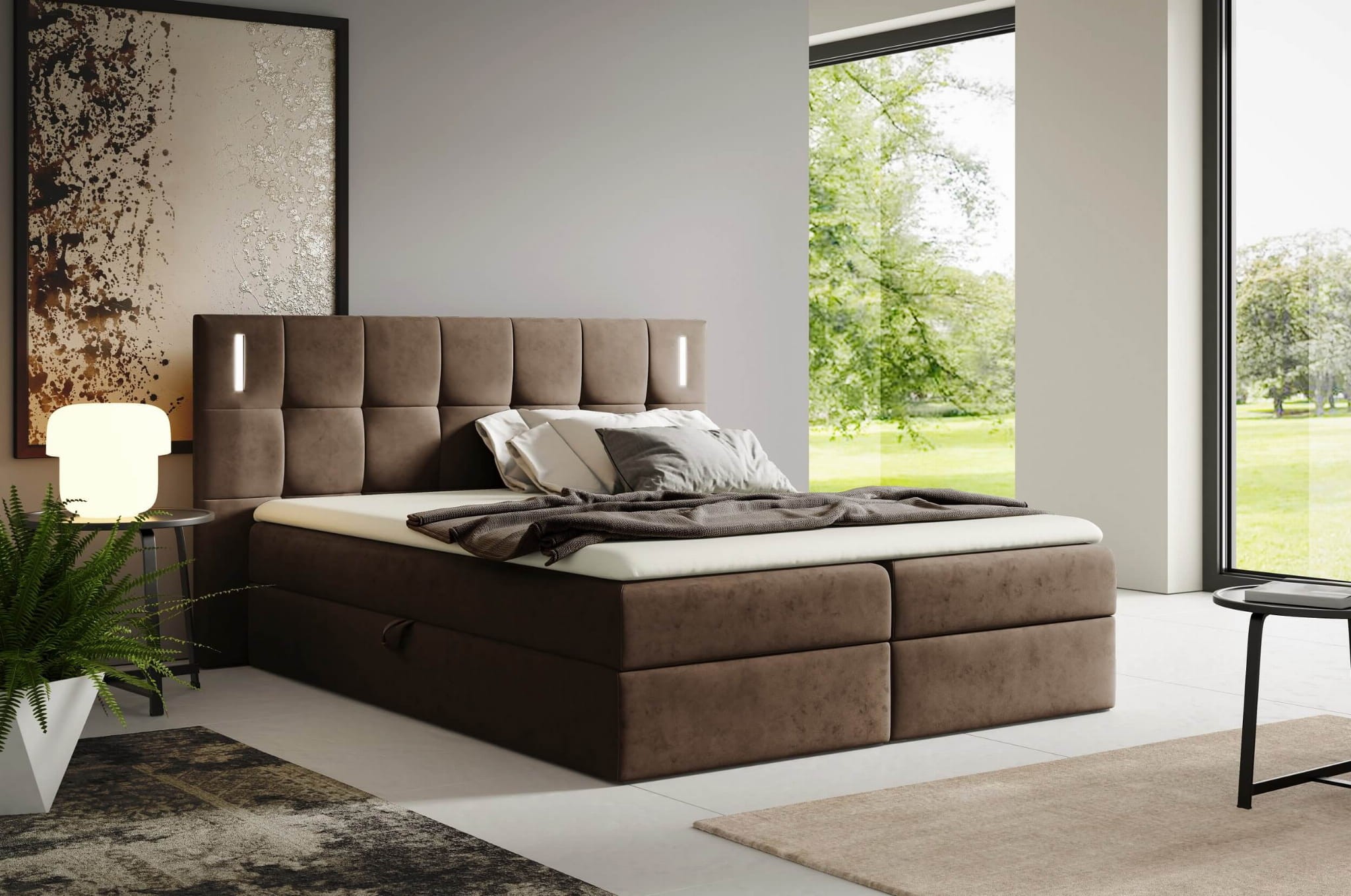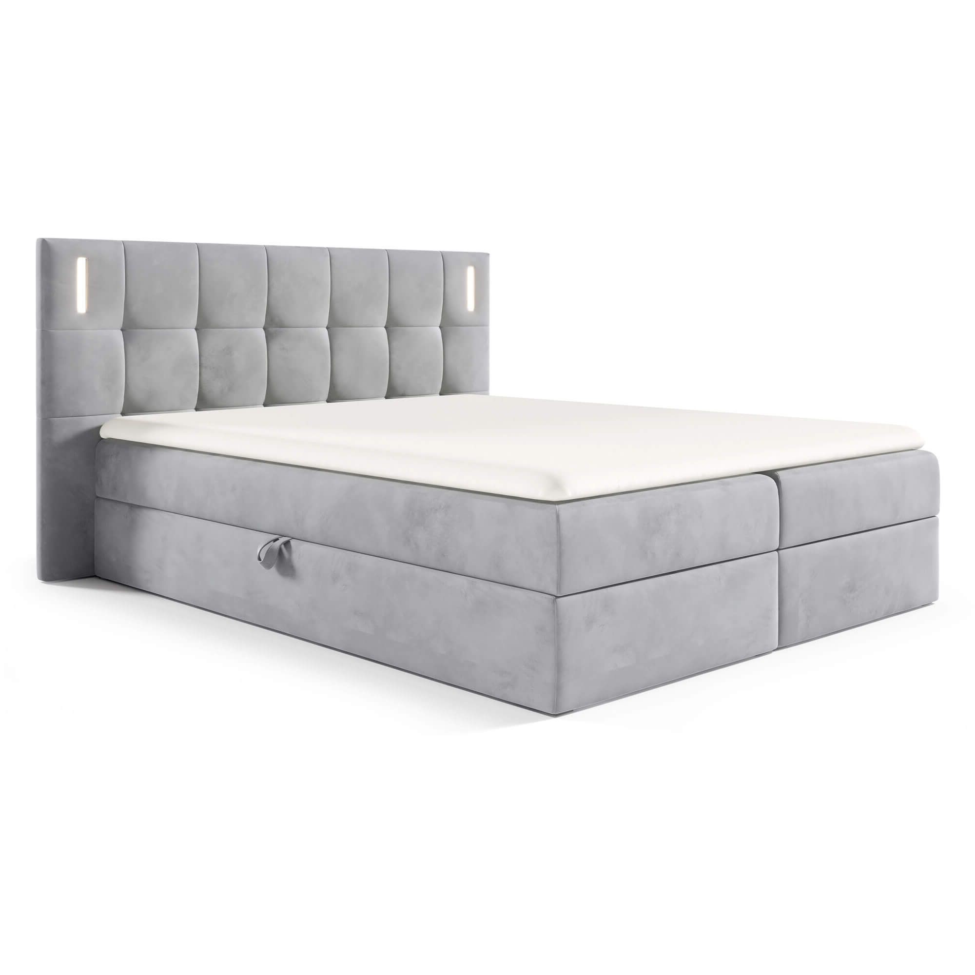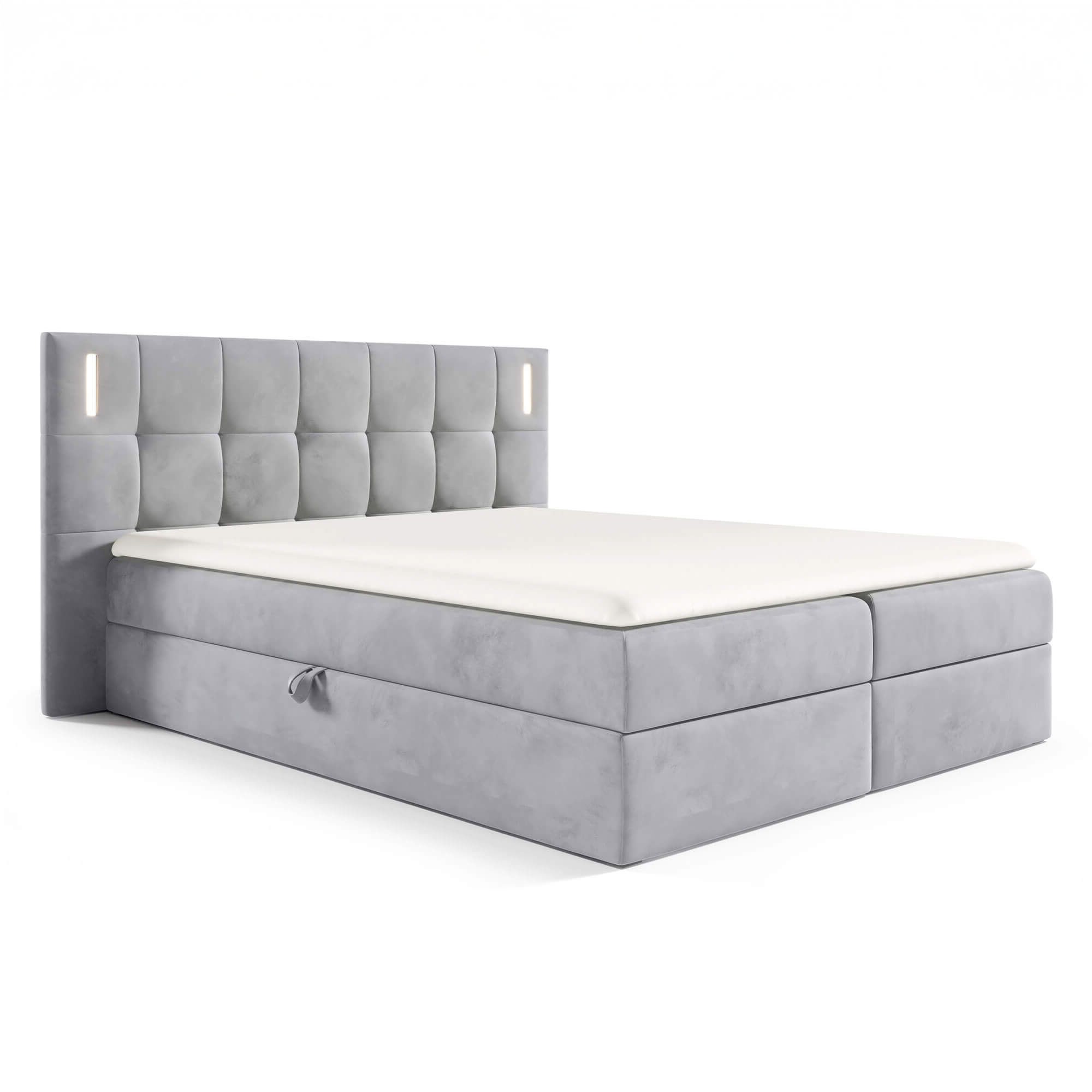Szukasz łóżka w nowoczesnym stylu? Poznaj DENVER z wbudowanym oświetleniem LED sterowanym za pomocą dotyku i szerokim zagłówkiem! Kontynentalna wielopoziomowa konstrukcja składa się z materaca bazowego wypełnionego sprężynami bonellowymi i pianką oraz toppera o grubości 4cm, który idealnie dopasowuje się do kształtu ciała, zapewniając wygodny i przyjemny sen, a podświetlenie Led, które zostało zamontowane na oparciu sprawi, że zapanuje przyjemny nastrój. Funkcjonalność wspiera zintegrowany w podstawie pojemnik na pościel, który otwierany jest z dwóch stron łóżka za pomocą specjalnych uchwytów i automatów sprężynowych. To idealne rozwiązanie dla osób, które poszukują wygody i cenią sobie porządek w sypialni. Dzięki możliwości wyboru koloru oraz tkaniny obiciowej na łóżko, uczynisz swoją sypialnię elegancką i ponadczasową, a przede wszystkim zgodną z własnym wizją i gustem.