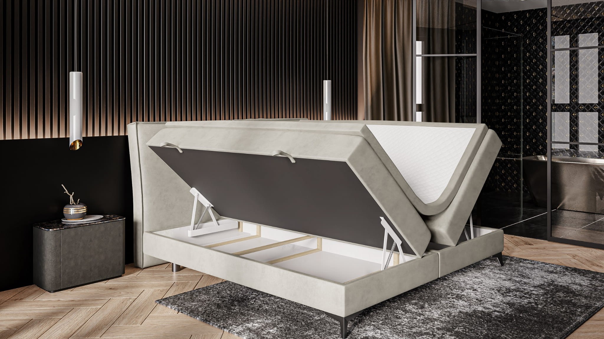 Chcesz nadać swojej sypialni nowoczesnego charakteru i nuty elegancji? Łóżko kontynentalne LOLLY o powierzchni spania 120x200 to idealne rozwiązanie! Duży wybór kolorystyczny pozwala na swobodę w aranżacji wnętrz oraz łatwe dopasowanie do gustu i preferencji. Przepiękne lamówki na wezgłowiu sprawiają, że oparcie wygląda jak miękkie poduszki zachęcające do wypoczynku. Wzbogacone ozdobnym szwem tworzą przepiękny efekt. Podstawa łóżka wykonana jest z solidnej płyty malowanej na biało, a kolejną warstwę tworzy materac bazowy ze sprężyn typu bonell i pianki T-25. W zestawie znajduje się również wygodny materac nawierzchniowy topper z bokami w kolorze tapicerki, ubrany w miękki pokrowiec z tkaniny Jersey. To łóżko LOLLY łączy funkcjonalność z estetyką. Posiada podwójny pojemnik na pościel otwierany od boków, co zwiększa komfort użytkowania i praktyczność. Całość uzupełniają oryginalne, metalowe nogi w czarnym kolorze o wysokości 13cm.