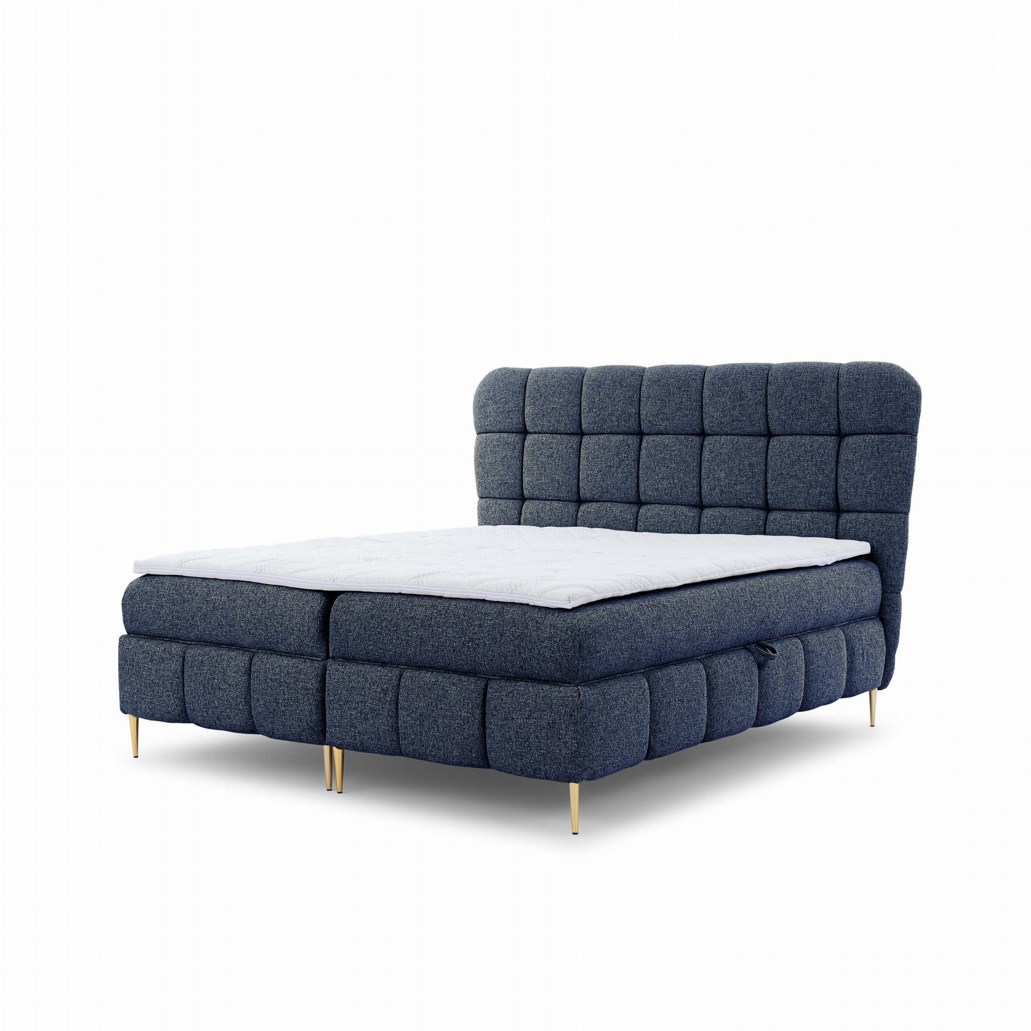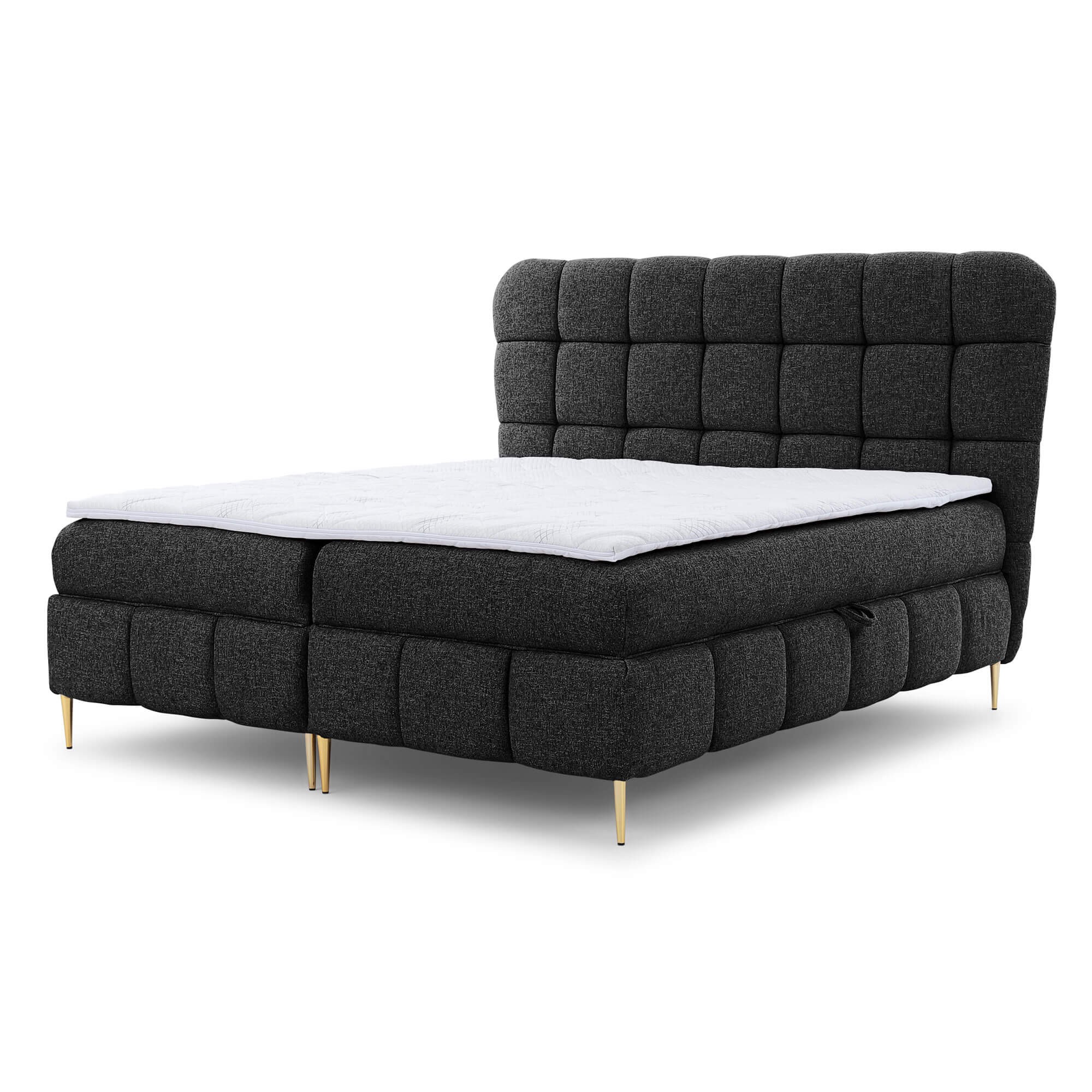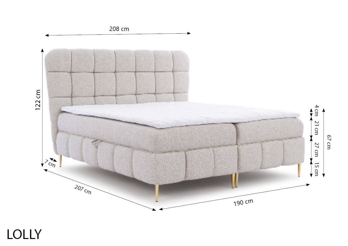Każda sypialnia potrzebuje wygodnego i komfortowego łóżka, w którym można zatopić się po pracowitym dniu. Przepiękny i oryginalny model LOLLY o standardowej powierzchni spania 160x200 to doskonałe rozwiązanie do niemal każdej sypialni! Mebel stanowi połączenie wyjątkowego stylu, głęboko i obficie spikowanej powierzchni i pulchnego i wygodnego oparcia do odprężenia się z ulubionym serialem. Wielopoziomowa konstrukcja złożona z głównego materaca ze sprężyn kieszeniowych pocket oraz wysokoelastycznej pianki zapewnia niesamowitą wygodę i ułatwienie podczas wstawania, a materac nawierzchniowy topper, który znajdziesz w komplecie, zapewnia komfort i dopasowanie do potrzeb. Design łóżka wzbogacają metalowe smukłe nóżki w eleganckim złotym kolorze, dodające bryle stabilności, równowagi i lekkości. Wraz z miękkim tapicerowanym obiciem przywodzi na myśl nowoczesny styl glamour. Funkcjonalność zapewnia natomiast praktyczny pojemnik na pościel otwierany od boków łóżka, co jest idealnym rozwiązaniem dla osób szukających nowoczesnego, przytulnego designu i dodatkowej przestrzeni do przechowywania.
