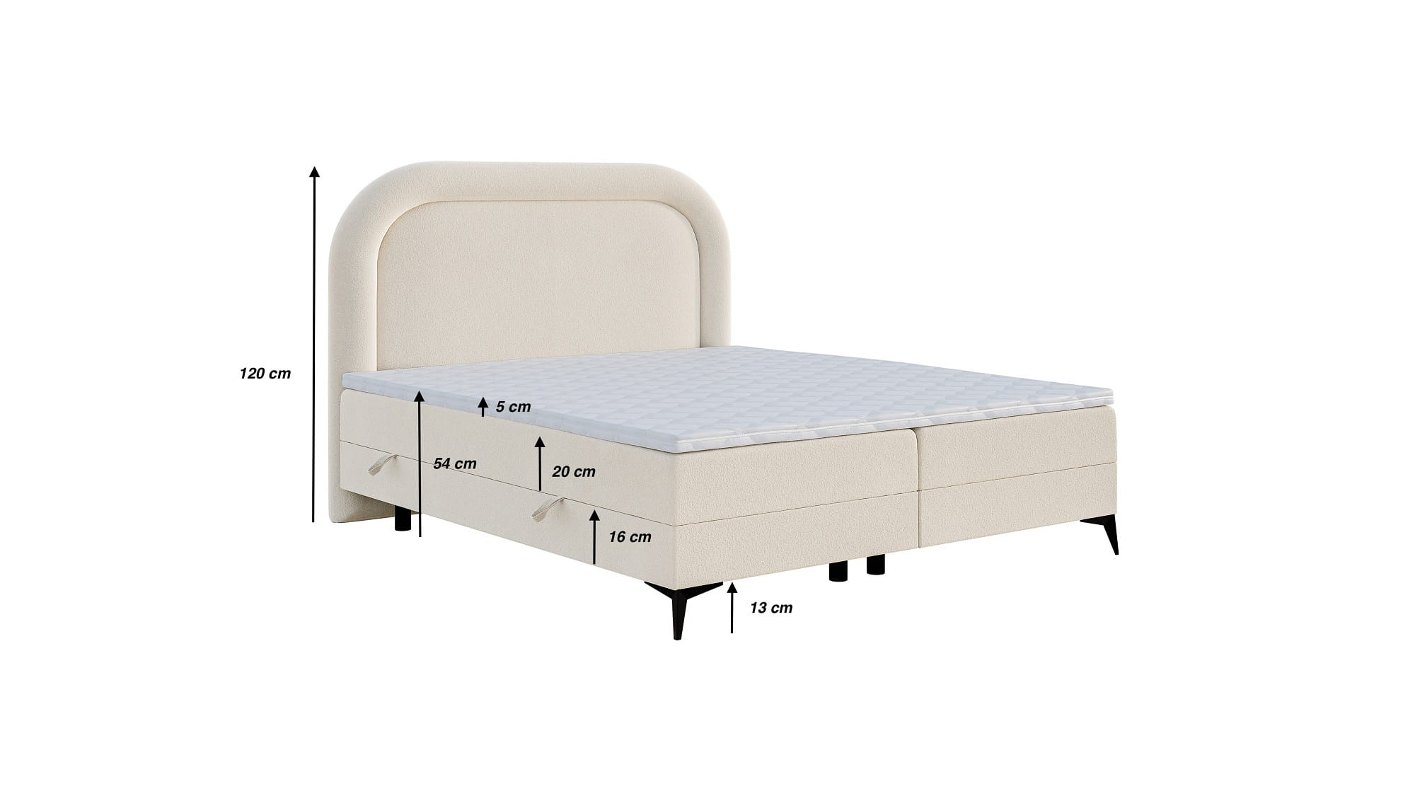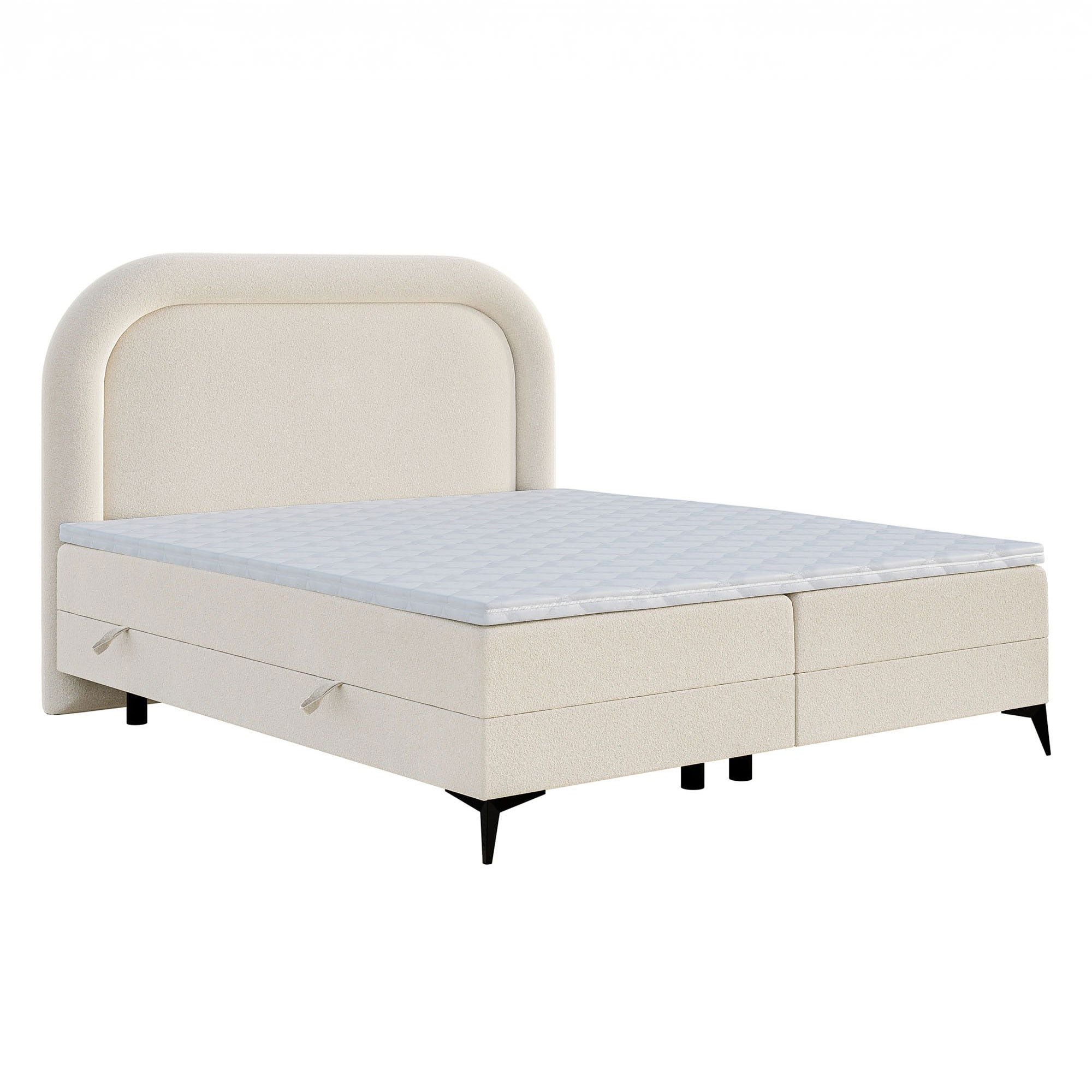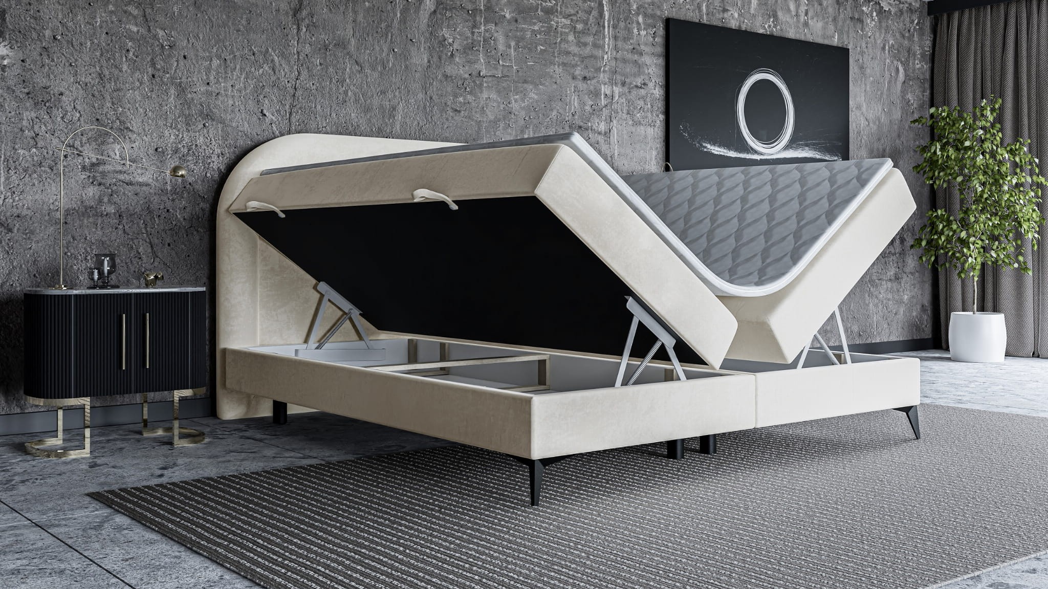 Przytulne łóżko kontynentalne na nóżkach 160x200 MELA pojemnik, topper