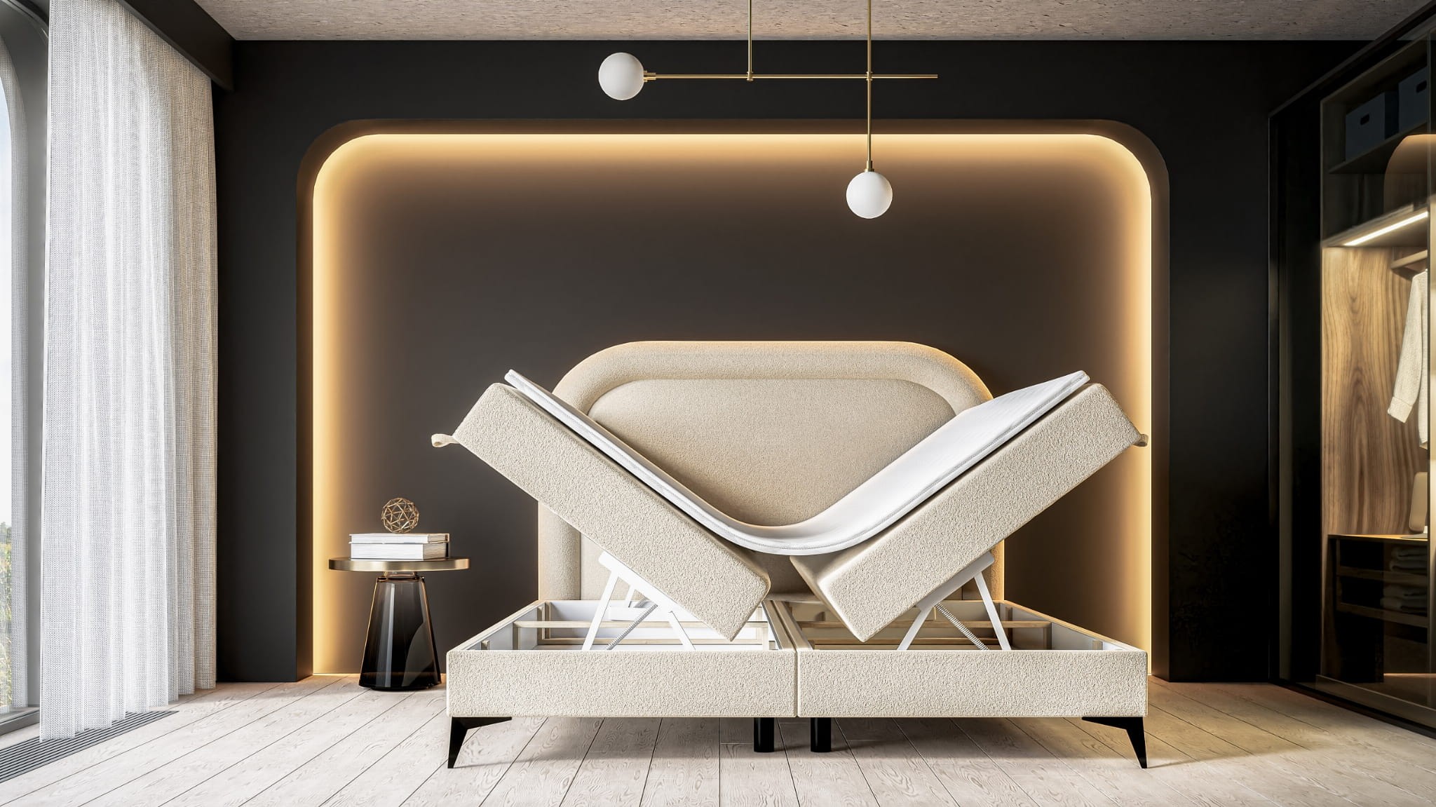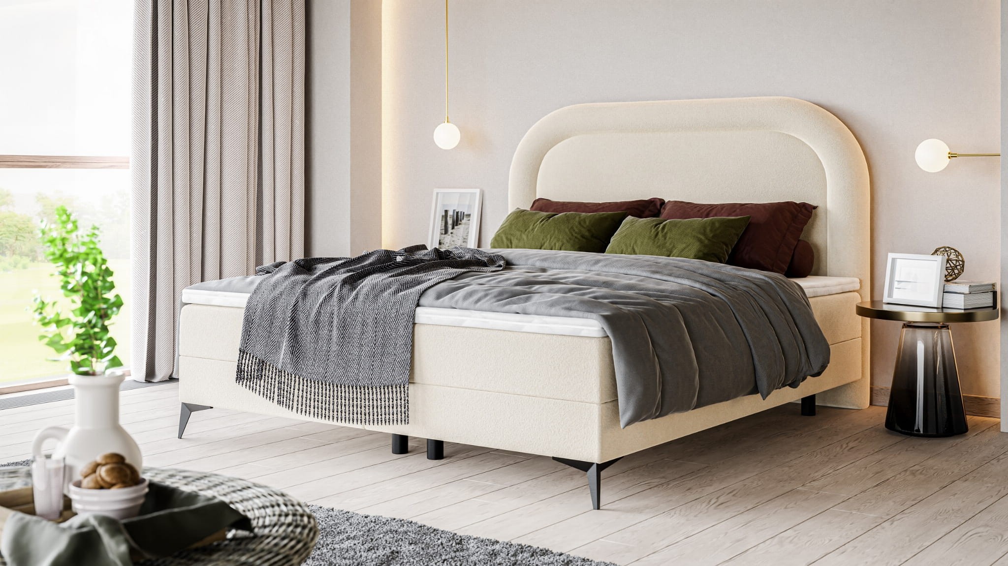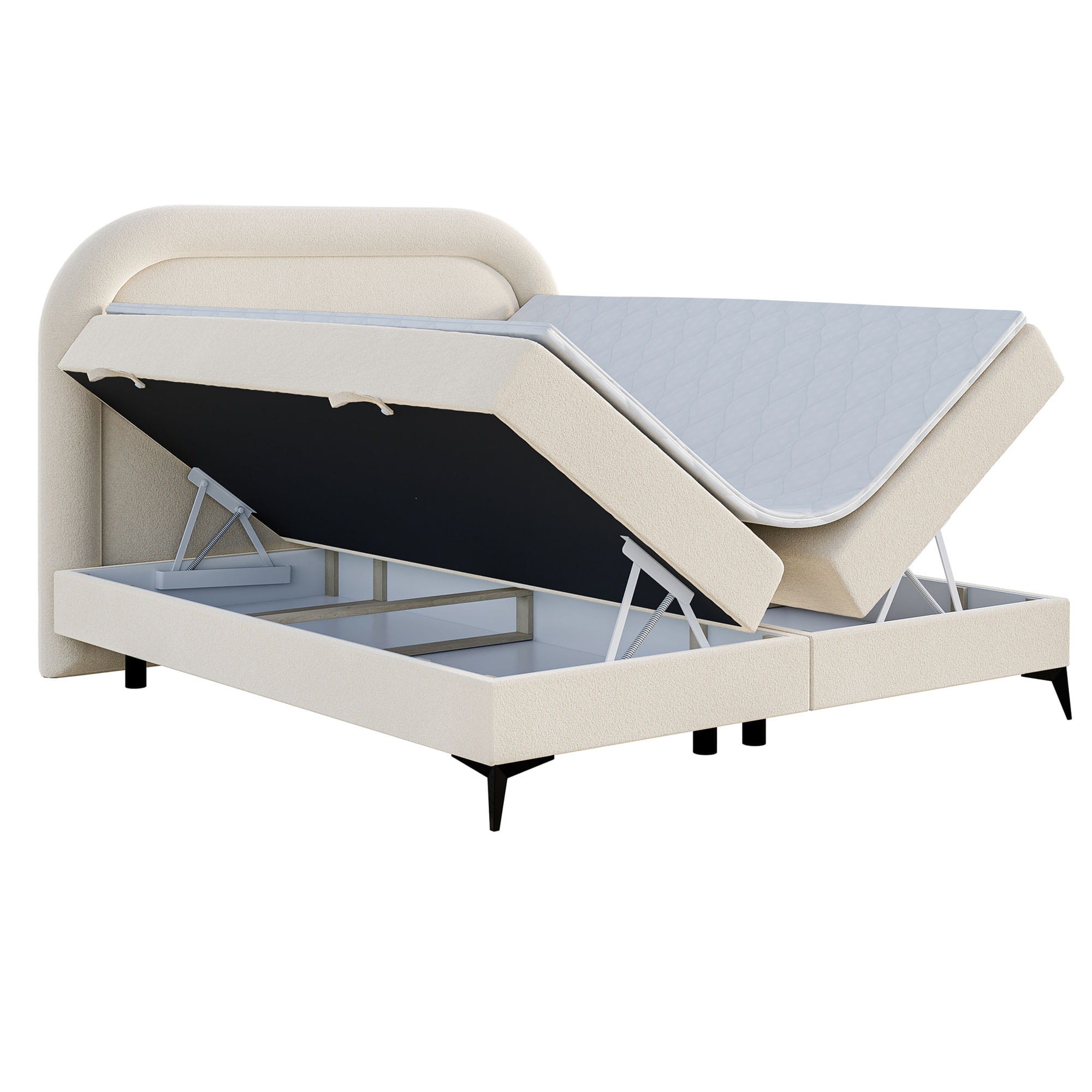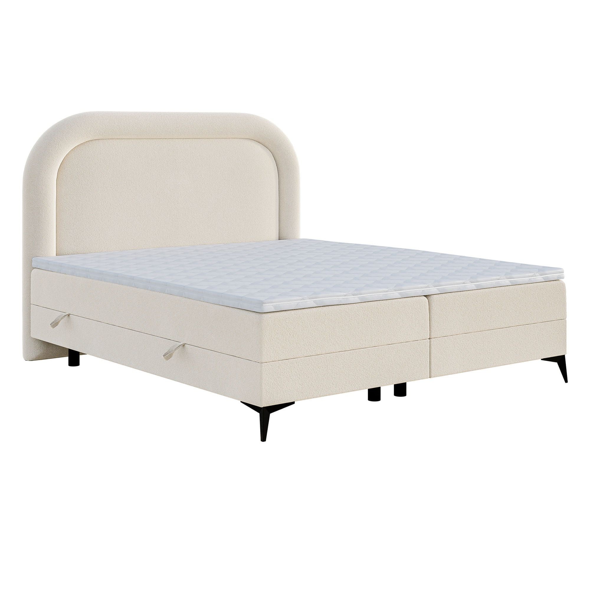 Przytulne łóżko kontynentalne na nóżkach 160x200 MELA pojemnik, topper