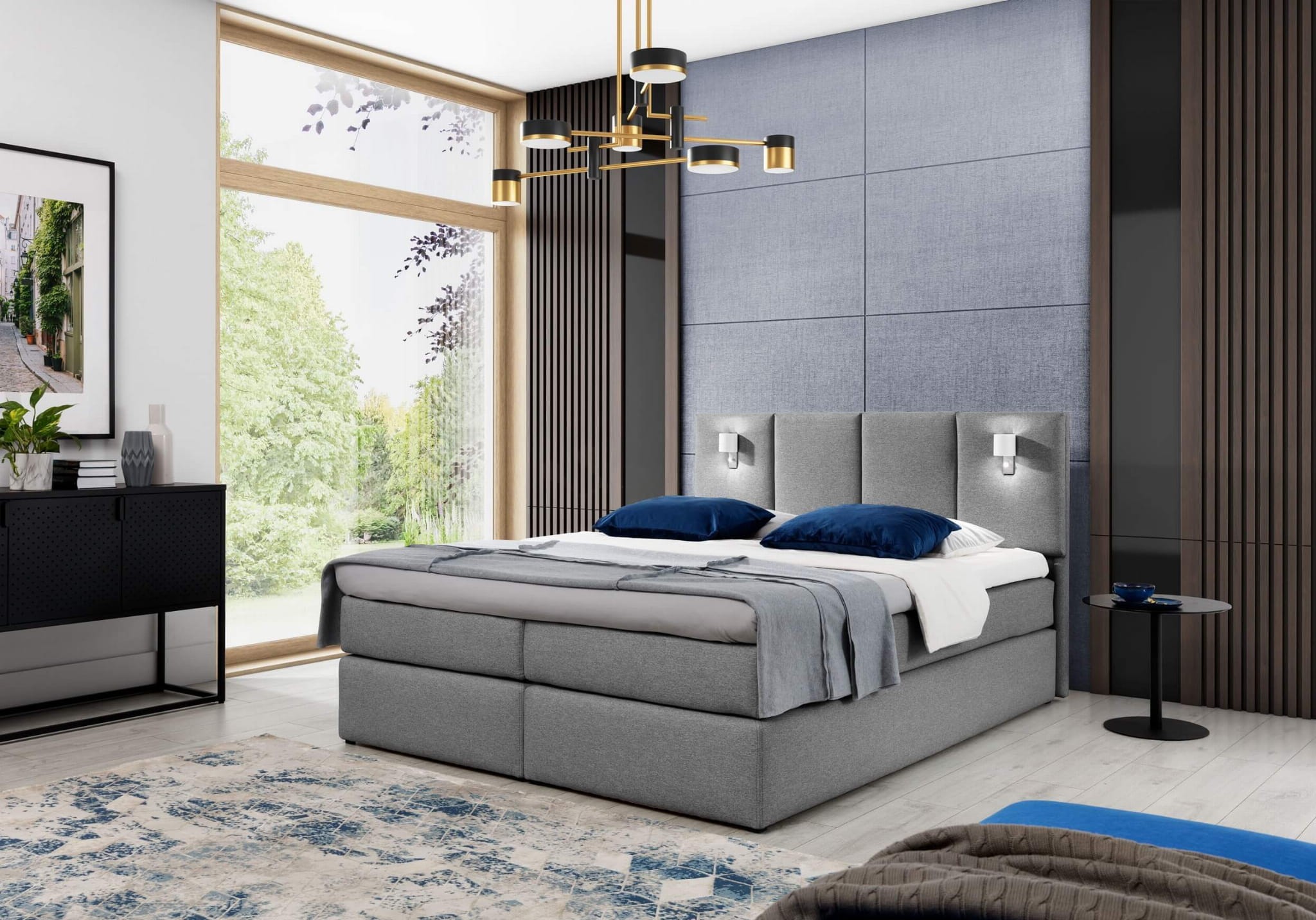 Nowoczesne łóżko kontynentalne ISTRA z wbudowanym oświetleniem i topperem w komplecie to model, który wniesie do Twojego wnętrza wyjątkowy styl i wygodę! Dzięki praktycznym lampkom nocnym zamocowanym w eleganckim wezgłowiu, które sterowane są za pomocą dotyku, jest niezwykle praktyczne i przytulne oraz buduje w sypialni wyjątkowy klimat. Zagłówek o wysokości 103cm sprzyja wypoczynkowi pozwalając wygodnie się oprzeć i poczytać książkę lub obejrzeć film. Pionowe głębokie przeszycia dodają uroku i stają się niebywałym akcentem aranżacji sypialni w niemal każdym stylu. Dodatkowym atutem łóżka jest wielopoziomowa konstrukcja składająca się z głównego materaca ze sprężyn kieszeniowych typu pocket oraz przyjemnego materaca nawierzchniowego dopasowującego się do ciała użytkownika. Brak pojemnika na pościel staje się zaletą dla minimalistów, którzy uwielbiają lekkie i stylowe bryły mebli bez zdobień. Delikatne plastikowe ślizgi tapicerskie zwiększają stabilność i przyczepność łóżka do podłogi, dzięki czemu nie musisz się obawiać o jej uszkodzenia czy zarysowania. Warto pamiętać, że łóżko kontynentalne ISTRIA o powierzchni spania 180x200 produkowane jest na indywidualne zamówienie przez polskich specjalistów, a to oznacza, że cechuje się bardzo solidną formą i starannym wykonaniem, co pozwoli cieszyć się jego wygodą i pięknem przez wiele lat.