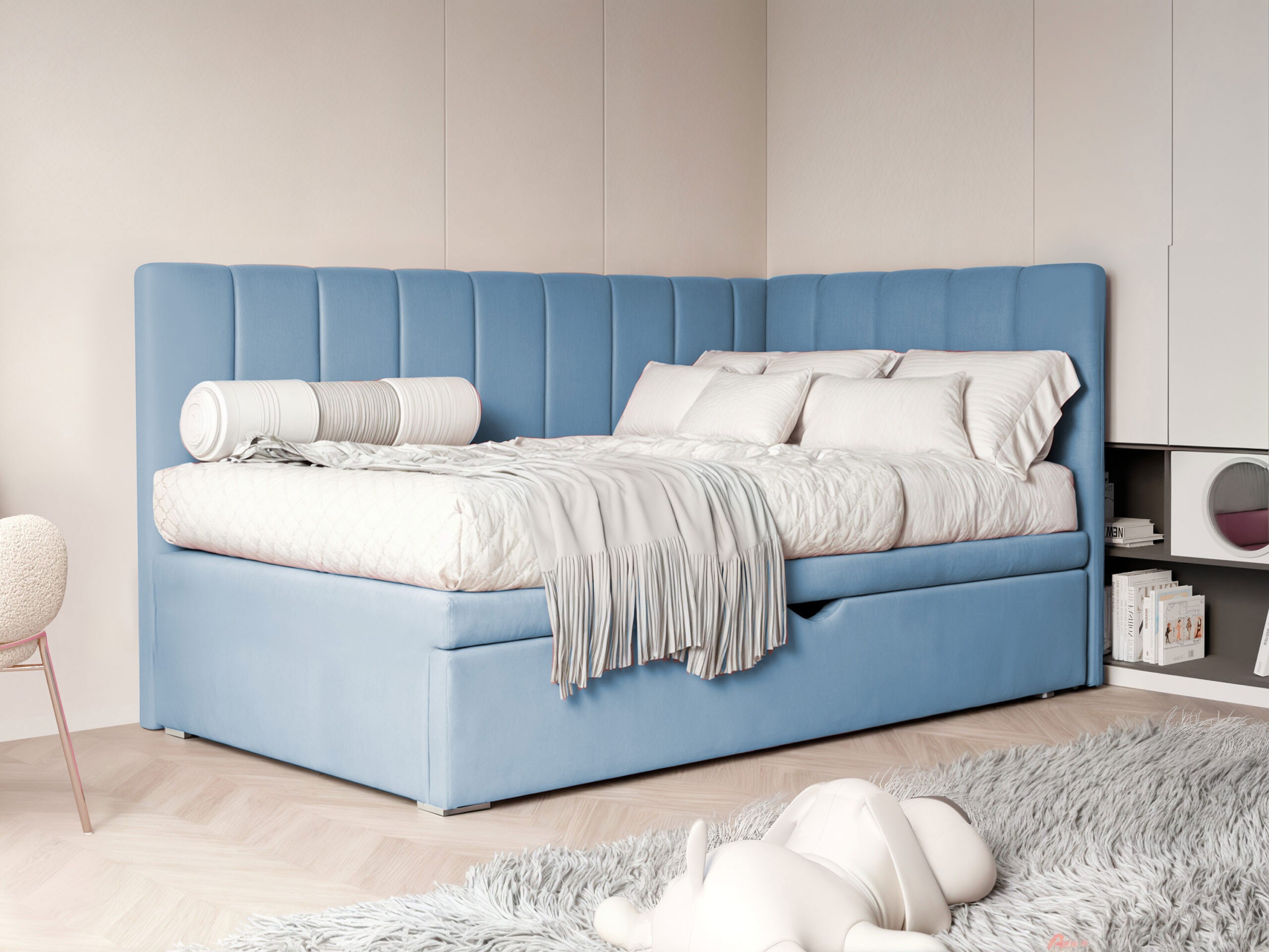 Łóżko młodzieżowe CHASE 120x200 | Kolor do wyboru to stylowe i komfortowe rozwiązanie, które doskonale sprawdzi się zarówno w pokoju dziecka, jak i nastolatka. Dzięki swojej nowoczesnej formie z charakterystycznym, narożnym wezgłowiem tapicerowanym miękką tkaniną, mebel tworzy przytulną strefę relaksu i odpoczynku. To idealne miejsce nie tylko do snu, ale również do codziennego wypoczynku, czytania książek czy spędzania czasu z przyjaciółmi. Wysokie oparcie chroni przed zimną ścianą i otula dziecko, dając mu poczucie bezpieczeństwa i komfortu. Estetyczne pionowe przeszycia nadają łóżku eleganckiego charakteru, podkreślając jego dopracowaną formę. Cała konstrukcja została starannie tapicerowana materiałem, który jest miękki w dotyku, odporny na użytkowanie i jednocześnie łatwy w utrzymaniu czystości. Dzięki temu łóżko CHASE nie tylko pięknie wygląda, ale również zachowuje swoją świeżość przez długi czas. To mebel stworzony z myślą o intensywnym użytkowaniu przez dzieci i młodzież, łączący atrakcyjny wygląd z trwałością i funkcjonalnością. Dużym atutem tego modelu jest pojemna szuflada na pościel, która z łatwością pomieści kołdry, poduszki, a także zabawki czy inne niezbędne rzeczy. Praktyczne rozwiązania idą tu w parze z solidnym wykonaniem – stabilna podstawa wsparta na wytrzymałych listwach drewnianych gwarantuje wygodny i zdrowy sen. Wysokość mebla została dopasowana do potrzeb dzieci i młodzieży, co sprawia, że korzystanie z łóżka jest w pełni komfortowe. Dzięki różnym szerokościom do wyboru, model CHASE 120x200 można idealnie dopasować do wielkości i układu pomieszczenia, nie rezygnując przy tym z przestrzeni i wygody. To uniwersalny wybór do wnętrz urządzonych w różnych stylach – zarówno bardziej stonowanych, jak i kolorowych, dziecięcych aranżacji. Szeroka gama dostępnych kolorów pozwala idealnie dopasować łóżko do charakteru dziecka i wystroju pokoju. Jeśli szukasz łóżka, które łączy wygodę, nowoczesny design i praktyczne rozwiązania, CHASE 120x200 będzie doskonałym wyborem. To mebel, który spełnia oczekiwania zarówno dzieci, jak i rodziców, tworząc piękną i funkcjonalną przestrzeń do snu i codziennego życia.