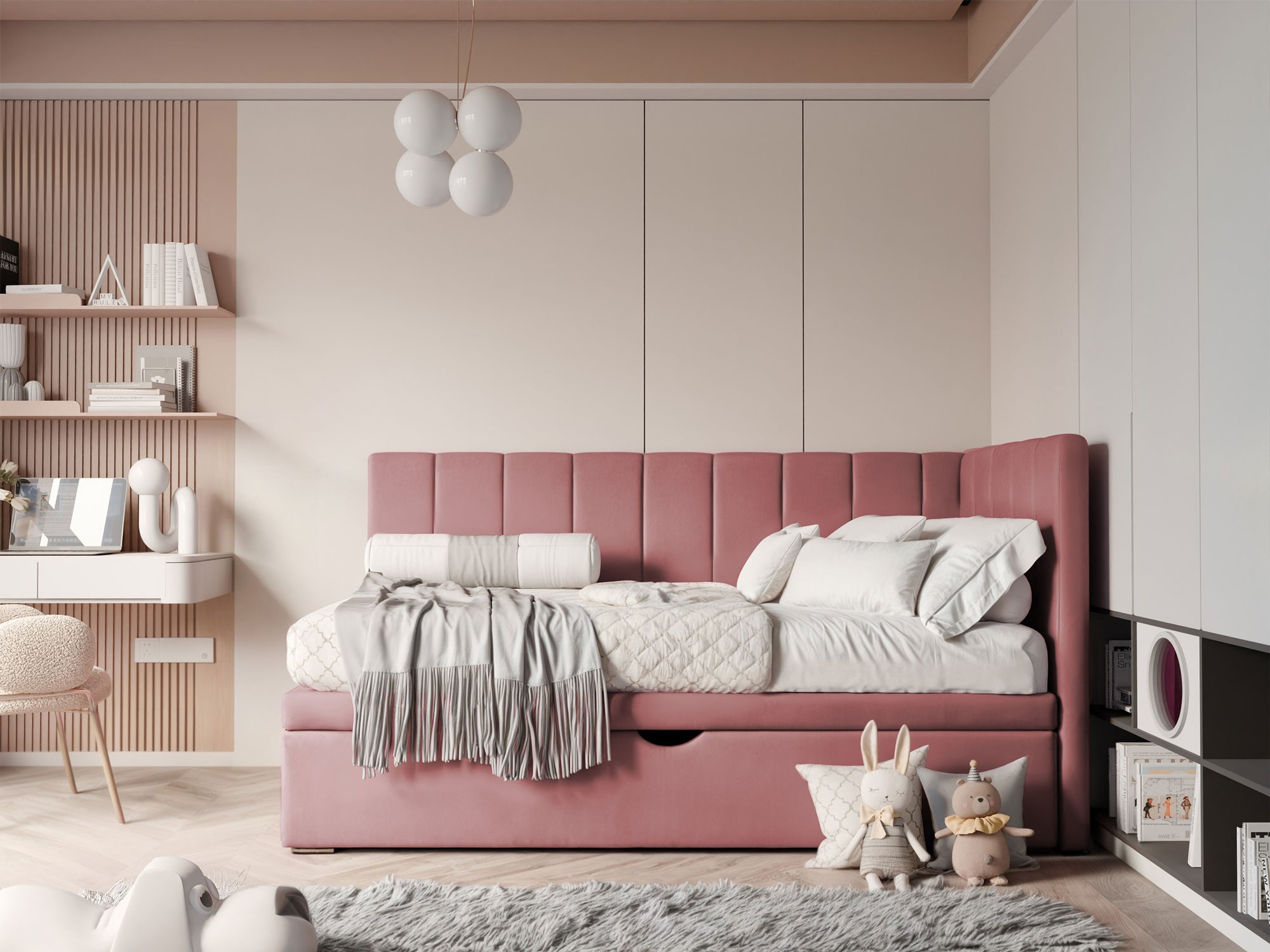 Łóżko młodzieżowe CHASE 80x200 | Kolor do wyboru to wyjątkowe połączenie stylu, wygody i funkcjonalności, które idealnie wpisuje się w potrzeby nowoczesnych aranżacji pokoju dziecięcego i młodzieżowego. Jego charakterystyczna forma z wysokim, miękko tapicerowanym oparciem w narożnej formie nie tylko nadaje wnętrzu przytulnego klimatu, ale przede wszystkim zapewnia komfort oraz poczucie bezpieczeństwa podczas snu, zabawy czy relaksu z książką. Subtelne, pionowe przeszycia nadają konstrukcji elegancki i uporządkowany wygląd, który z łatwością dopasuje się zarówno do dziewczęcej, jak i chłopięcej przestrzeni. Całość została starannie wykończona przyjemną w dotyku, odporną tkaniną, która nie tylko prezentuje się niezwykle estetycznie, ale również jest łatwa w codziennym utrzymaniu czystości. Dzięki przemyślanej konstrukcji, łóżko CHASE prezentuje się efektownie z każdej strony, a jego harmonijna bryła wprowadza do wnętrza spokój i lekkość. Dodatkowym atutem, który doceni każdy rodzic, jest pojemna szuflada na pościel. Umieszczona pod łóżkiem i wyposażona w wygodny uchwyt, stanowi praktyczne miejsce do przechowywania – nie tylko kołdry i poduszek, ale również zabawek czy innych niezbędnych drobiazgów. Stelaż oparty na drewnianych listwach gwarantuje odpowiednią stabilność oraz komfort użytkowania, co przekłada się na zdrowy i spokojny sen dziecka. Optymalna wysokość siedziska sprawia, że łóżko doskonale sprawdzi się zarówno u najmłodszych, jak i nastolatków. Co więcej, możliwość wyboru szerokości sprawia, że mebel z łatwością dopasuje się do każdej wielkości pokoju – niezależnie od tego, czy urządzasz kompaktowy kącik do nauki i wypoczynku, czy przestronny pokój nastolatka. Łóżko CHASE 80x200 to idealny wybór dla rodziców, którzy szukają estetycznego, bezpiecznego i wygodnego rozwiązania do pokoju dziecka. Szeroki wybór kolorów umożliwia pełne dopasowanie do charakteru wnętrza, a dopracowane detale sprawiają, że mebel staje się nie tylko funkcjonalnym wyposażeniem, ale także piękną ozdobą przestrzeni. Wybierz model CHASE i stwórz wyjątkowe miejsce, w którym dziecko będzie czuło się swobodnie, bezpiecznie i komfortowo każdego dnia.