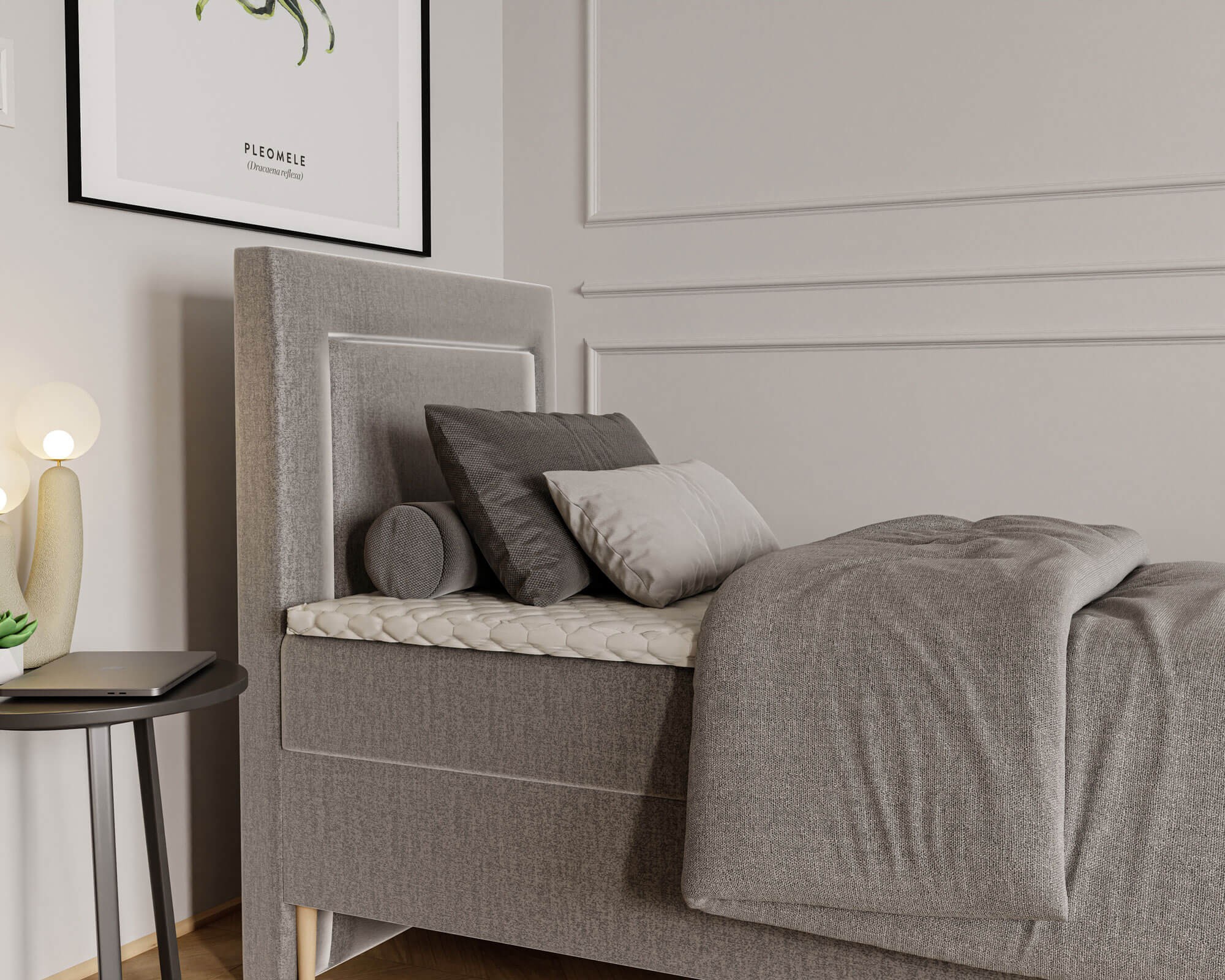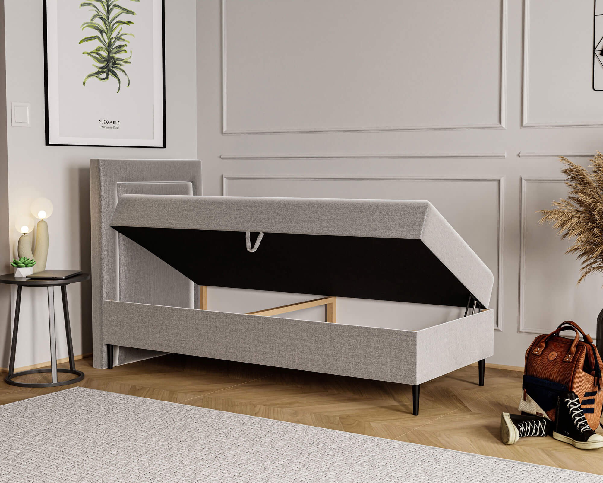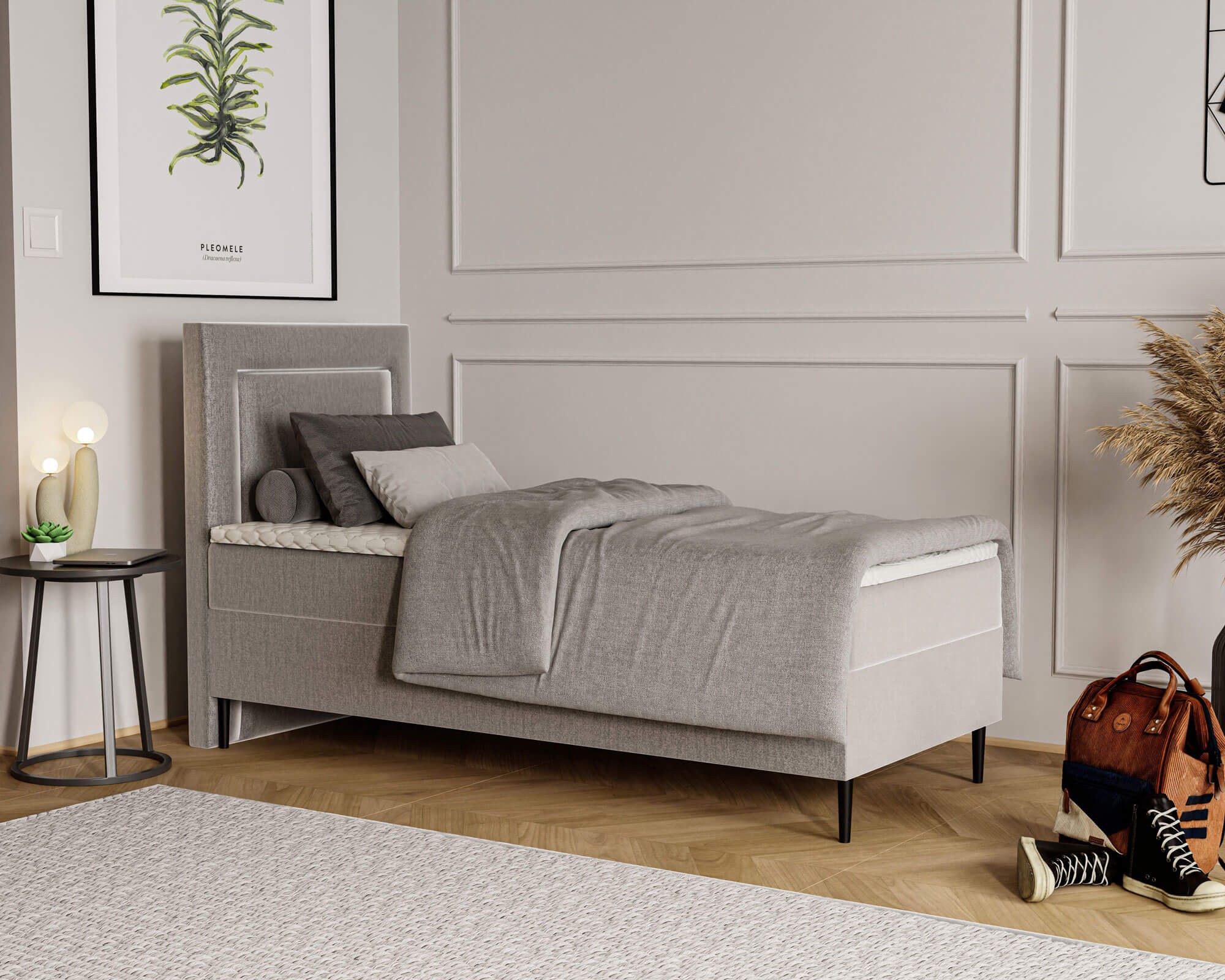 Łóżko młodzieżowe EDDY 80x200 | Kolor do wyboru to elegancki i funkcjonalny mebel, który doskonale wpisuje się w potrzeby nowoczesnych wnętrz. Starannie tapicerowana cała bryła łóżka nadaje mu wyjątkowego charakteru, łącząc estetykę z komfortem użytkowania. Dzięki temu mebel można ustawić w dowolnym miejscu pokoju, gdzie stanie się centralnym punktem aranżacji. Wysokie wezgłowie z dekoracyjnym przeszyciem nie tylko podkreśla jego stylowy wygląd, ale także zapewnia wygodne oparcie podczas czytania, nauki czy relaksu, tworząc przytulną atmosferę w pokoju młodzieżowym. Model EDDY wyróżnia się solidną konstrukcją wykonaną z trwałych materiałów, które gwarantują stabilność i długowieczność użytkowania. Dzięki bezpiecznym, zaokrąglonym krawędziom łóżko jest odpowiednie również dla młodszych użytkowników, minimalizując ryzyko przypadkowych urazów. Dużym atutem jest pojemny schowek pod materacem, w którym bez trudu zmieści się pościel, koce, ubrania sezonowe lub inne akcesoria, co pomaga utrzymać porządek w pomieszczeniu. Mechanizm wspomagający otwieranie sprawia, że dostęp do pojemnika jest szybki i niezwykle łatwy, co czyni ten model jeszcze bardziej praktycznym. Łóżko młodzieżowe EDDY 80x200 zostało osadzone na stabilnej podstawie z wysokimi nóżkami, które nadają mu lekkości oraz ułatwiają sprzątanie pod meblem. Tapicerka zastosowana w tym modelu jest przyjemna w dotyku, odporna na codzienne użytkowanie i łatwa do utrzymania w czystości, dzięki czemu łóżko przez lata zachowa swój elegancki wygląd. Uniwersalny design łóżka EDDY sprawia, że pasuje ono zarówno do nowoczesnych, jak i bardziej klasycznych aranżacji wnętrz. Możliwość wyboru koloru tapicerki pozwala idealnie dopasować je do charakteru pokoju, czyniąc z niego nie tylko wygodne miejsce do spania, ale także elegancki element dekoracyjny. Wybierając łóżko młodzieżowe EDDY, stawiasz na ponadczasowy styl, funkcjonalność i jakość, która zapewni komfort i piękny wygląd wnętrza przez wiele lat.