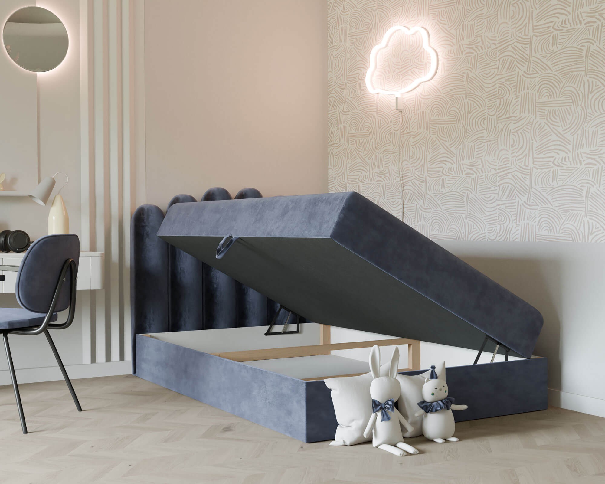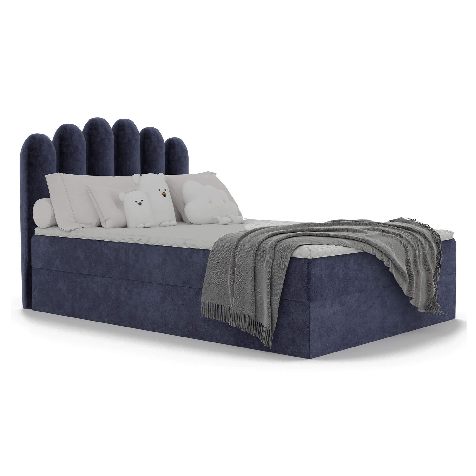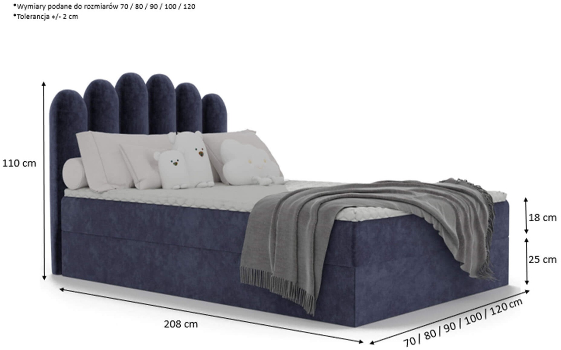 Łóżko młodzieżowe HOLI 80x200 | Kolor do wyboru to elegancki i niezwykle funkcjonalny mebel, który wprowadzi do pokoju młodzieżowego nutę nowoczesnego designu i wyjątkowego stylu. Cała bryła łóżka została starannie tapicerowana, co nadaje mu szykownego charakteru oraz sprawia, że można je ustawić w dowolnym miejscu pomieszczenia, gdzie będzie pełniło rolę centralnego elementu wystroju. Wysokie, oryginalne wezgłowie z zaokrąglonymi panelami stanowi nie tylko ciekawy detal wizualny, ale także zapewnia wygodne i stabilne oparcie podczas odpoczynku, czytania lub nauki, tworząc atmosferę pełną komfortu i przytulności. Model HOLI wyróżnia się solidną konstrukcją wykonaną z trwałych materiałów, które gwarantują stabilność i długowieczność użytkowania. Dla jeszcze większej funkcjonalności łóżko wyposażono w pojemny schowek pod materacem – idealne miejsce na pościel, koce, zabawki czy inne akcesoria, które dzięki temu zawsze będą miały swoje miejsce. Mechanizm wspomagający otwieranie sprawia, że dostęp do pojemnika jest szybki i wygodny, co znacząco ułatwia codzienne użytkowanie. Bezpieczne, zaokrąglone krawędzie mebla dodatkowo chronią przed przypadkowymi urazami, co jest szczególnie ważne w pokoju młodzieżowym. Łóżko młodzieżowe HOLI 80x200 osadzone jest na stabilnej, masywnej podstawie, co zapewnia bezpieczeństwo i wygodę podczas snu. Tapicerka wykonana z wysokiej jakości tkaniny jest przyjemna w dotyku, odporna na codzienne użytkowanie i łatwa w utrzymaniu czystości, dzięki czemu mebel na długo zachowa swój estetyczny wygląd. Uniwersalny, efektowny design łóżka HOLI sprawia, że doskonale komponuje się ono zarówno z nowoczesnymi, jak i bardziej klasycznymi aranżacjami wnętrz. Możliwość wyboru koloru tapicerki pozwala idealnie dopasować łóżko do stylu pokoju, czyniąc je nie tylko komfortowym miejscem do spania, ale także wyjątkową ozdobą wnętrza. Wybierając łóżko młodzieżowe HOLI, stawiasz na funkcjonalność, trwałość i ponadczasowy styl, który będzie cieszył przez wiele lat.