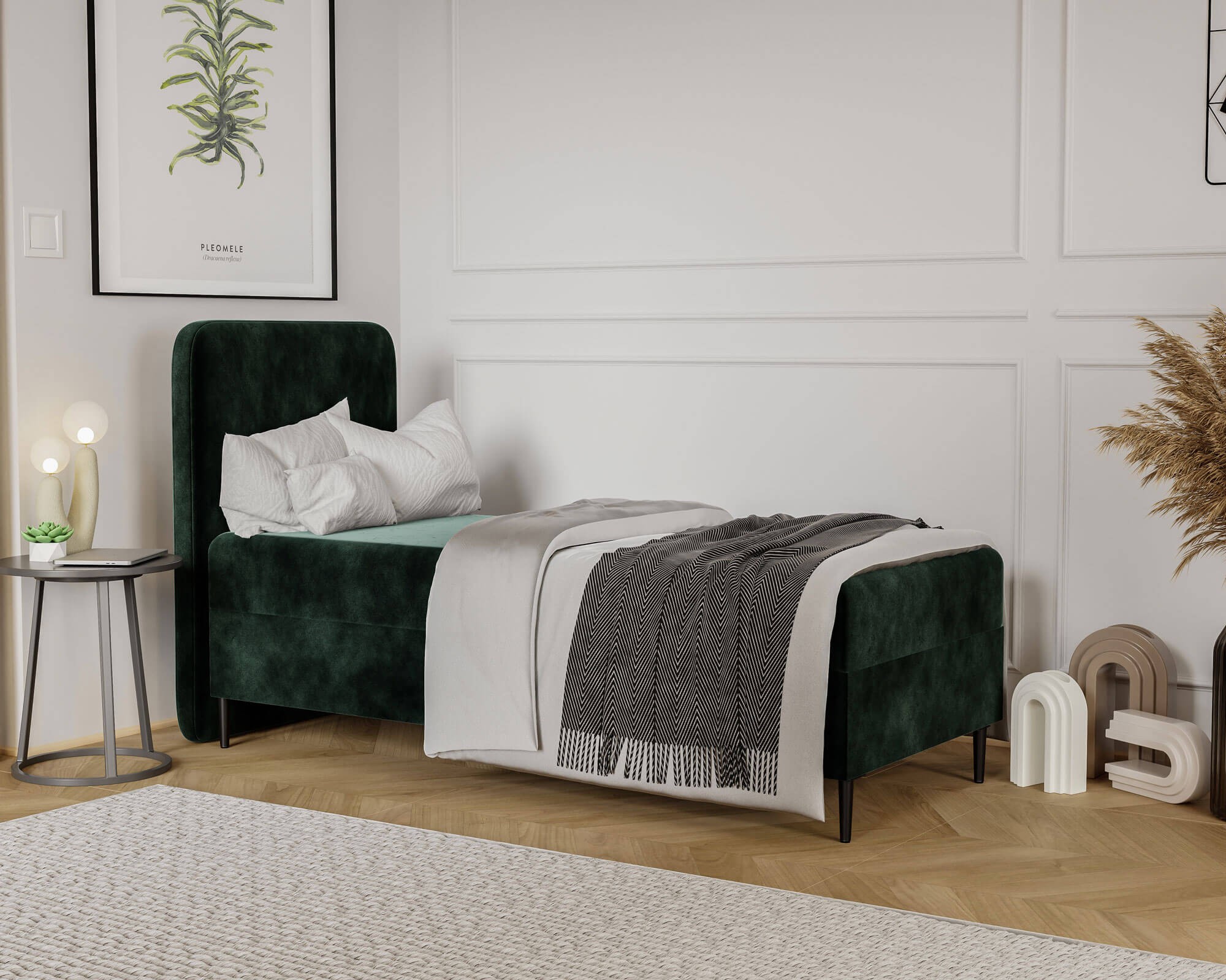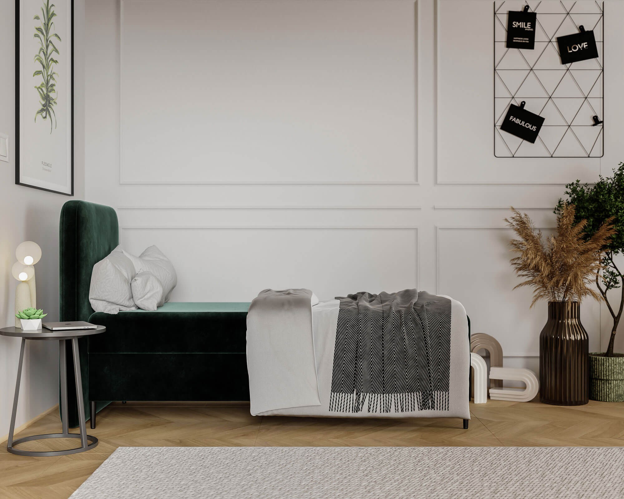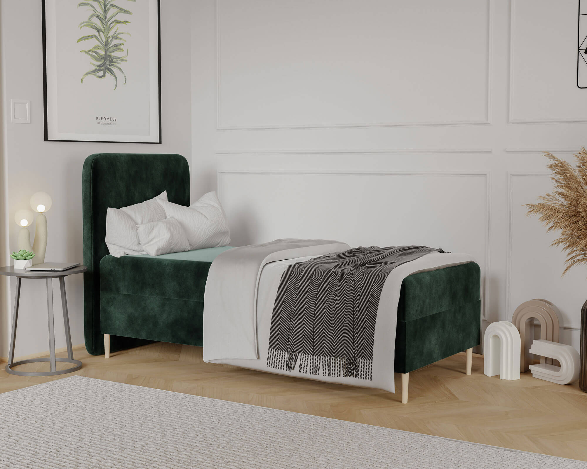 Łóżko młodzieżowe LAMA 90x200 to elegancki i funkcjonalny mebel, który idealnie łączy nowoczesny design z praktycznymi rozwiązaniami. Starannie tapicerowana cała bryła nadaje mu wyjątkowo stylowy charakter, który doskonale wpasuje się w różnorodne aranżacje wnętrz. Wysokie, zaokrąglone wezgłowie przyciąga wzrok swoją subtelną formą i jednocześnie zapewnia wygodne oparcie podczas czytania, nauki czy wieczornego odpoczynku. Dzięki swojej solidnej konstrukcji opartej na trwałych materiałach łóżko gwarantuje stabilność i niezawodność na lata, czyniąc je inwestycją w codzienny komfort. Model LAMA 90x200 został zaprojektowany tak, aby sprostać wszystkim wymaganiom młodzieżowego pokoju. Pojemny schowek pod materacem to doskonałe miejsce do przechowywania pościeli, koców czy innych niezbędnych akcesoriów, a zastosowany mechanizm wspomagający otwieranie sprawia, że dostęp do niego jest niezwykle prosty i wygodny. Zaokrąglone krawędzie mebla zwiększają bezpieczeństwo użytkowania, minimalizując ryzyko przypadkowych urazów, a masywna podstawa zapewnia pełną stabilność nawet podczas intensywnego użytkowania. Łóżko LAMA 90x200 zostało wykończone łatwą w czyszczeniu tkaniną obiciową, która jest odporna na codzienne użytkowanie, dzięki czemu przez długi czas zachowuje swój nienaganny wygląd. Uniwersalny design i możliwość wyboru koloru sprawiają, że mebel można idealnie dopasować do wystroju wnętrza, tworząc przytulną i spójną przestrzeń. To łóżko młodzieżowe to nie tylko praktyczne miejsce do snu, ale także elegancki element dekoracyjny, który doda wnętrzu wyjątkowego charakteru. Wybierając LAMA 90x200, inwestujesz w styl, trwałość i wygodę, które każdego dnia będą wpływać na komfort użytkowania i estetykę pokoju.