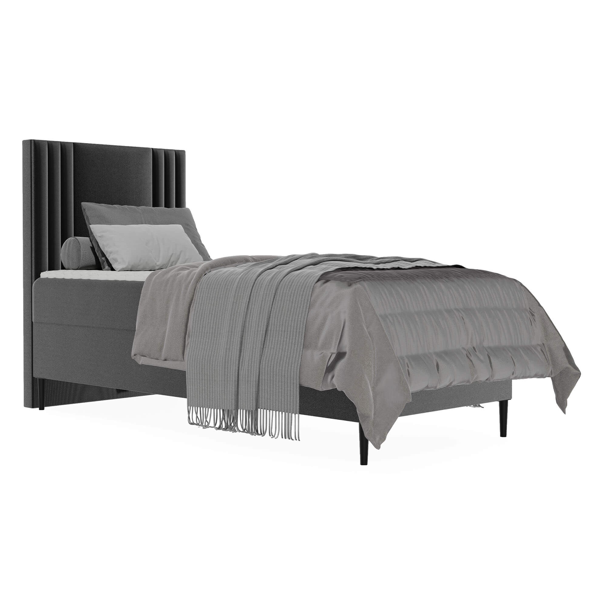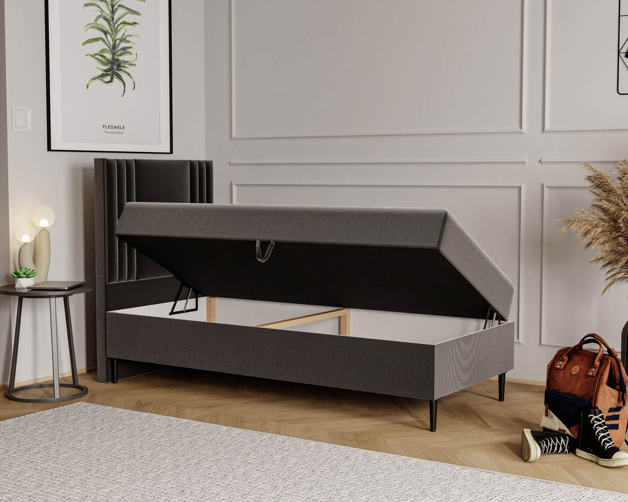 Łóżko młodzieżowe LILO 100x200 to połączenie wyjątkowego stylu, komfortu i praktyczności, które doskonale odnajduje się w nowoczesnych wnętrzach młodzieżowych. Starannie tapicerowana bryła mebla zachwyca elegancją i nowoczesnym wykończeniem, a wysokie, dekoracyjne wezgłowie z pionowymi przeszyciami nadaje łóżku niepowtarzalny charakter i staje się stylowym akcentem w każdej aranżacji. Model LILO to nie tylko estetyka, ale również wysoka funkcjonalność, która spełnia oczekiwania wymagających użytkowników. Solidna konstrukcja łóżka gwarantuje stabilność i trwałość przez długie lata użytkowania, zapewniając codzienny komfort i bezpieczeństwo. Wbudowany schowek pod materacem to doskonałe rozwiązanie do przechowywania pościeli, koców i innych akcesoriów, które zawsze warto mieć pod ręką. Dzięki mechanizmowi wspomagającemu otwieranie, dostęp do pojemnika jest łatwy i wygodny. Projektując łóżko LILO zadbano także o bezpieczeństwo – zaokrąglone krawędzie minimalizują ryzyko urazów, co czyni mebel idealnym wyborem do pokoju młodzieżowego. Model został osadzony na wysokich, smukłych nóżkach, które nadają mu lekkości wizualnej i ułatwiają utrzymanie porządku. Całość dopełnia tkanina obiciowa odporna na codzienne użytkowanie i wyjątkowo łatwa w pielęgnacji, co sprawia, że łóżko prezentuje się świetnie nawet przy intensywnej eksploatacji. Uniwersalna forma i szeroki wybór kolorów pozwalają na pełne dopasowanie mebla do indywidualnych preferencji oraz stylistyki wnętrza. Łóżko młodzieżowe LILO 100x200 to idealne rozwiązanie dla tych, którzy szukają mebla łączącego nowoczesny design z codzienną wygodą i praktycznym zastosowaniem. To więcej niż tylko miejsce do spania – to wyrazisty element wystroju, który wnosi do pokoju przytulność, porządek i styl.