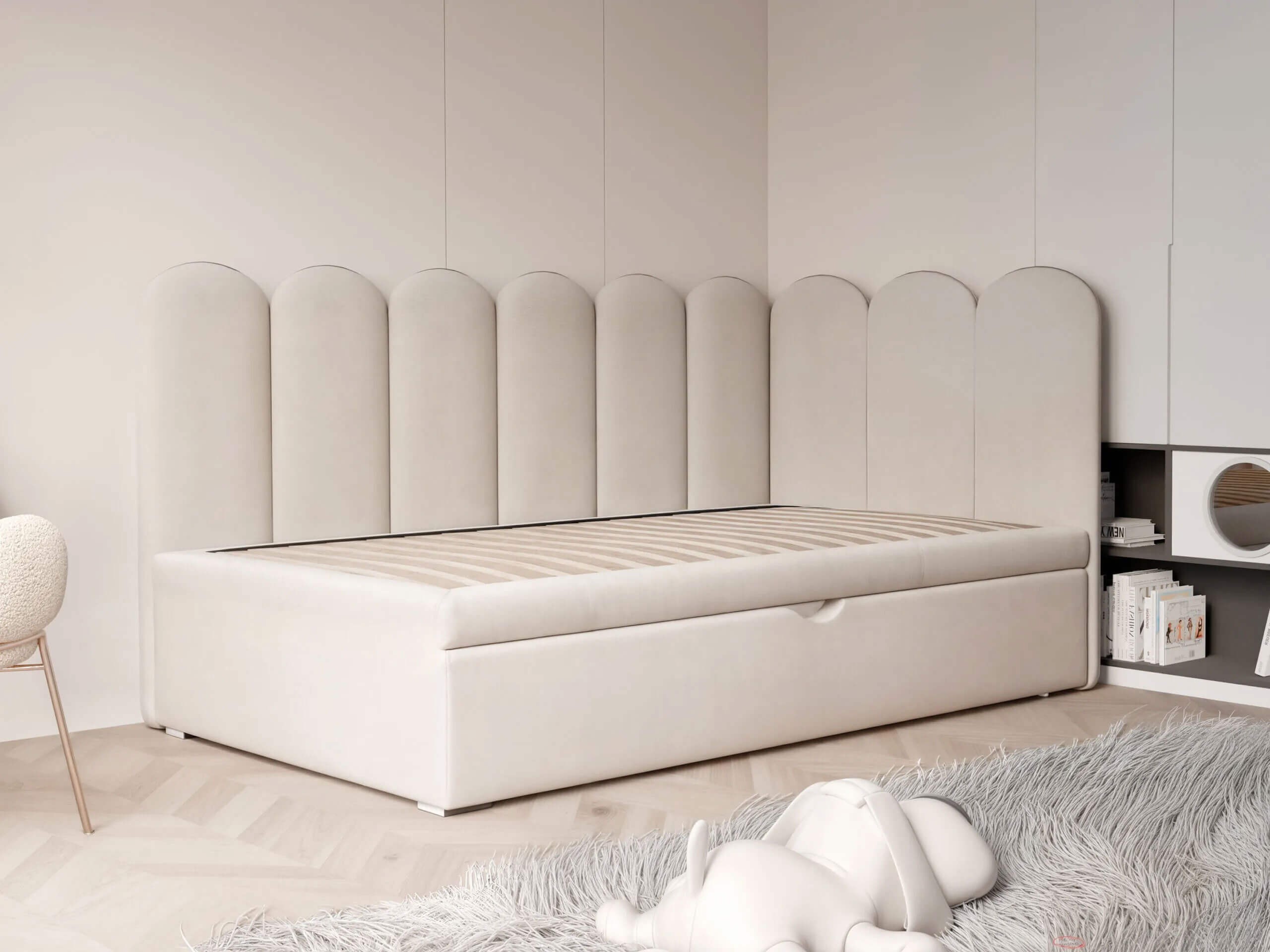 Łóżko młodzieżowe SKYE 90x200 to połączenie nowoczesnego designu, funkcjonalności i wyjątkowego komfortu, które idealnie wpisuje się w potrzeby zarówno dziecięcych, jak i młodzieżowych przestrzeni. Tapicerowane wezgłowie w kształcie muszli przyciąga uwagę elegancką formą, tworząc przytulny i przyjemny klimat w pokoju. Wysokie, miękkie oparcie nie tylko zdobi wnętrze, ale przede wszystkim zapewnia wygodne podparcie podczas czytania, relaksu czy zabawy, sprzyjając codziennemu wypoczynkowi. Cała konstrukcja została starannie obita przyjemną w dotyku, welurową tkaniną, która nie tylko nadaje meblowi wyjątkowego szyku, ale też jest łatwa w utrzymaniu czystości i bezpieczna dla najmłodszych. Łóżko SKYE wyróżnia się przemyślaną konstrukcją – wyposażone zostało w praktyczną, pojemną szufladę z wygodnym uchwytem, idealną do przechowywania pościeli, zabawek czy sezonowych tekstyliów. Dzięki zastosowaniu elastycznych listew w stelażu, łóżko gwarantuje odpowiednie podparcie oraz trwałość na lata. Jego zwarta i stabilna bryła pozwala na optymalne zagospodarowanie nawet mniejszych przestrzeni, a lekka wizualnie forma świetnie odnajduje się w nowoczesnych aranżacjach. Model dostępny jest w szerokiej gamie kolorystycznej, co umożliwia idealne dopasowanie do indywidualnych preferencji oraz wystroju pokoju – zarówno w wersji dziewczęcej, jak i chłopięcej. Łóżko młodzieżowe SKYE 90x200 to nie tylko piękny element dekoracyjny, ale przede wszystkim komfortowe i funkcjonalne miejsce codziennego wypoczynku, które zachwyci zarówno dzieci, jak i rodziców.