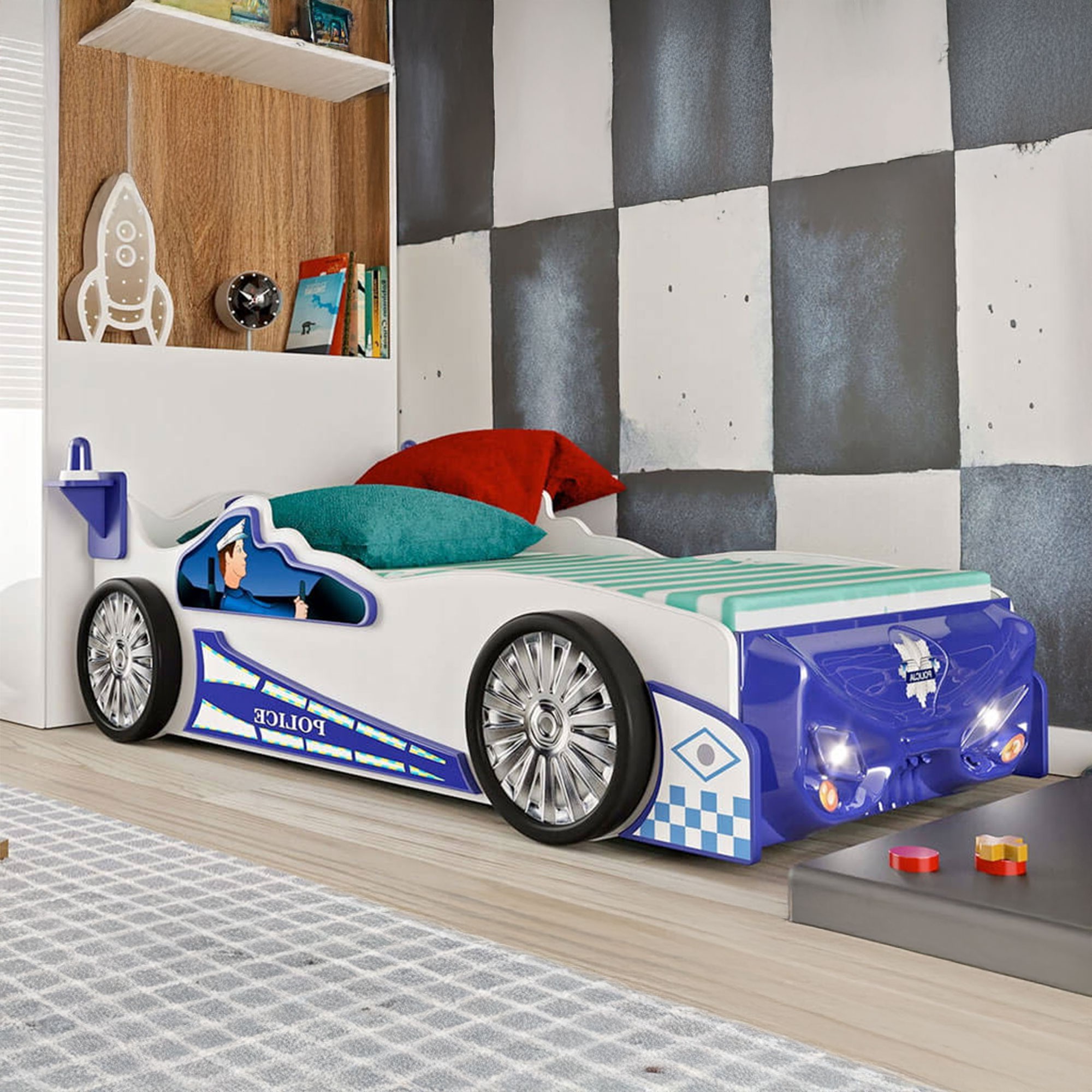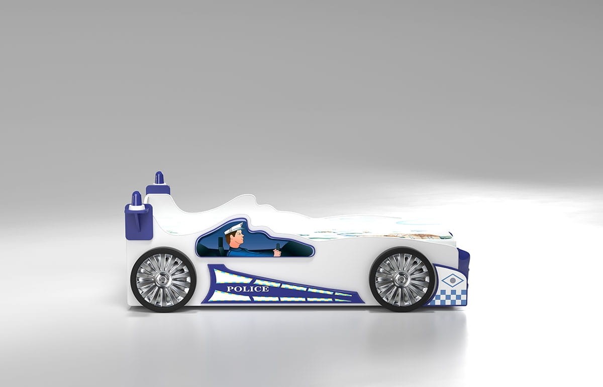 Unikalny, realistyczny design w formie policyjnego radiowozu przeniesie każdego małego entuzjastę w świat przygód i akcji. Wyjątkowa konstrukcja zachwyca dopracowanymi detalami - każde koło wygląda jak prawdziwe, a dwa koguty na dachu podkreślają autentyczność projektu. Co więcej, działające przednie światła LED to nie tylko funkcjonalne lampki nocne, ale także element, który pobudza dziecięcą wyobraźnię, tworząc niezapomniane wrażenia podczas wieczornej zabawy. Dzięki temu łóżko nie tylko pełni funkcję miejsca do wypoczynku, ale też staje się centrum zabawy w pokoju dziecka, czyniąc każde zasypianie przyjemnością. Łóżko dziecięce w kształcie samochodu POLICE to wymarzone rozwiązanie dla małych fanów motoryzacji i przygód! Z solidnym materacem zapewnia komfortowy sen, a jego wyjątkowy design z pewnością przyciągnie uwagę i ożywi pokój malucha. Idealne połączenie funkcjonalności i zabawy!