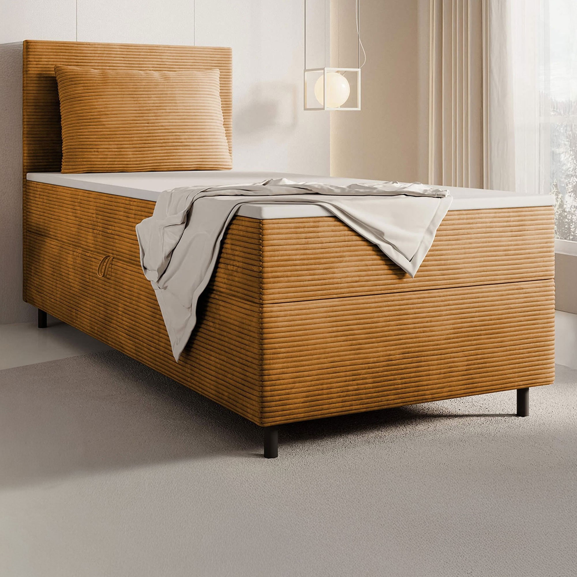 • Przytulny zagłówek i rama otulone tkaniną sztruksową POSO