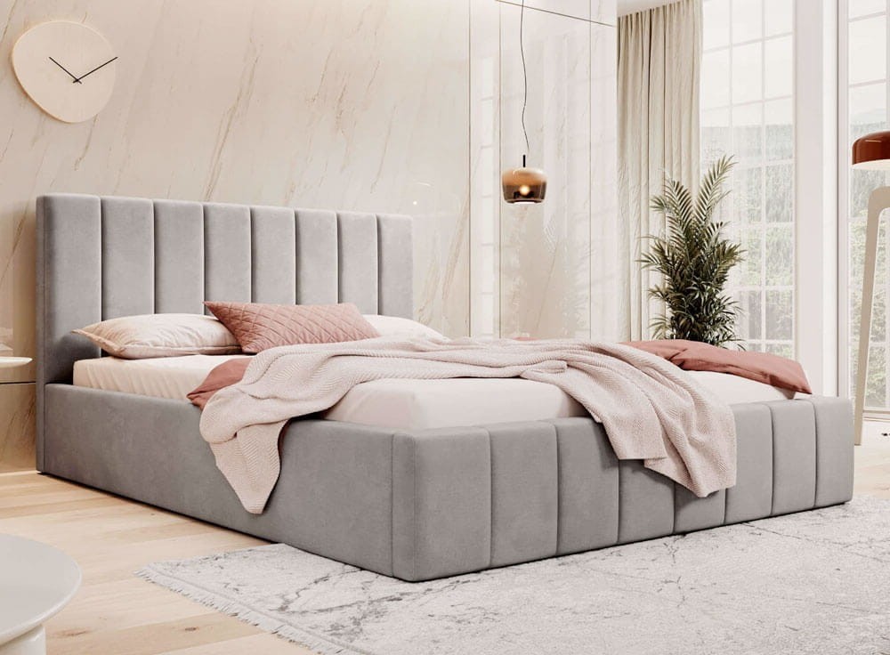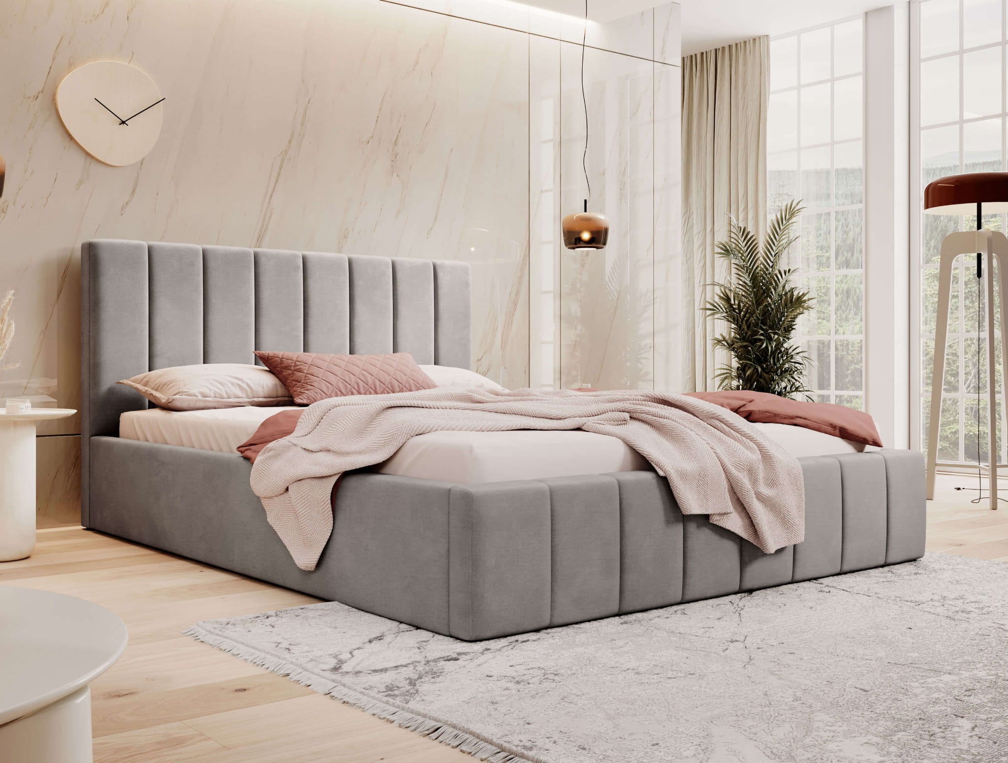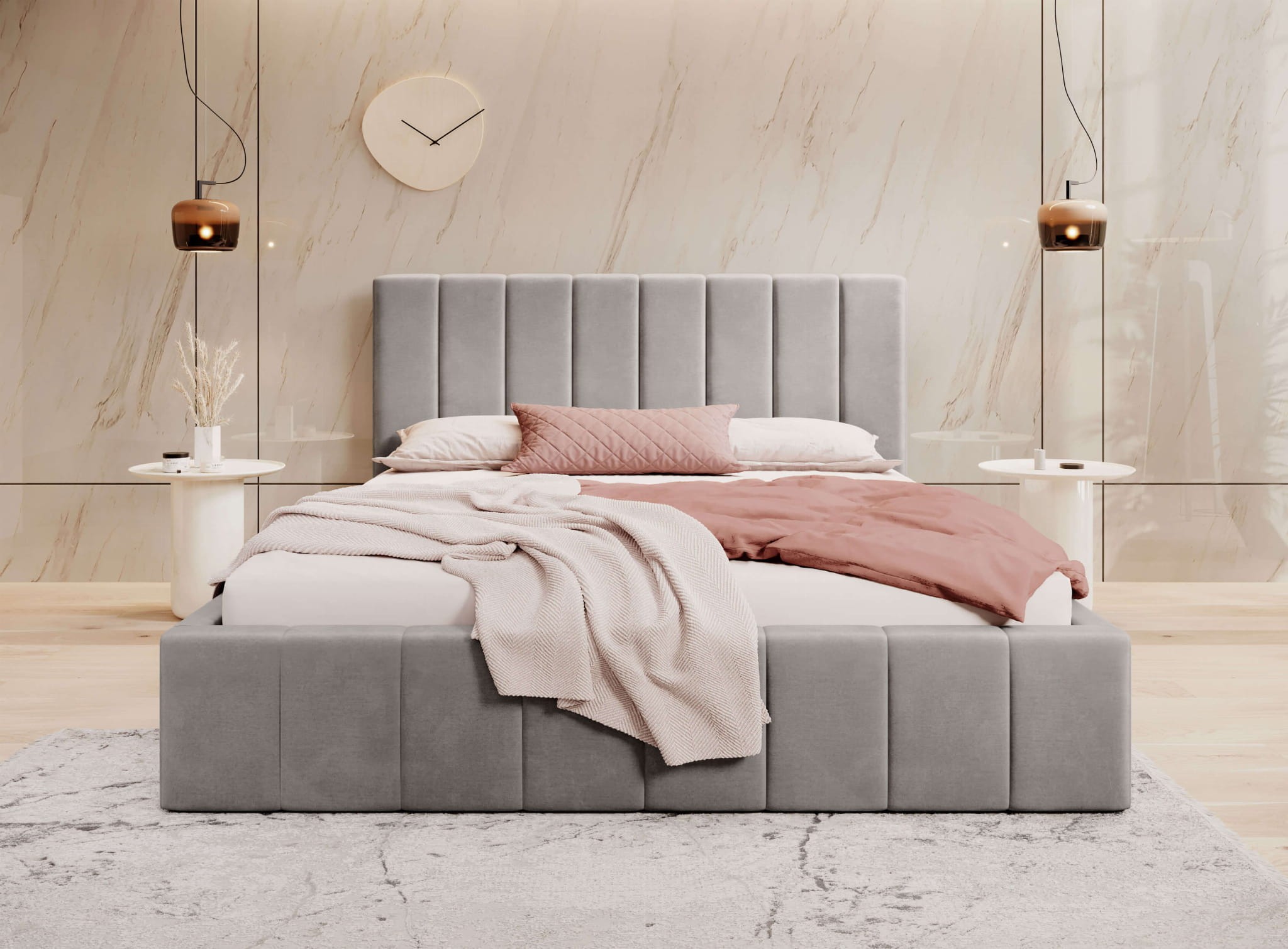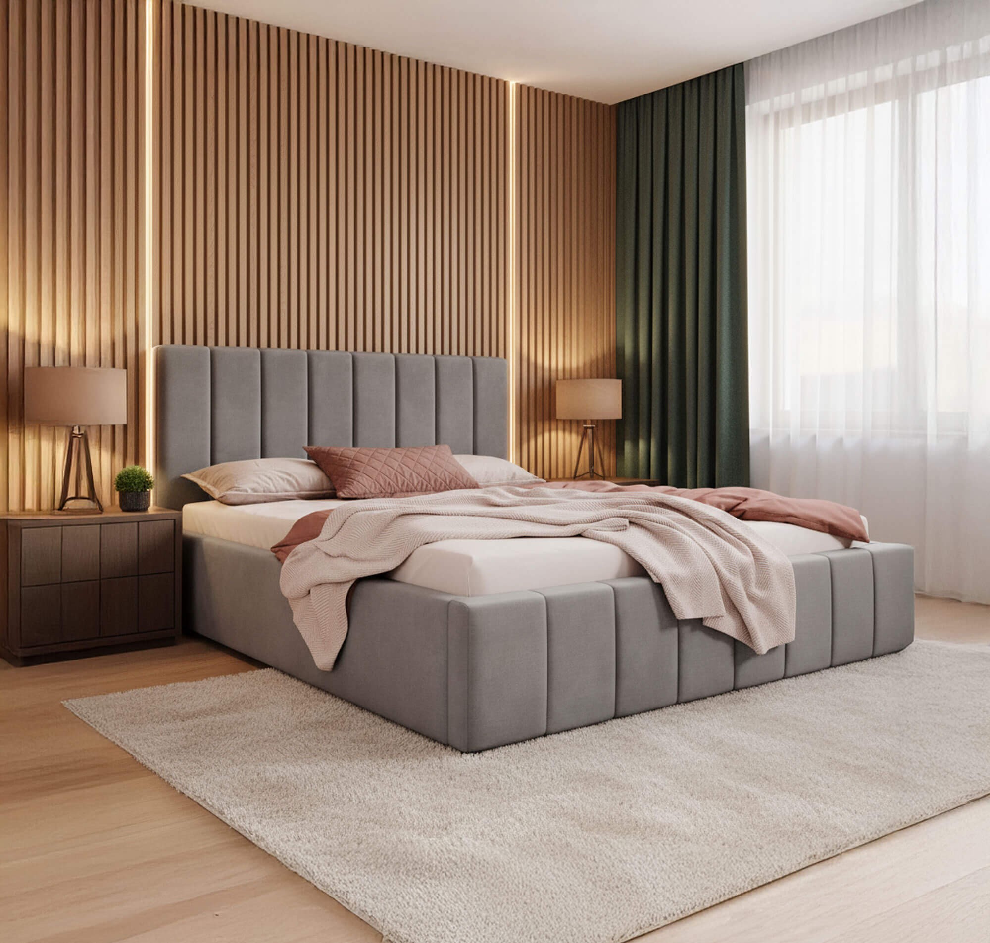 Łóżko SF1069 od MebliMWM łączy nowoczesny design z jakością wykonania, co sprawia, że staje się idealnym wyborem dla każdego, kto ceni sobie estetykę i trwałość w sypialnianych aranżacjach. To łóżko nie tylko wpisuje się w najnowsze trendy, ale też gwarantuje długotrwałe użytkowanie dzięki solidnym materiałom, z których zostało stworzone. Aksamitny welur w szarym kolorze dodaje elegancji i przytulności, a nowoczesny design konstrukcji przyciąga uwagę połączeniem klasyki ze współczesnym stylem.